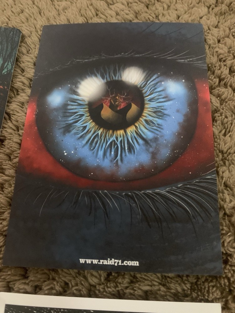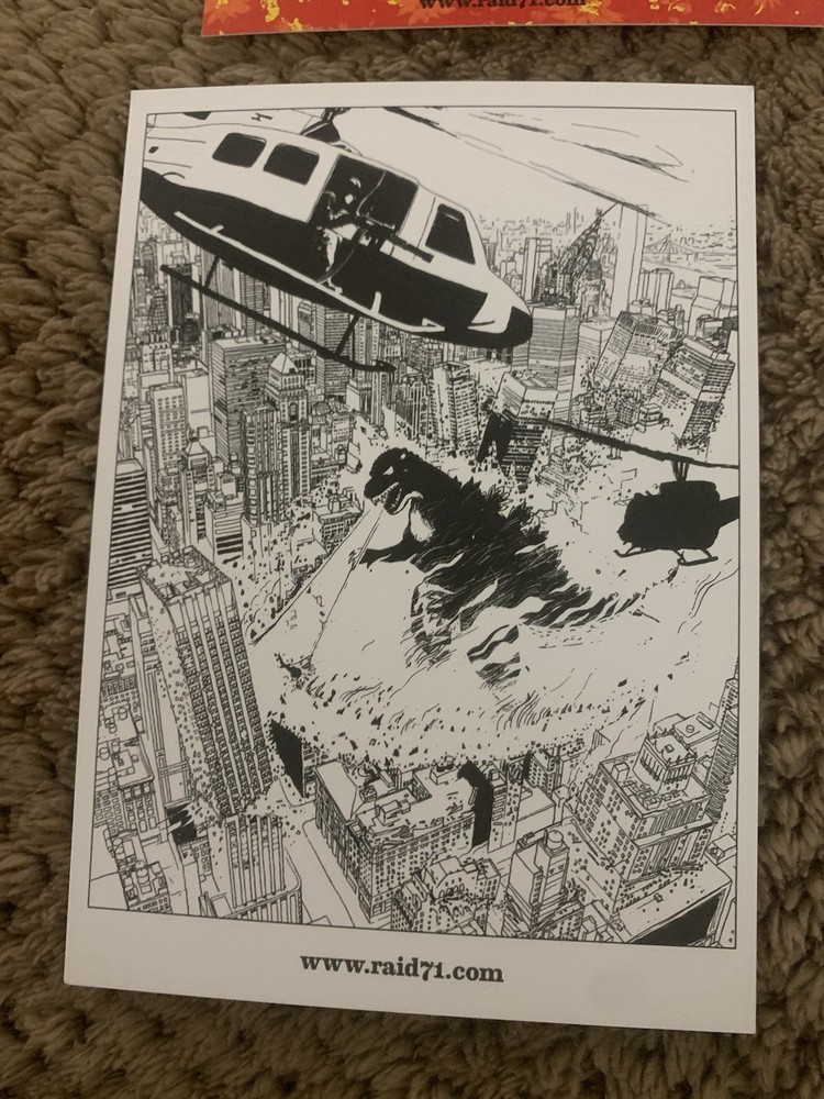 The product is a set of four 4 x 6 inch art cards featuring artwork by the artist Raid71. Each card showcases a different design inspired by Godzilla, falling under the theme of art and pop art style. The prints are created on sticker print surfaces, making them a unique and collectible item for fans of both art and the iconic monster character. Perfect for adding a touch of pop culture and artistic flair to any space or collection.