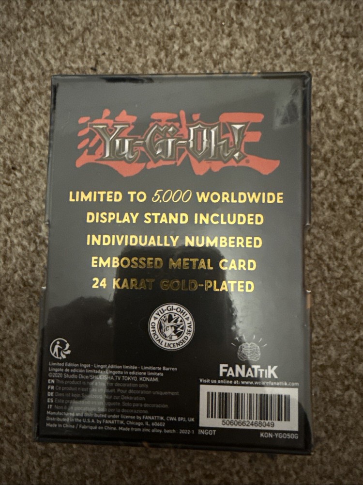 This is a new sealed Yu-Gi-Oh! trading card featuring the Red Eyes Black Dragon design, plated in 24 karat gold. It is a limited edition card from the Yugi set, manufactured by Dragon. The card comes ...