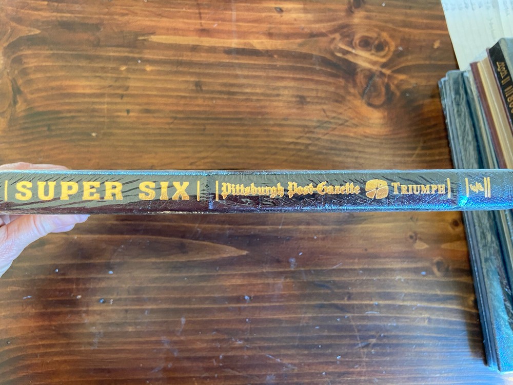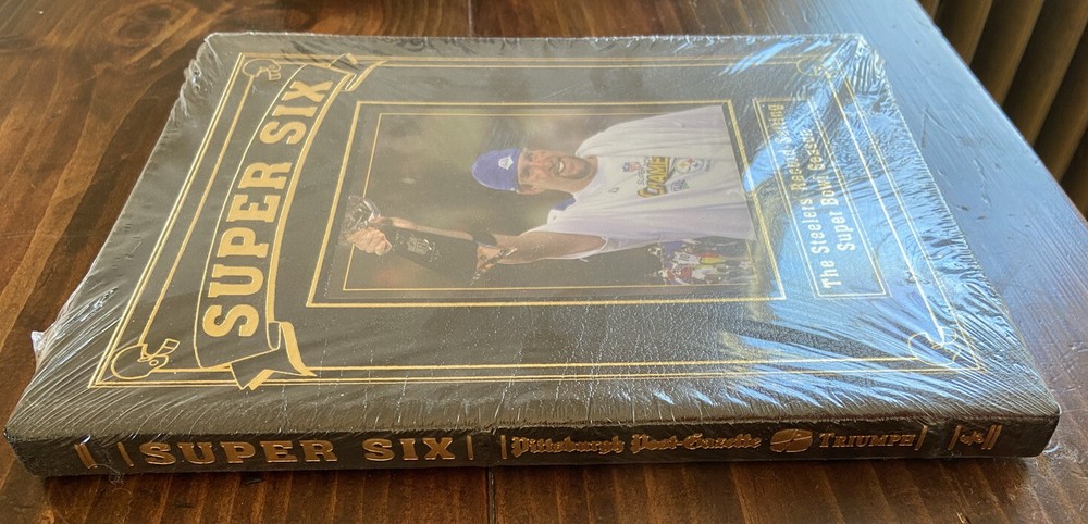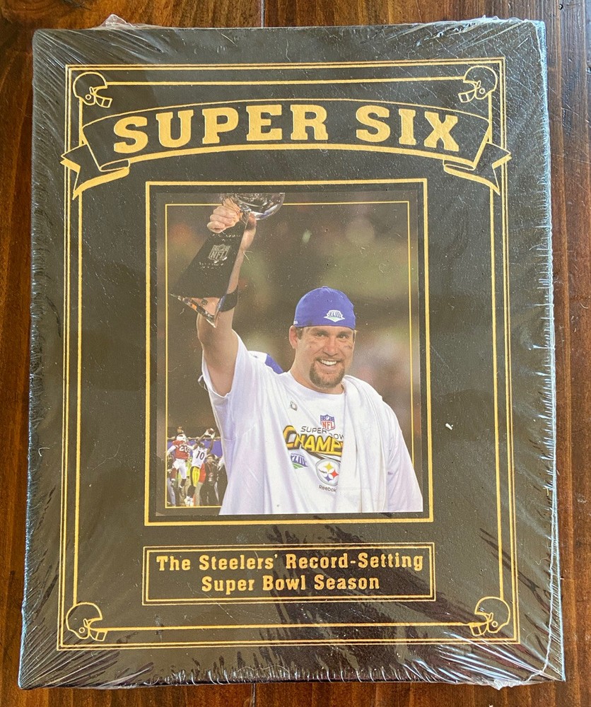 NEW Super Six: The Steelers Record-Setting Super Bowl Season, Leather Ed, Easton Press. Santonio Holmes circus-like catch of the game winning pass from Ben Roethlisberger brought the Pittsburgh Steelers an historic sixth Super Bowl Championship. Super Bowl XLIII was one of the most exciting games to be contested for a championship ever, leaving fans on the edge of their seats to the last tick of the game clock. Coach Mike Tomlin is now the youngest coach in NFL history to lead a team to a Super Bowl win. Celebrate every moment in this 128-page full color commemorative from Easton Press. With each book bound in genuine leather and accented with 22kt gold, Easton Press books are known for permanent satin ribbon page markers, thread sewn pages for strength and durability, elegant gilding, endsheets of rich moiré fabric page edges, and beautiful illustrations by well-known artists. Many titles are now out-of-print and highly collectible. Shipped with USPS Priority Mail.