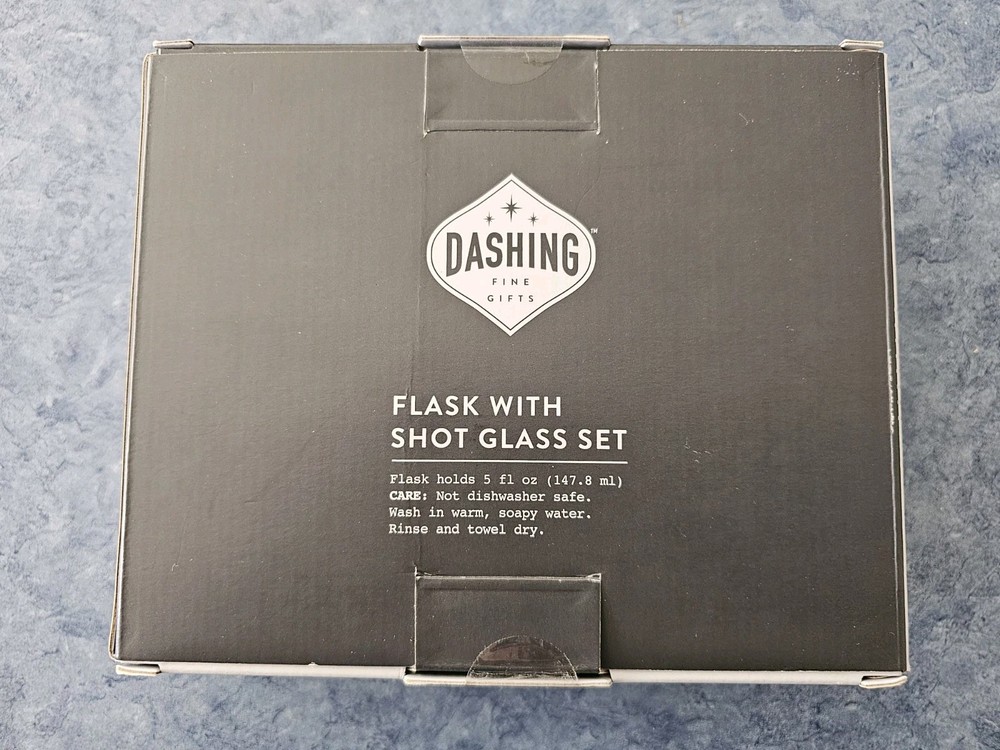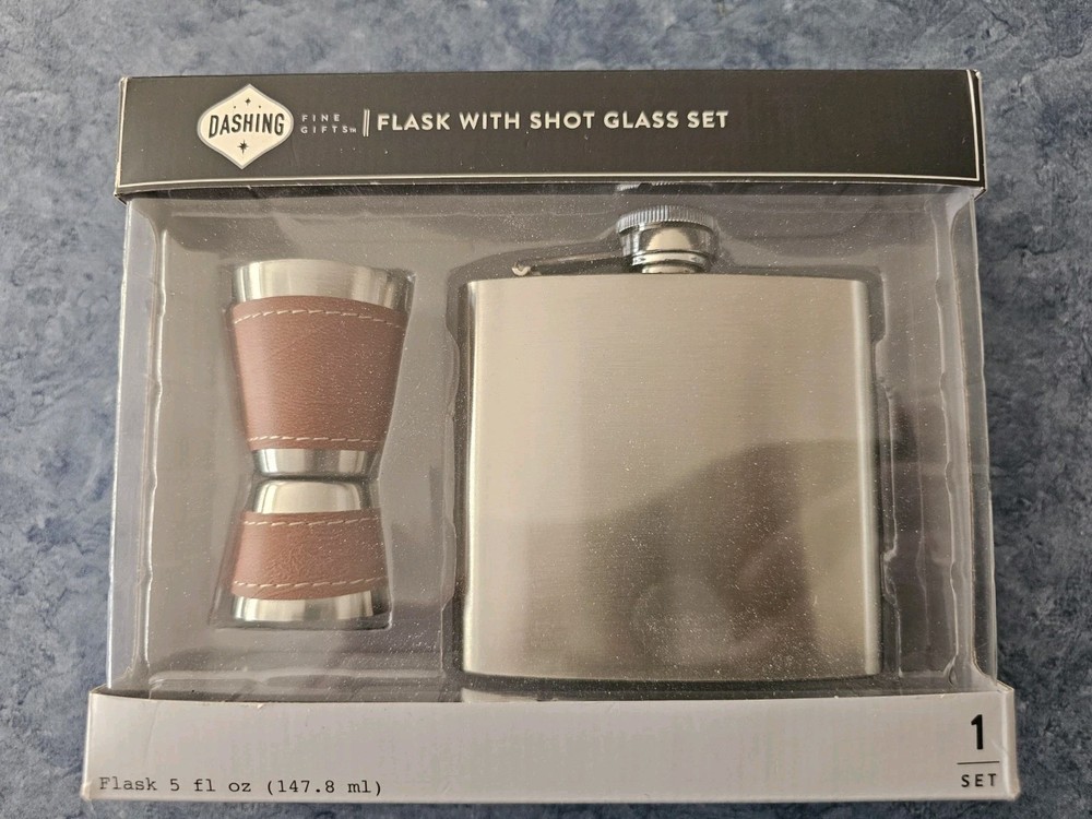 This gift set includes a 5oz silver aluminum flask with a leather-bound shot glass. The set features a Dashing brand design, perfect for Christmas gifting. Great for use in barware, kitchen, and home decor, or as a collectible item. Ideal for those who enjoy a stylish drink accessory.