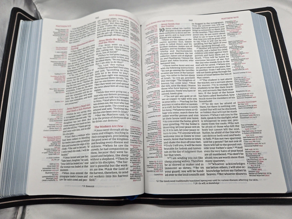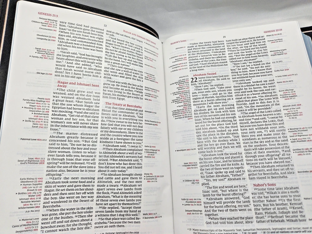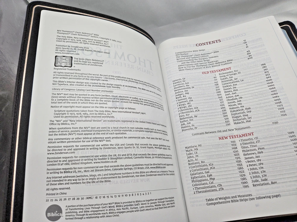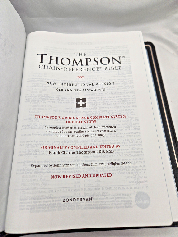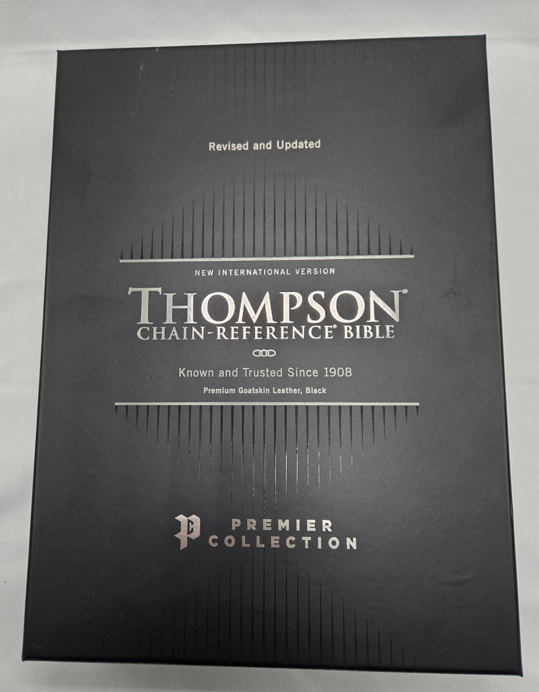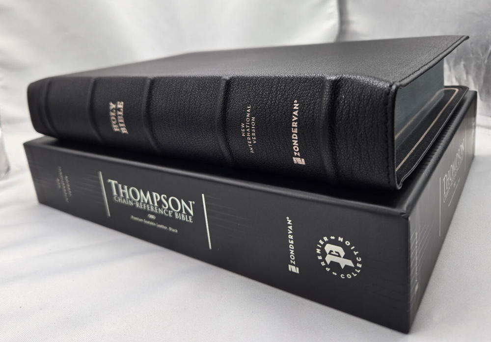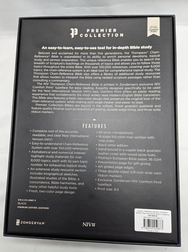 NIV, Thompson Chain-Reference Bible, Premium Goatskin Leather, Black, Premier Collection, Black Letter, Art Gilded Edges, Comfort Print Leather Bound – June 7, 2022 Features: Complete text of the accurate, readable, and clear New International Version (NIV) Easy-to-understand chain-reference system with over 100,000 topical references Alphabetical and numerical indexes highlight study materials for over 8,000 topics, each with its own topic number, for exhaustive topical study An extensive study resource section includes biographical sketches, illustrated studies of the Bible, a concordance, Bible harmonies, and many other helpful study tools Fresh, two-color page design 66 book introductions 16-page full-color map section with map index Black letter edition Hand-bound in a supple goatskin leather cover with raised spine hubs Premium European Bible paper, 36 GSM Presentation page for gift-giving Art gilded page edges Three double-sided 3/8-inch wide satin ribbon markers Exclusive Zondervan NIV Comfort Print typeface 9.5-point print size In 1890, creator of the Thompson Chain-Reference system, Dr. Frank Charles Thompson, began working on the “chain-links” that became the foundation of the unique Thompson referencing system. The Kirkbride Bible Company, Inc., published the first complete Thompson Chain-Reference Bible in 1908 and continued that legacy for over 100 years, adding visual, maps, archeological insights, and over 100,000 references. Now, Zondervan Bibles is excited to take the Thompson Chain-Reference Bible forward, and to continue to steward this important brand with new revised and expanded editions.