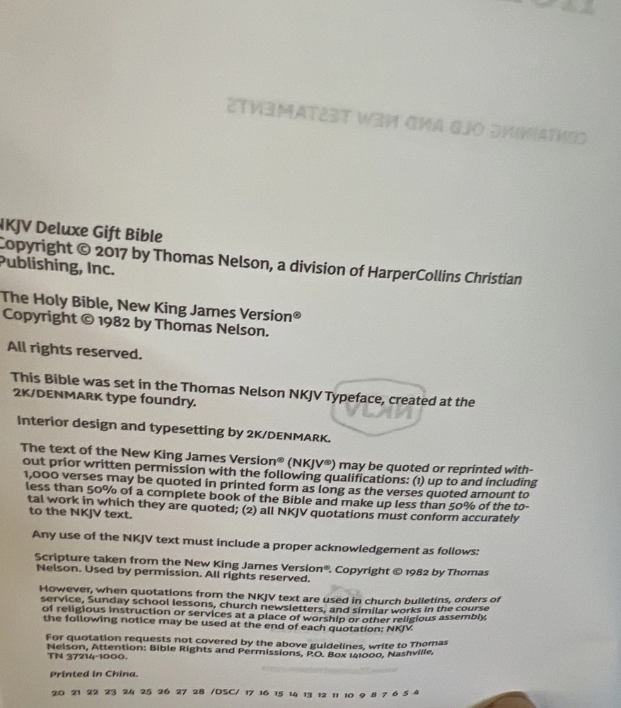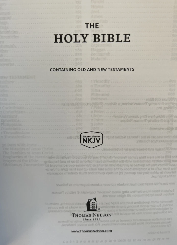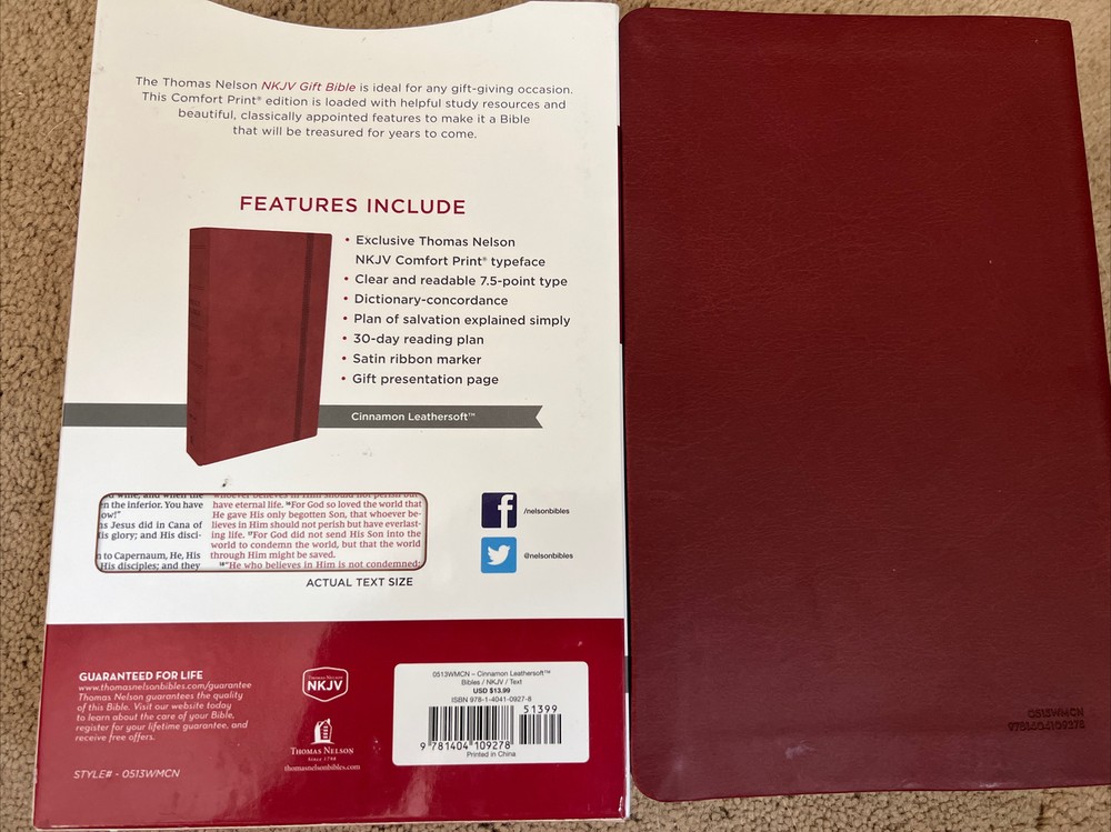 Thomas Nelson NKJV Gift Bible in Box PLEASE NOTE- Already engraved with a person’s name but free of writing inside and still in box. Clear and readable 7.5 typeface Dictionary Concordance Plan of salvation explained simply 30 day reading plan Satin ribbon marker In Box Shipped via USPS Media Mail