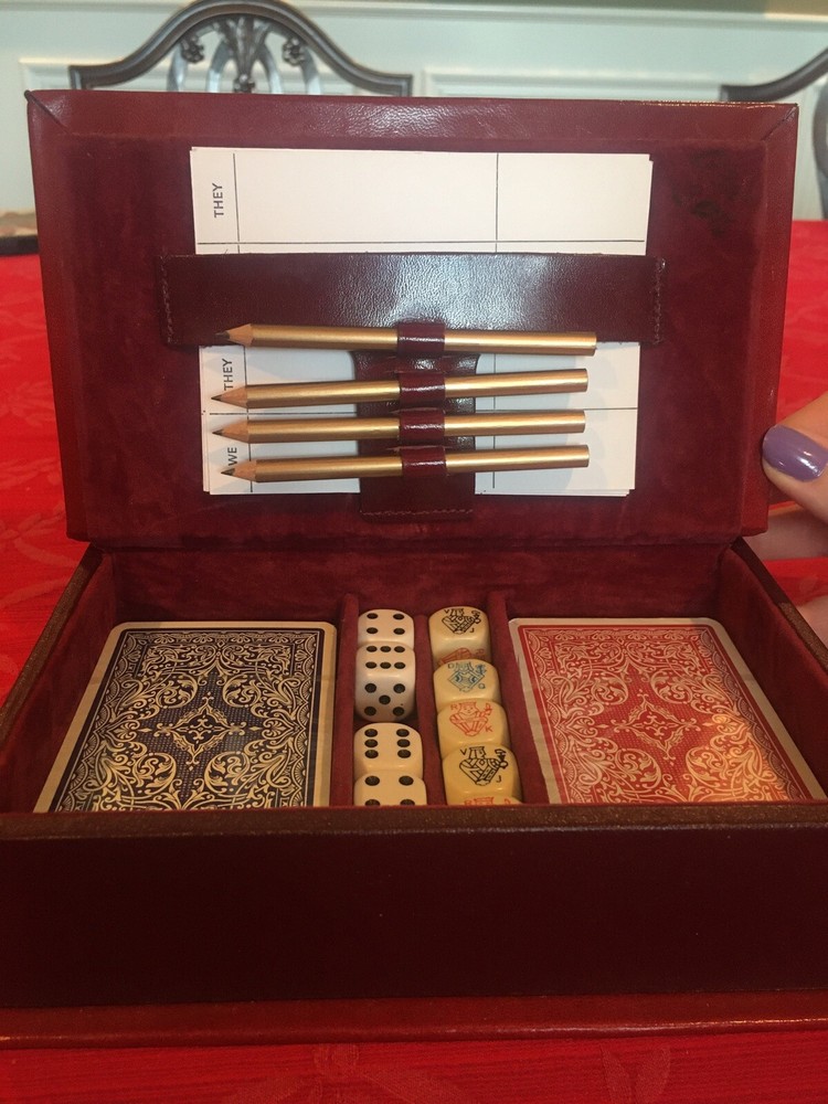NWOT Bridge Game Set, Leather Bound, Vintage, Made In England. Set includes 5 dice and 5 poker dice. Size is 5.25” x 7” x 2” Very cool set. Great for games and/or a decorative item. Our goal is 100 percent customer satisfaction, so please contact us with any questions or issues.