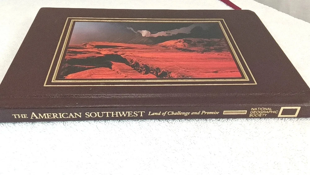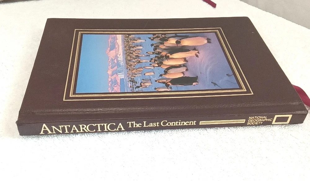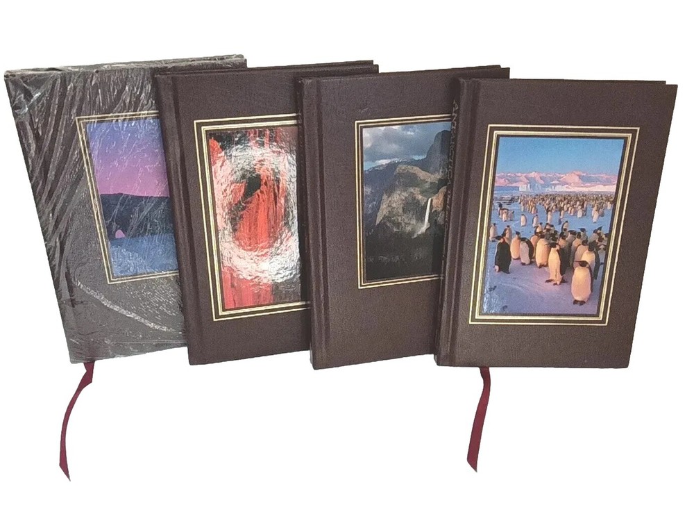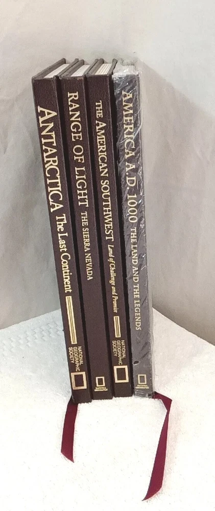 National Geographic 1998 Leather Bound Books, Set of Four Collector's Editions. Set of 4 Leather Bound Books. Each with a Red Satin Book Mark, 3 have Bookplates attached. I do not believe these books have been cracked open. Minor surface wear, please see photos. Set includes: Antarctica The Last Continent Range of Light The Sierra Nevada America A.D. 1000 The Land of The Legends The American Southwest Land of Challenge and Promise. These are such nice books and aesthetically display very well. A wealth of knowledge and incredible photography.