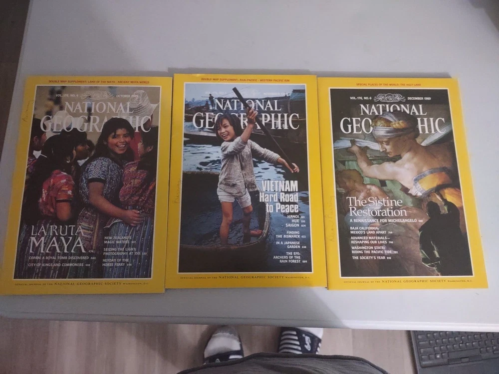 Book Sale! This is two leather bound slip cases with a years worth of National Geographic magazine. These magazines are in good condition, see pictures If you have any questions or would like more pictures please let me know. I try to convey the condition of the book thru the pictures. I am an avid reader myself, and I started selling books as a way to pay for the books I read. I love the feel of the book in my hands and I have created my own library of all the books I have read. I am now a full time caregiver to my wife whose has muscular dystrophy. She is totally dependent on me. This store is now my way of trying to make a little extra money to allow me to stay home and take care of her. So, if you have any issues with my books please let me know. I will always work with you and do my best to make sure you are satisfied. I get alot of my books from estate sales and I sometime might miss something wrong with the book. My goal is to provide an affordable book to those that also love books. I also offer combine shipping on books at a dollar each additional book, just add the books to your cart and it should automatically calculate. I hope you enjoy any books you choose and come back again. I am always provided discounts to those who watch my books. Books are meant to be read and cherished, not sit on my shelfs. thanks for your interest in my books. BMESJUN0724