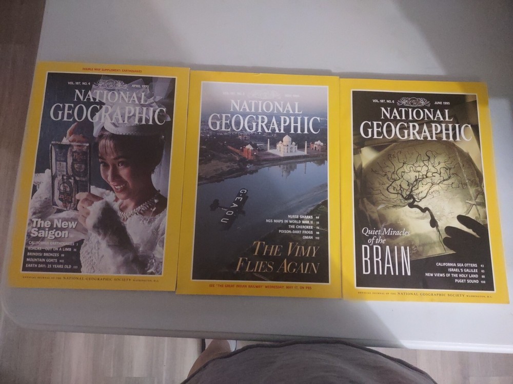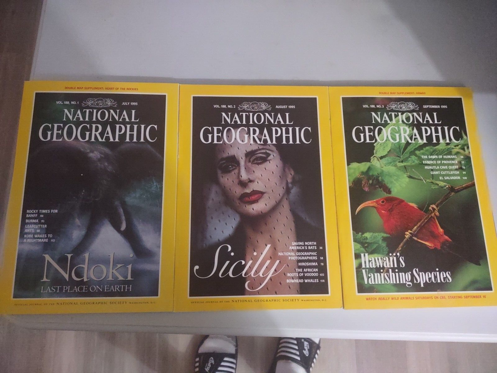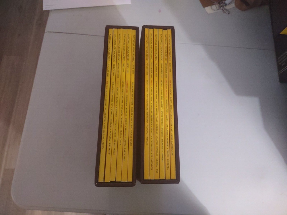 Book Sale! This is two leather bound slip cases with a years worth of National Geographic magazine. These magazines are in good condition, see pictures If you have any questions or would like more pictures please let me know. I try to convey the condition of the book thru the pictures. I am an avid reader myself, and I started selling books as a way to pay for the books I read. I love the feel of the book in my hands and I have created my own library of all the books I have read. I am now a full time caregiver to my wife whose has muscular dystrophy. She is totally dependent on me. This store is now my way of trying to make a little extra money to allow me to stay home and take care of her. So, if you have any issues with my books please let me know. I will always work with you and do my best to make sure you are satisfied. I get alot of my books from estate sales and I sometime might miss something wrong with the book. My goal is to provide an affordable book to those that also love books. I also offer combine shipping on books at a dollar each additional book, just add the books to your cart and it should automatically calculate. I hope you enjoy any books you choose and come back again. I am always provided discounts to those who watch my books. Books are meant to be read and cherished, not sit on my shelfs. thanks for your interest in my books. BMESJUN0724