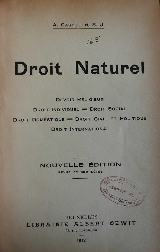 Natural Rights Auguste Castelein Droit Naturel Law 1912 Belgian 2 v. leather set Natural Rights Auguste Castelein Droit Naturel Law 1912 Belgian 2 v. leather set (Old Books, Leather Sets, French Books, Philosophy, Natural Rights, 20th Century Books). Droit Naturel, by A. Castelein. Published 1912, Brussels by Albert Dewit. 2 volumes, 1029 pages. Text in French. Period 1/4 leather binding, raised bands, gilt compartment decorations & title lettering, marbled covers and end papers. Old institutional stamps to title pages, leather rubbed and scuffed but still supple, covers firmly attached. Book remains well preserved and attractive on the shelf. It displays a pleasing and unique age patina and is in nice antiquarian condition, the age flaws easy to overlook or forgive. Please review photos for more detail and our best attempt to convey how this antique item survives. Book Measures c. 9 1/2" H x 6 1/2" W. [B317].