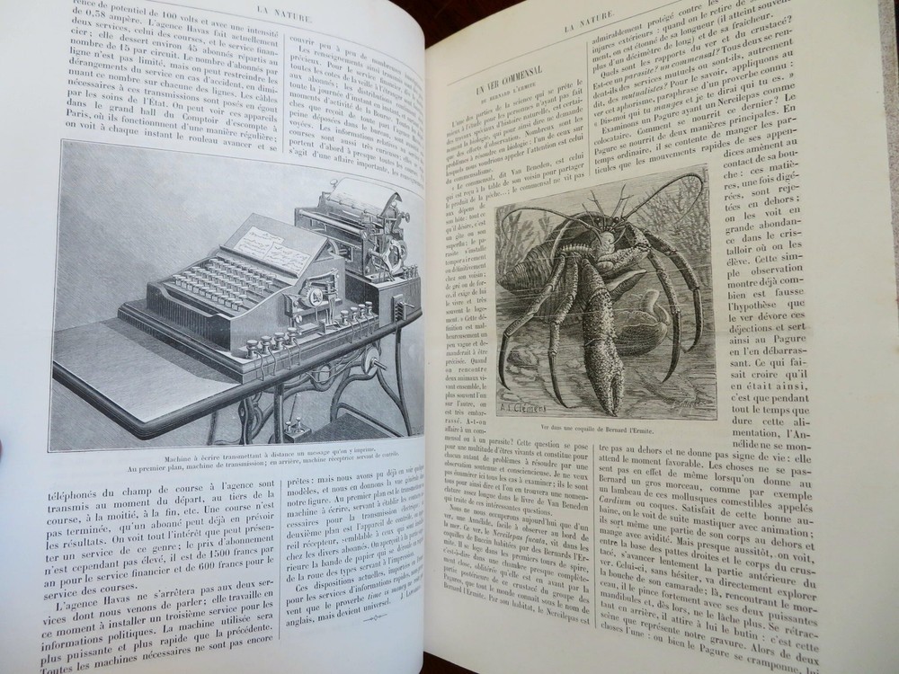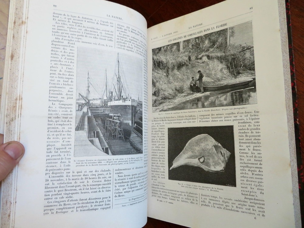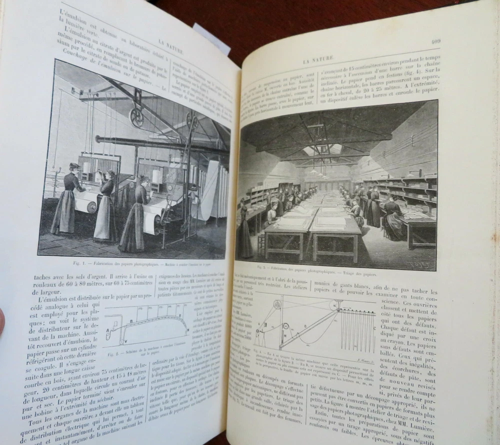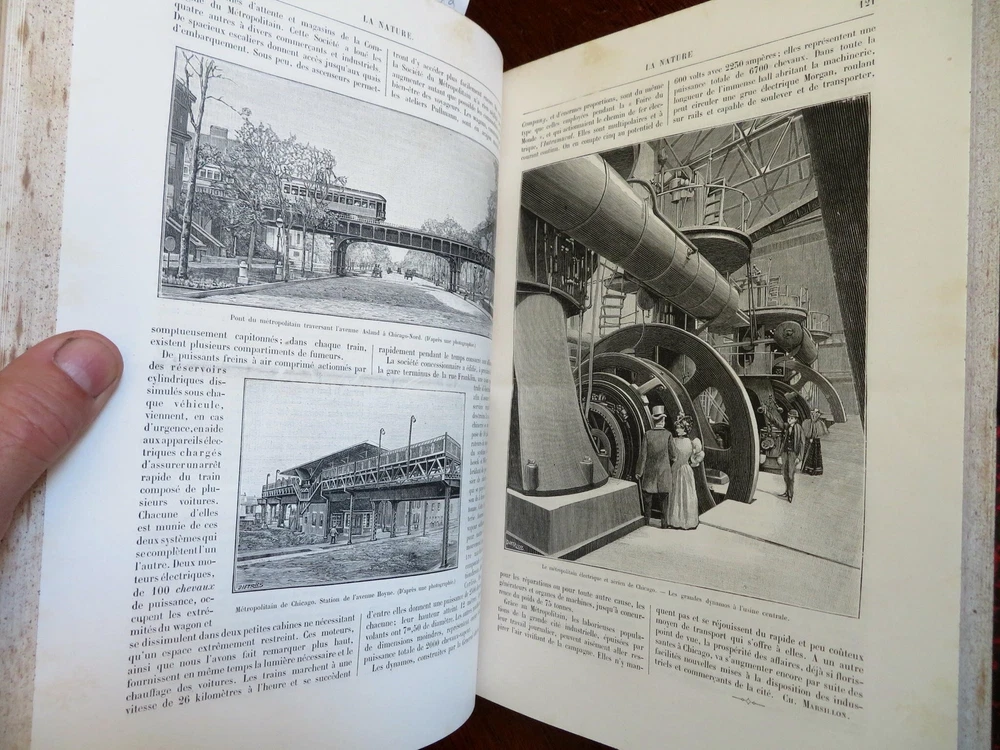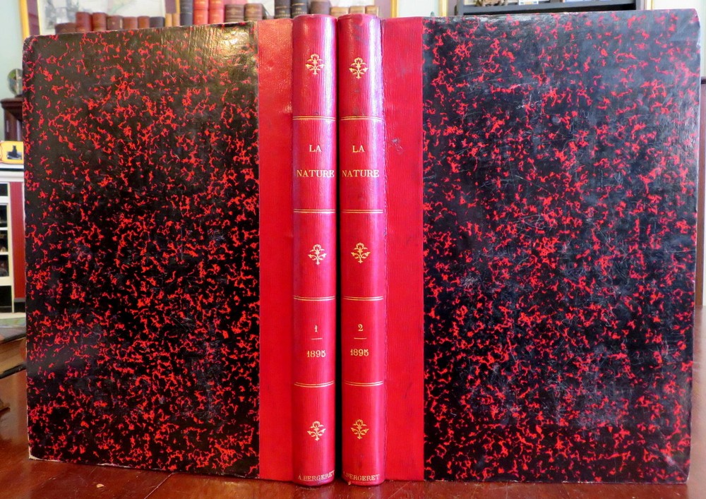 Nature French Scientific Review Arts 1895 Illustrated rare 2 vol. leather set Nature French Scientific Review Arts 1895 Illustrated rare 2 vol. leather set (Old Books, Early 20th Century Books, Leather Books, French Periodicals, Illustrated Books, Sciences, Engineering). Le Nature: Revue des Sciences et de Leurs Application Aux Arts et a L'Industrie, ed. by Henri de Parville. Published 1895, Paris by Masson et Cie. 2 volumes, each c. 425 pages. Text in French. Profusely illustrated throughout. Fascinating work covering a broad range of topics, including engineering, latest discoveries, science, geography, industy, medicine, chemistry, on and on. Period 1/4 leather bindings, smooth spines, gilt bands, title lettering, & compartment decorations, marbled covers & end papers. Set is physically old and shows some signs of handling and time. Set is not new or in "new" condition. Bindings gently age worn and lightly rubbed, covers are strongly and firmly attached, set remains overall attractive as an object. Text block paper is gently toned, internally still clean, well preserved, tight, sound. Still attractive on the shelf. This scarce set displays a pleasing and unique age patina and is in nice antiquarian condition, any age flaws easy to overlook or forgive. Please review photos for more detail and our best attempt to convey how this wonderful pictorial set survives. Books Measures c. 11 1/2" H x 8" W. [B3443].