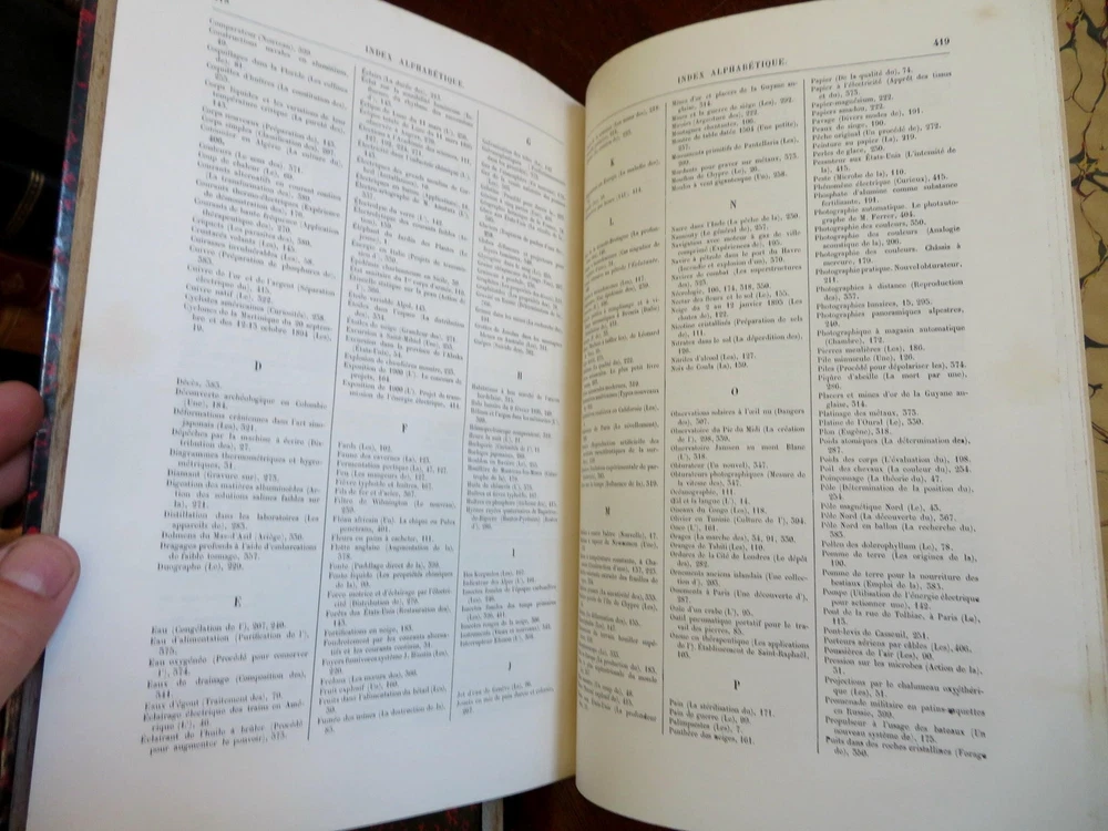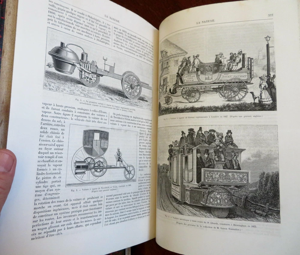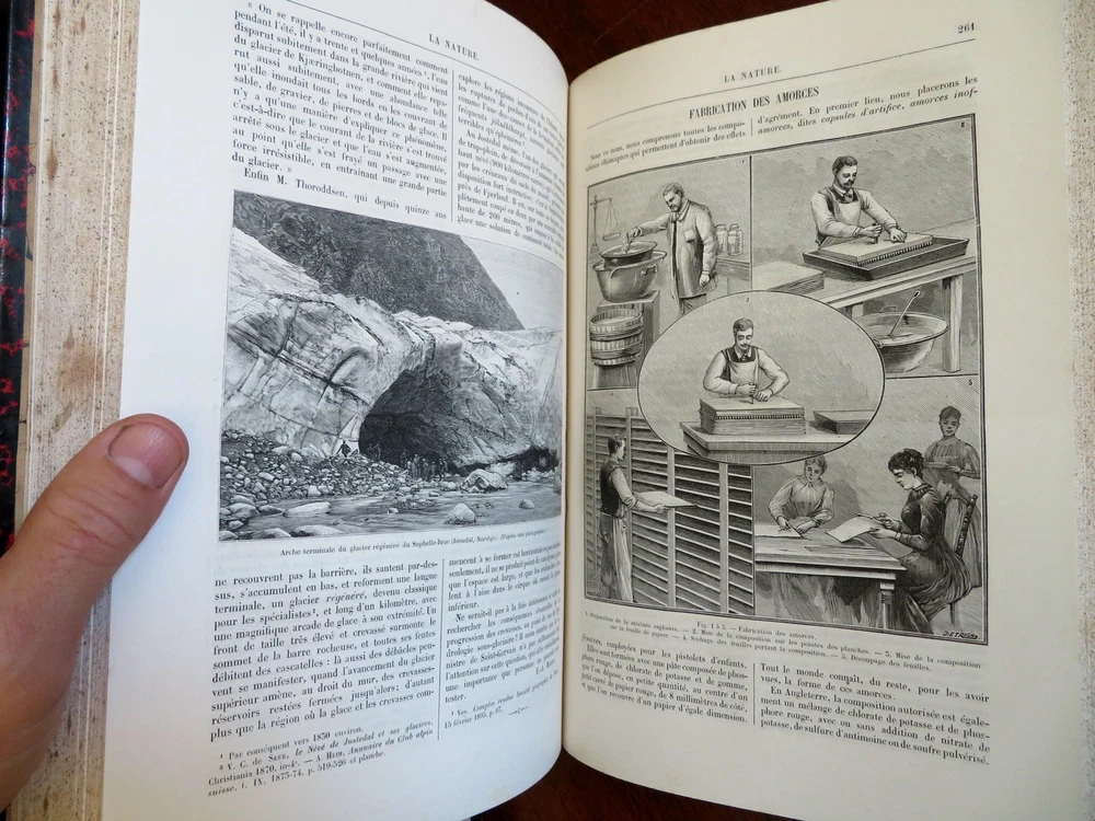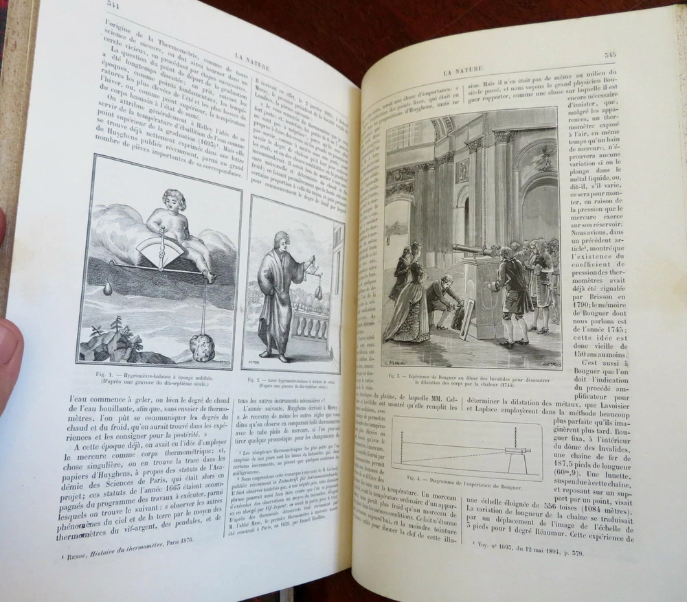 Nature French Scientific Review Arts 1895 Illustrated rare 2 vol. leather set Nature French Scientific Review Arts 1895 Illustrated rare 2 vol. leather set (Old Books, Early 20th Century Books, Leather Books, French Periodicals, Illustrated Books, Sciences, Engineering). Le Nature: Revue des Sciences et de Leurs Application Aux Arts et a L'Industrie, ed. by Henri de Parville. Published 1895, Paris by Masson et Cie. 2 volumes, each c. 425 pages. Text in French. Profusely illustrated throughout. Fascinating work covering a broad range of topics, including engineering, latest discoveries, science, geography, industy, medicine, chemistry, on and on. Period 1/4 leather bindings, smooth spines, gilt bands, title lettering, & compartment decorations, marbled covers & end papers. Set is physically old and shows some signs of handling and time. Set is not new or in "new" condition. Bindings gently age worn and lightly rubbed, covers are strongly and firmly attached, set remains overall attractive as an object. Text block paper is gently toned, internally still clean, well preserved, tight, sound. Still attractive on the shelf. This scarce set displays a pleasing and unique age patina and is in nice antiquarian condition, any age flaws easy to overlook or forgive. Please review photos for more detail and our best attempt to convey how this wonderful pictorial set survives. Books Measures c. 11 1/2" H x 8" W. [B3443].