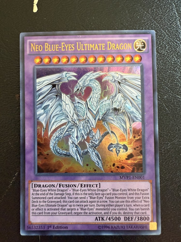 The Neo Blue-Eyes Ultimate Dragon card is a highly sought-after Ultra Rare card from the Yu-Gi-Oh! TCG. With an attack power of 4500 and a defense of 3800, this English-language card is a powerful addition to any collection. Manufactured by Konami, this 1st Edition card features the Dragon creature type and belongs to the Fusion card type, making it a valuable and unique piece for collectors and players alike.
