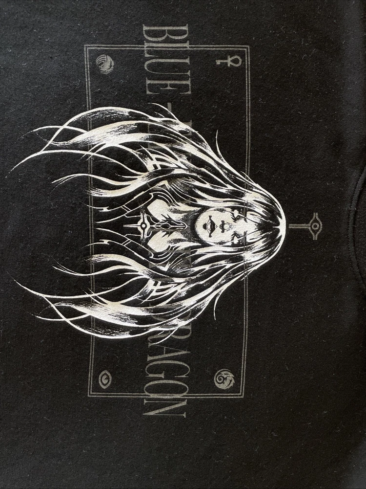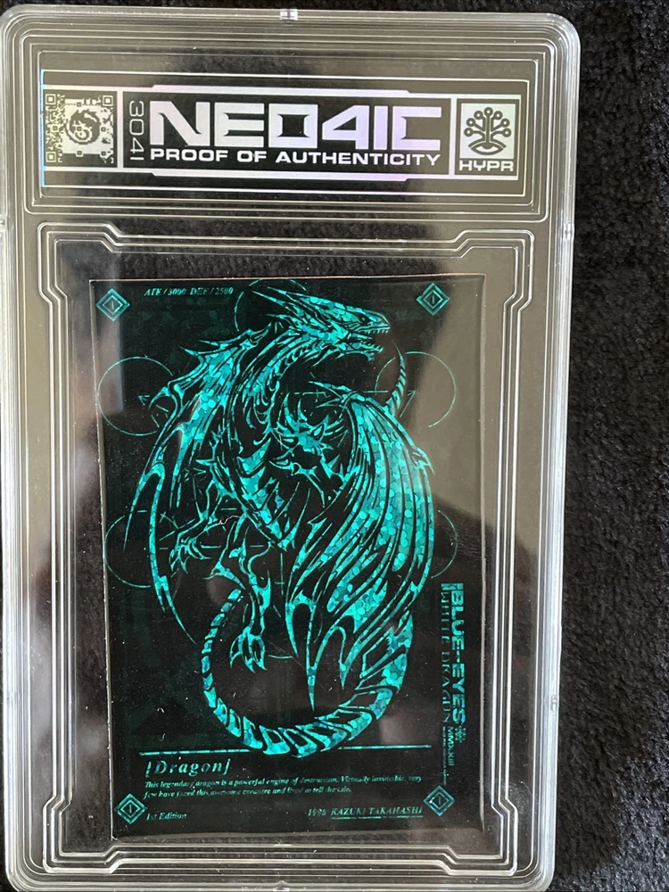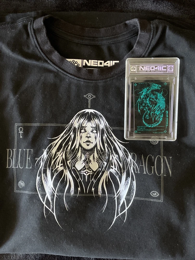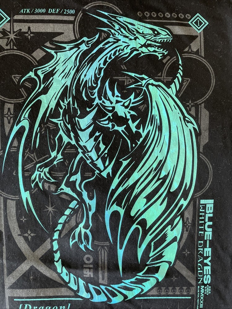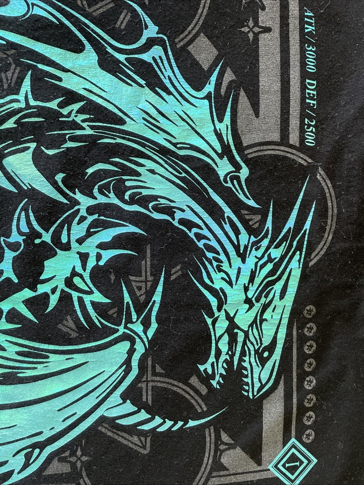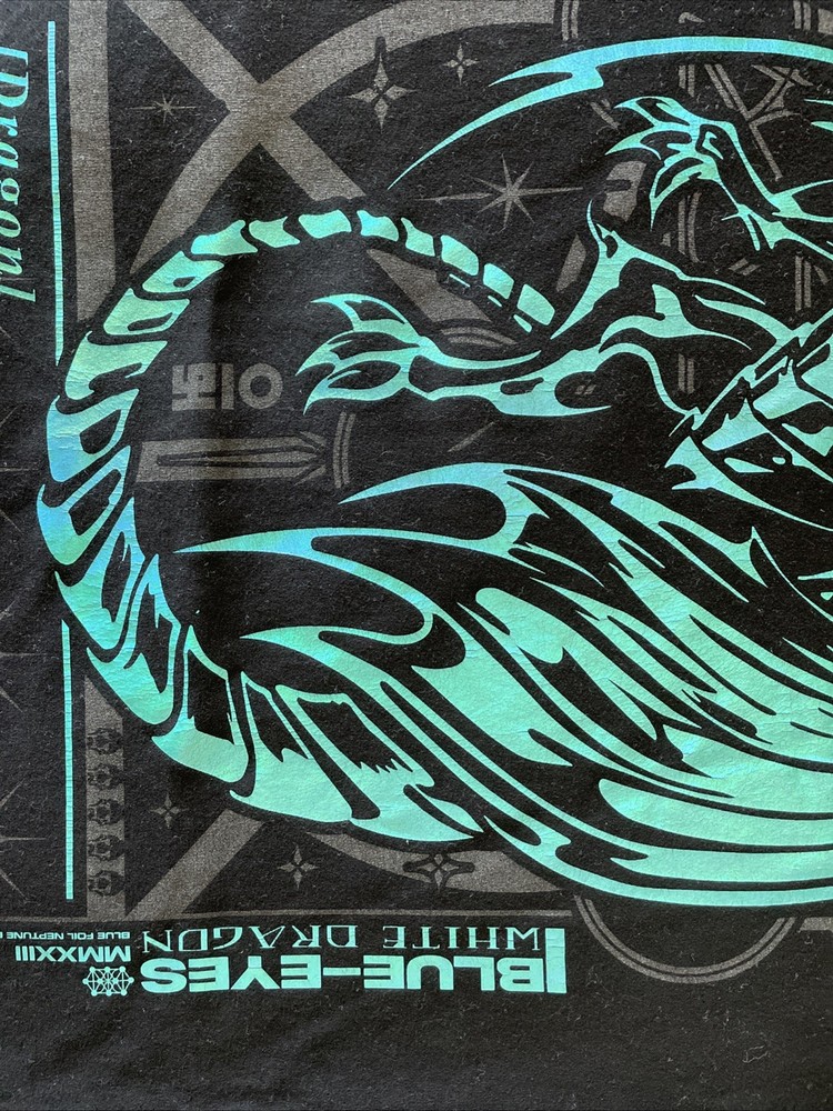 From Neo4ic reflective/holographic Yugioh themed shirt of Blue Eyes White Dragon with the little collectible custom promo card they sent with the shirt upon release. Shirt is worn, size is medium fits like a Large to be honest, been through the wash a few times mostly on cold was air dry/tumble low dry to minimize shrinkage. Still looks good although close ups will show reflective graphics show slight cracks/wear from wash and fits good. Washed and cleaned before listed!