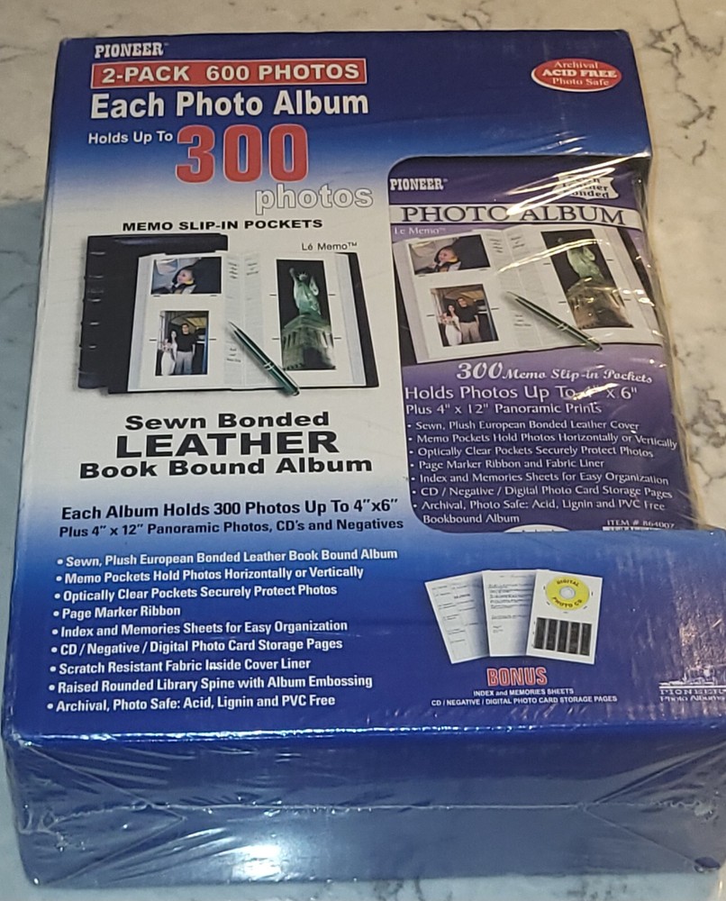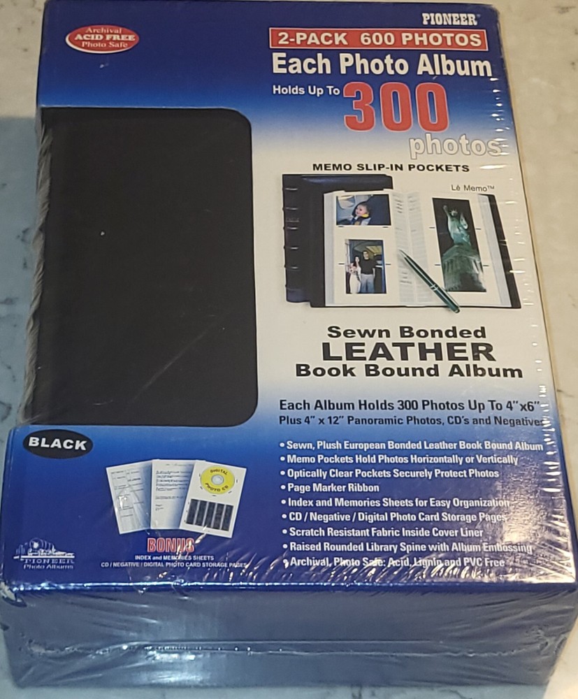 Sewn Bonded Leather Book Bound Album Each Album Holds 300 Photos Up To 4"x6" Plus 4"x12" Panoramic Photo's, CD and Negative Sewn, Plus European Bonded Leather Book Bound Album Memo Pockets Hold Photos Horizontally or Vertically Optically Clear Pockets Securely Protect Photos Page Marker Ribbon Index and Memories Sheets for Easy Organization CD/Negative/Digital Photo Card Storage Pages Scratch Resistant Fabric Inside Cover Liner Raised Rounded Library Spine with Album Embossing Archival Photo Safe: Acid Lignin and PVC Free Smoke-Free Pet-Free Free Shipping Excludes Hawaii Alaska and Puerto Rico