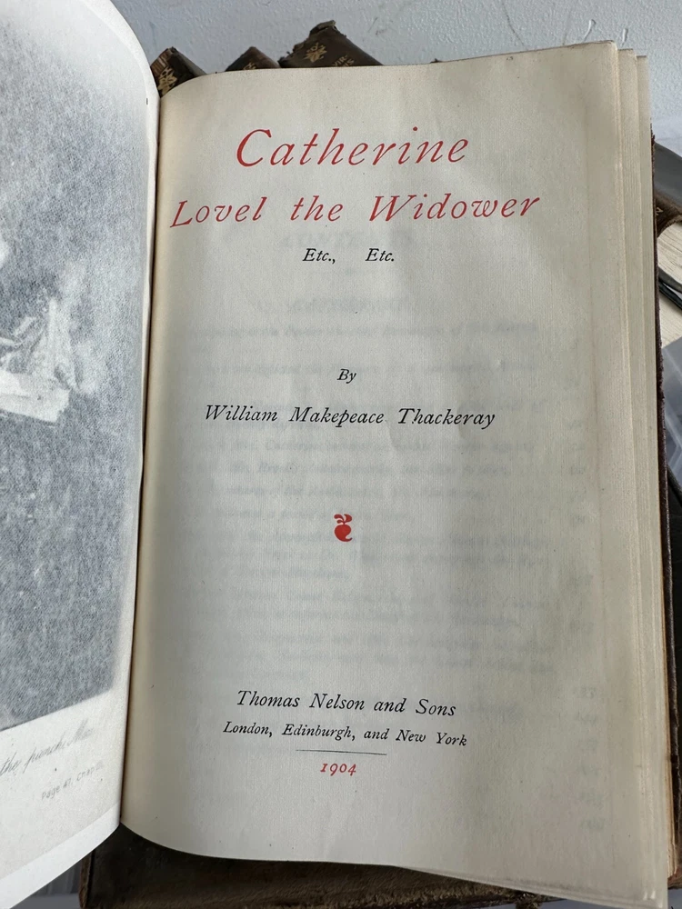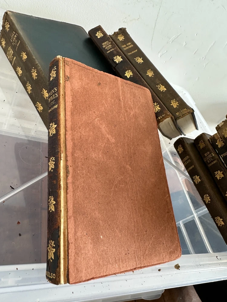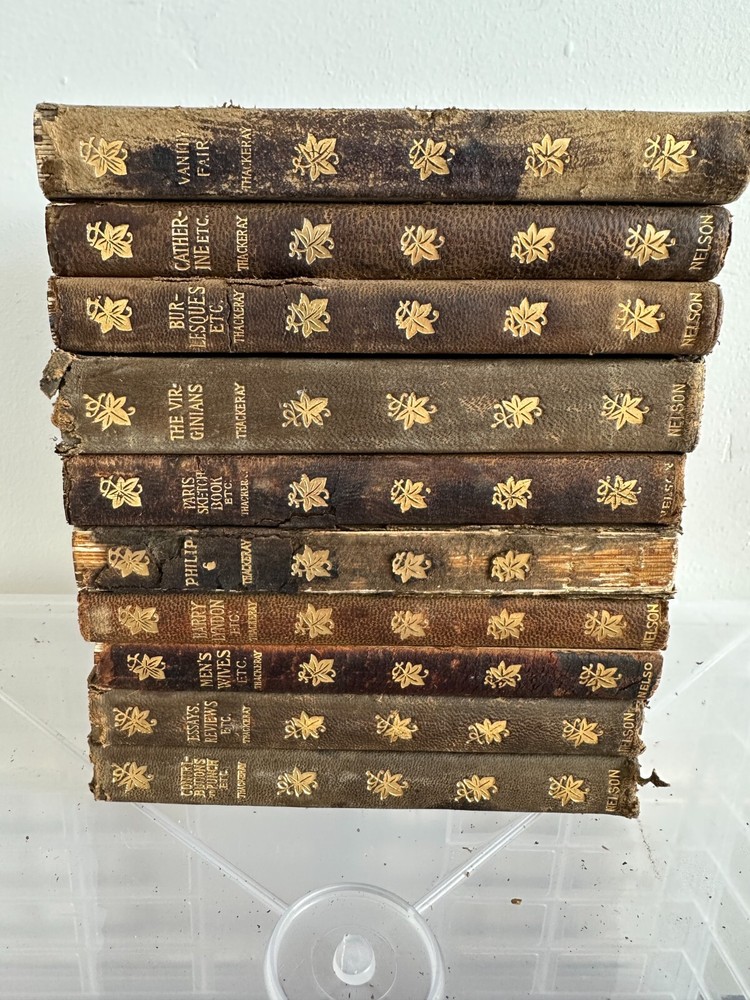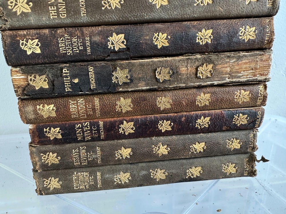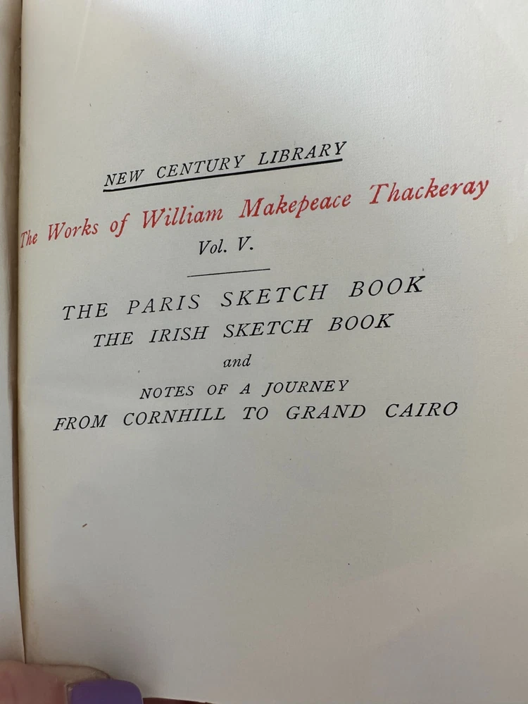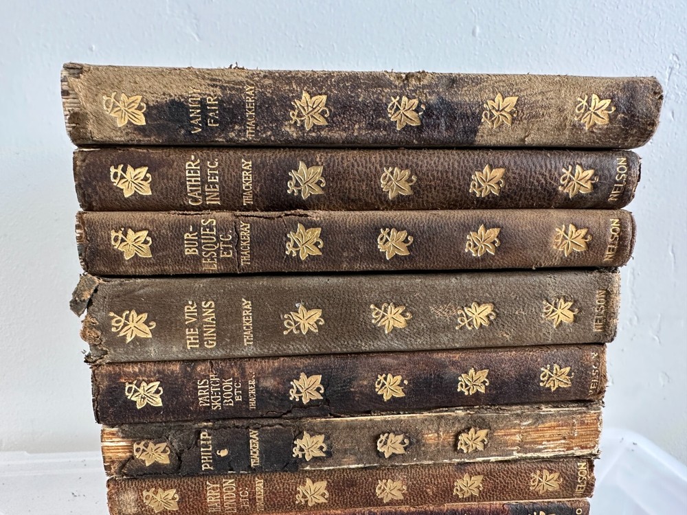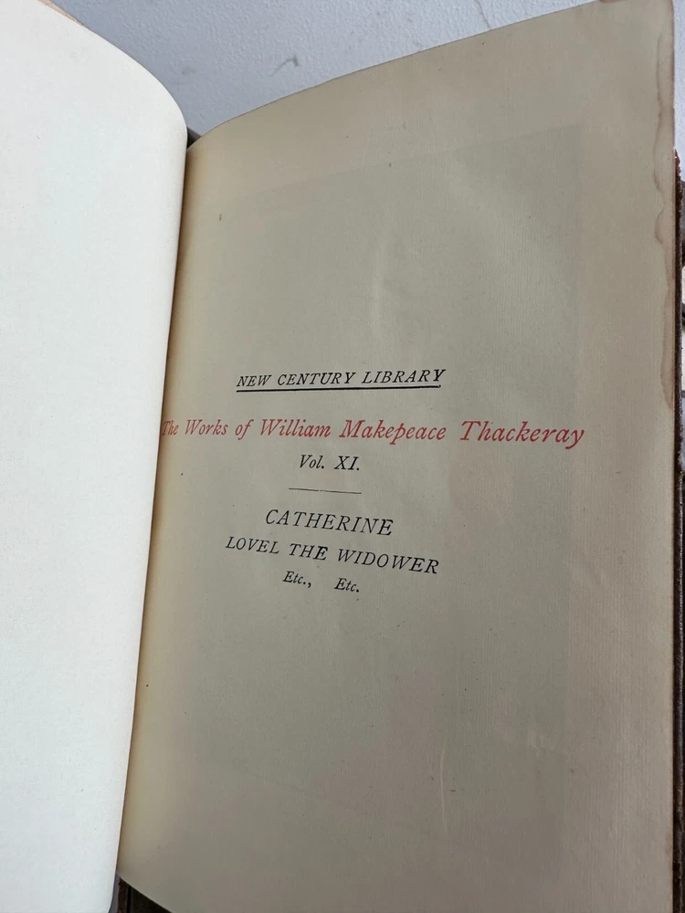 New Century Library: Works of William Makepeace Thackeray 10 leather bound soft Volumes. 6" x 4". Included are volumes: Vanity Fair V. I 1904 Signed May 26, 1905 The Paris Sketchbook The Irish Sketchbook Etc. V. V 1903 Burlesques The Fitzboodle Papers V. VII 1904 Men's Wives/ The Yellow Plush Papers V. VIII 1904 The Virginians V. IX 1909 The Adventures of Philip V. X 1906 2 torn pages Catherine Lovel The Widower V. XI 1904 The Memoirs of Barry Lyndon Esq V. XII 1906 Essays, Reviews V. XIII 1909 Contributions to Punch V. XIV 1909 Please ask for specific photos if needed. See my feedback. I am an honest eBayer since 1998l.