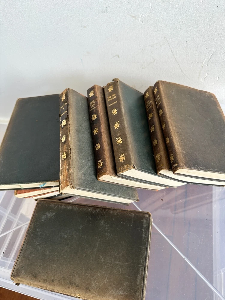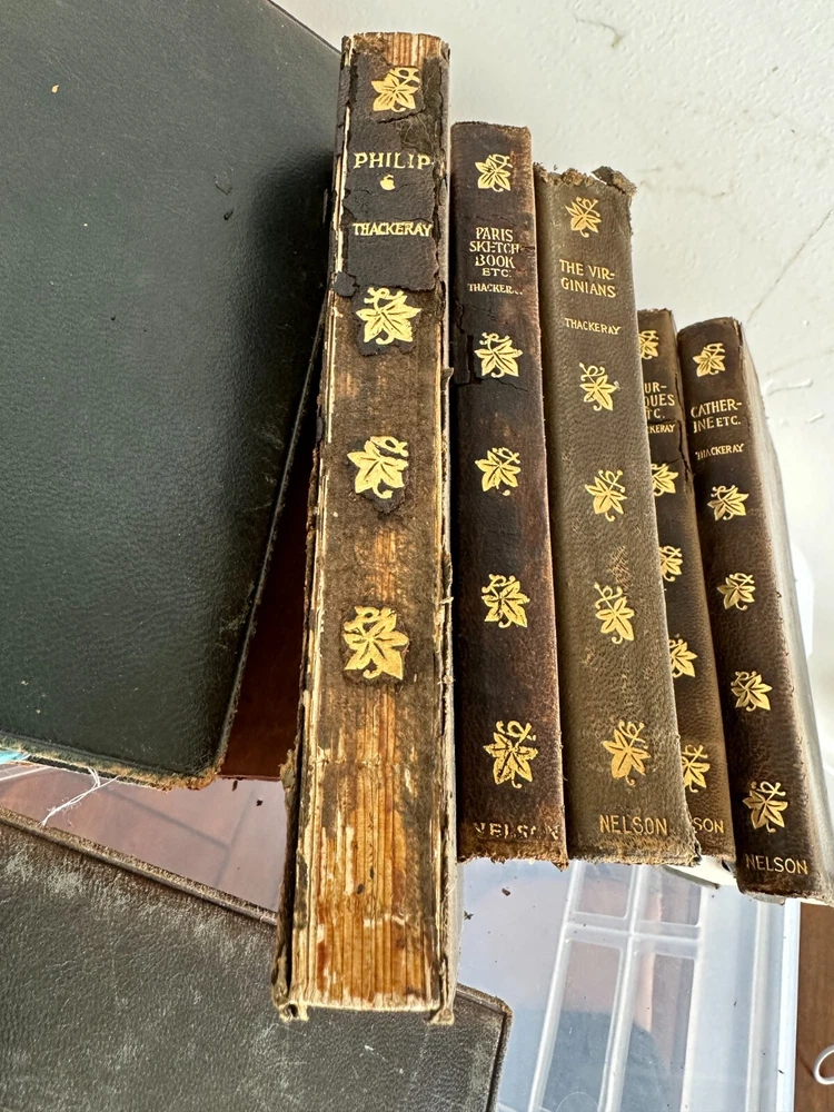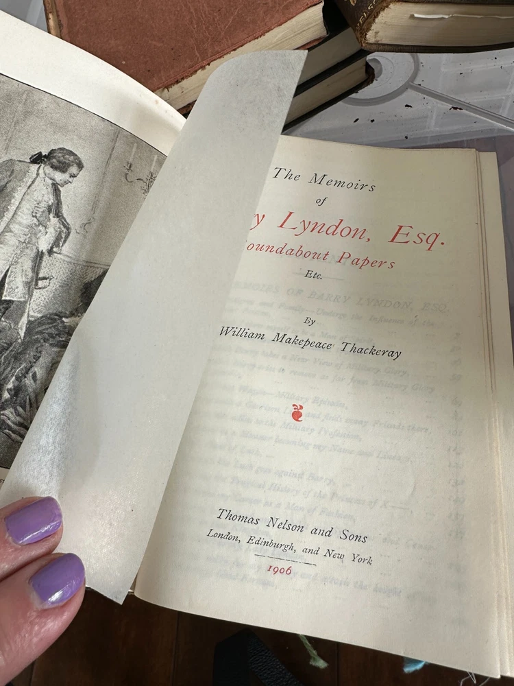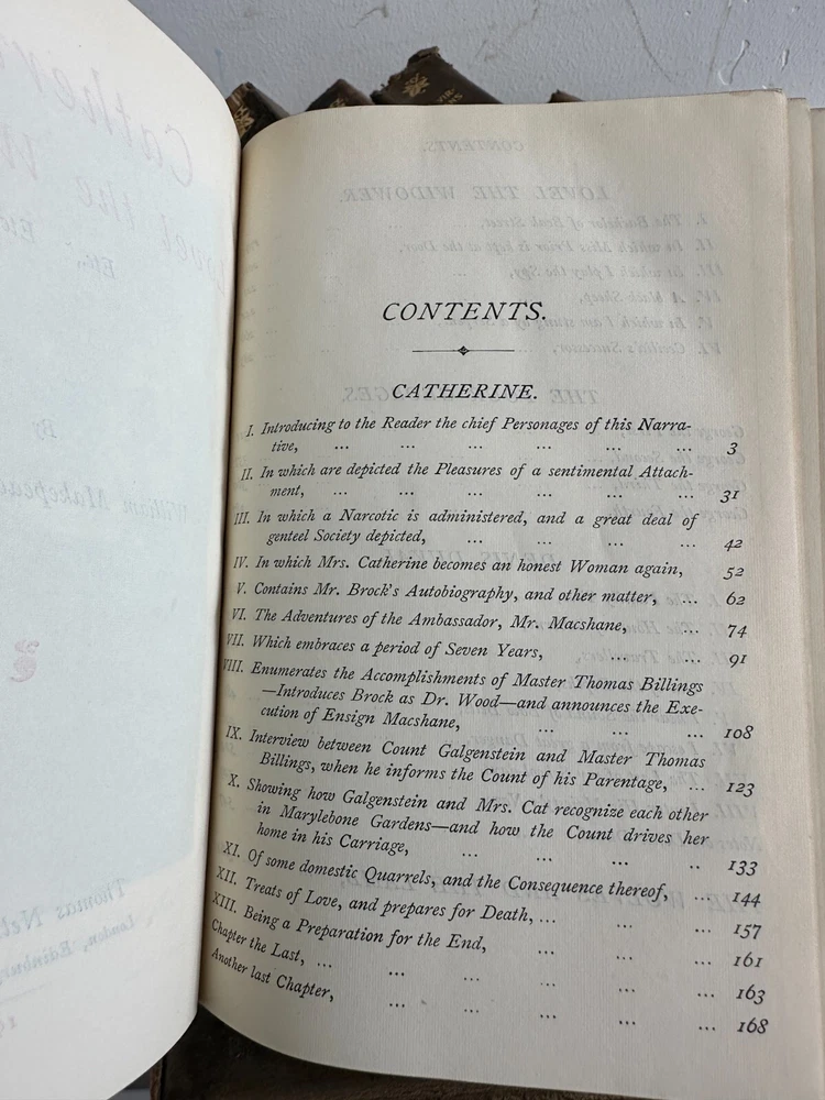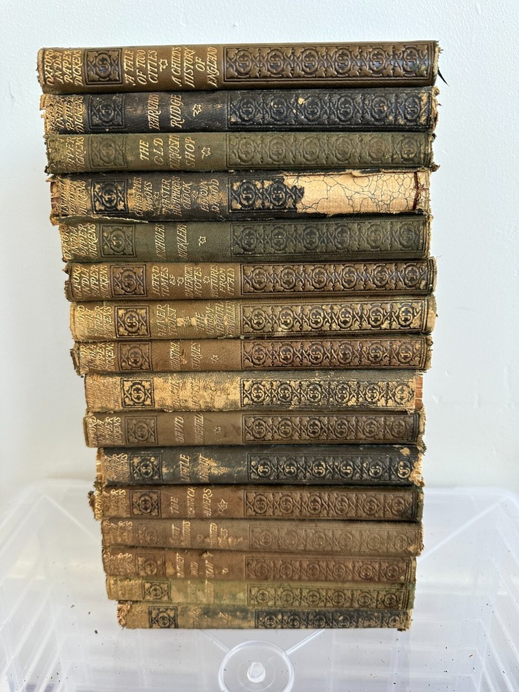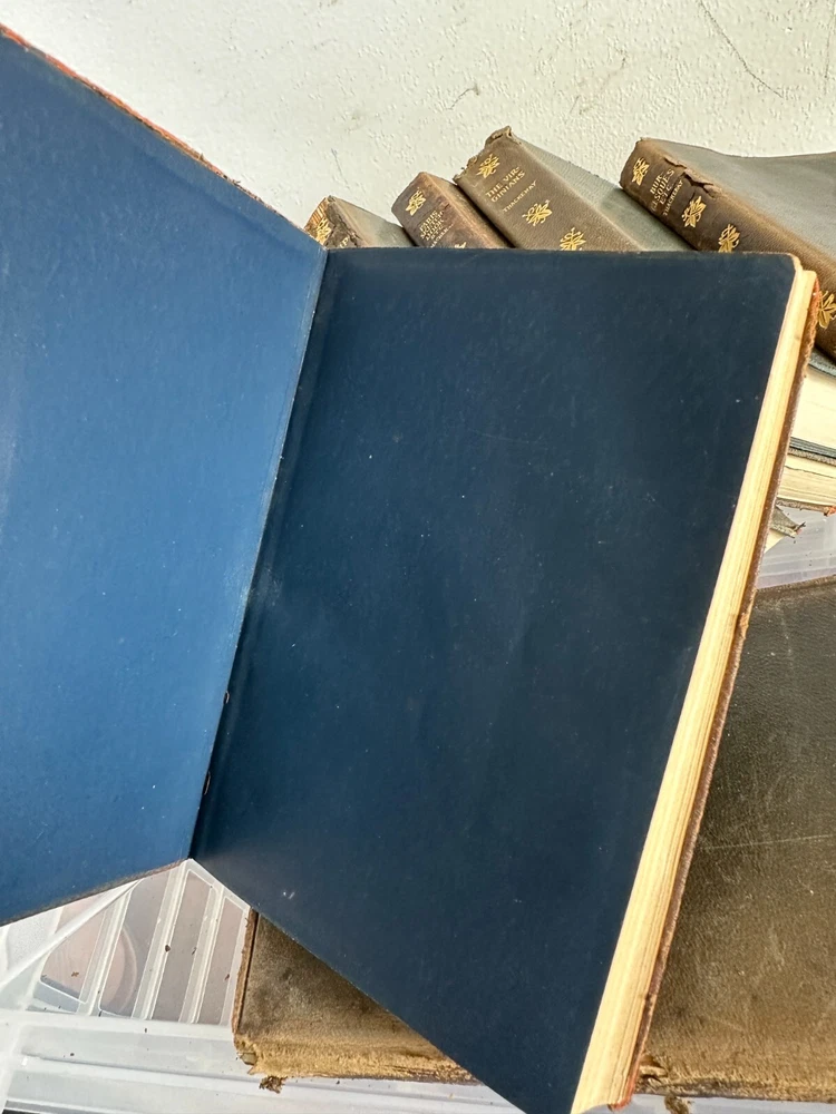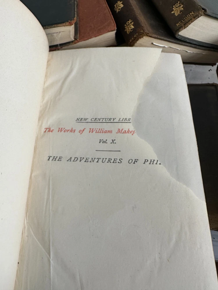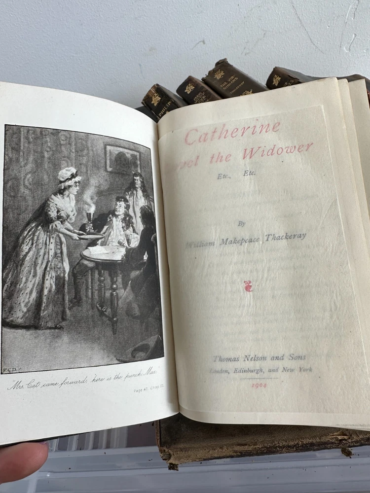New Century Library: Works of William Makepeace Thackeray 10 leather bound soft Volumes. 6" x 4". Included are volumes: Vanity Fair V. I 1904 Signed May 26, 1905 The Paris Sketchbook The Irish Sketchbook Etc. V. V 1903 Burlesques The Fitzboodle Papers V. VII 1904 Men's Wives/ The Yellow Plush Papers V. VIII 1904 The Virginians V. IX 1909 The Adventures of Philip V. X 1906 2 torn pages Catherine Lovel The Widower V. XI 1904 The Memoirs of Barry Lyndon Esq V. XII 1906 Essays, Reviews V. XIII 1909 Contributions to Punch V. XIV 1909 Please ask for specific photos if needed. See my feedback. I am an honest eBayer since 1998l.