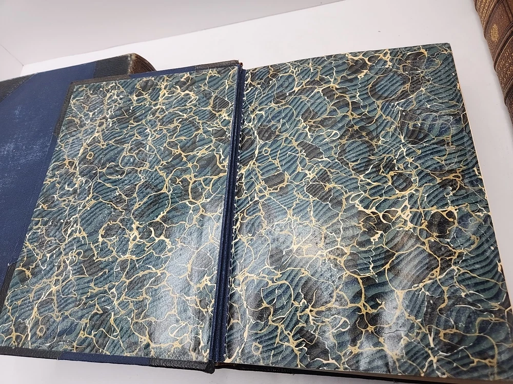Books measure approximately 10 & 1/8 in x 7 & 1/2 in with varying thickness from around 2 in to 2 & 1/4 in. They are quite heavy weighing approximately 5lbs each. The edges of the paper are gold though it's faded and hard to catch on camera. Condition as pictured. Absolutely stunning bindings on these books. Would make excellent decor or film props.