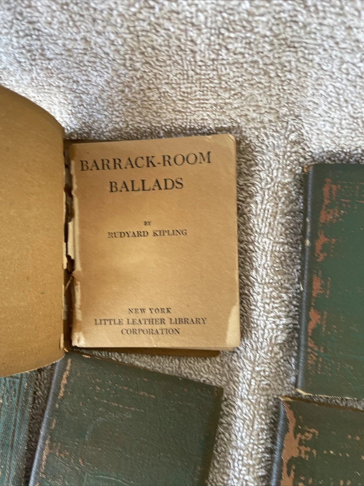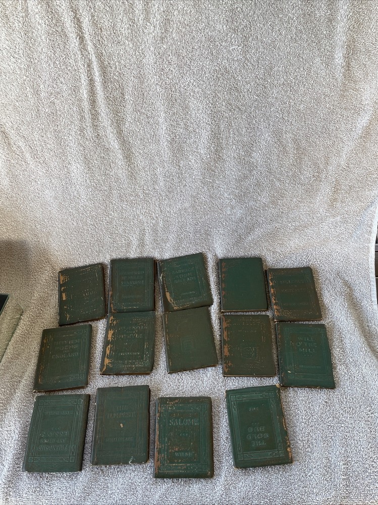 Nice Antique Little Leather Library lot of 14Books with BOX Item is used and comes with a mirror box for storage. Lot of 14 books of various titles. These small green books do have wear and tears on them and rips throughout.item does have small creases and sticky spots on books but Stored indoors and well kept . No other accessories just what is in pictures.Please see all pictures.