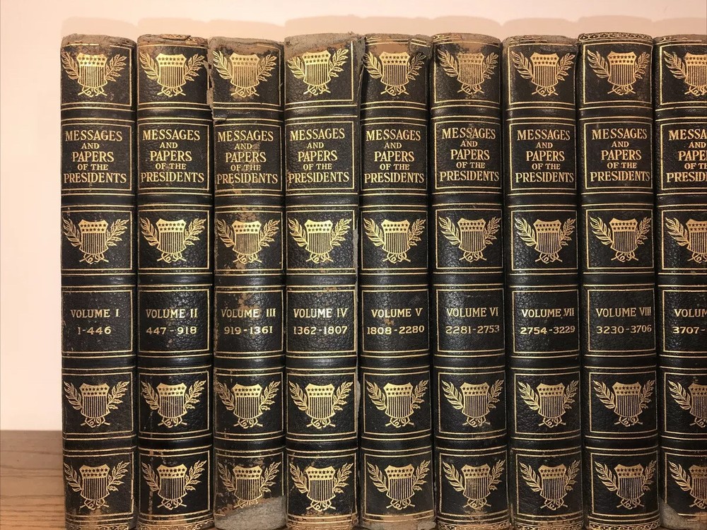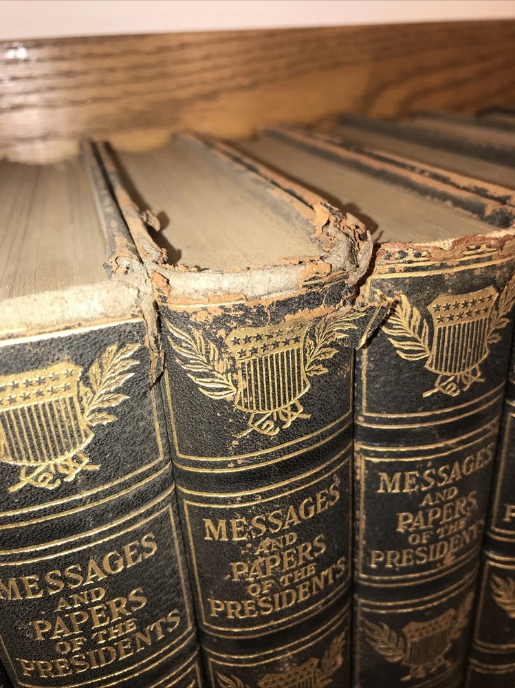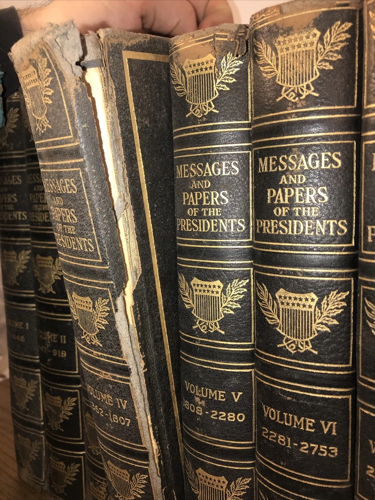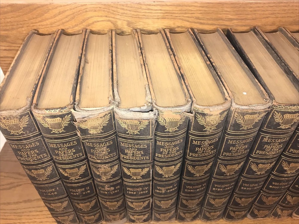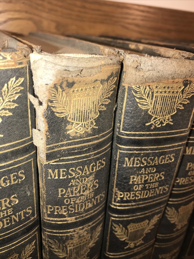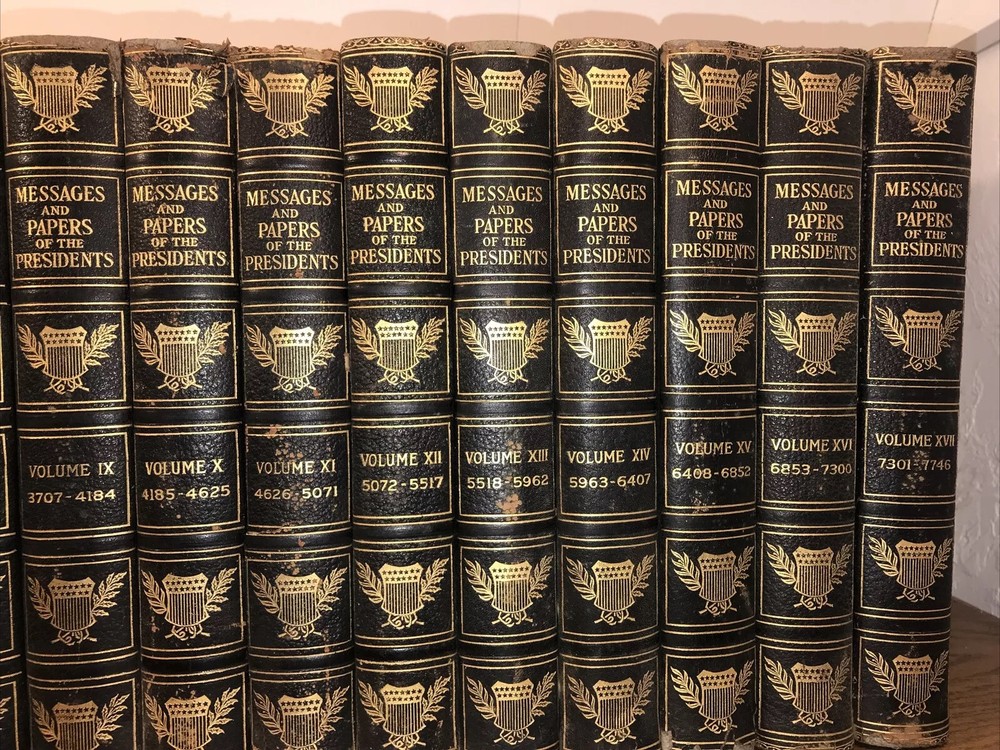 Complete in 20 volumes. These are the genuine leather version. There is generalized external wear, chipping, splitting. Volume four splitting. Please look at the pictures. Chipping. Splitting. Rustic condition only. Printed on quality paper. Well preserved inside. These are large heavy books. All edges cased in gilt. The leather is genuine. There is a faux leather version, but this is the genuine leather version. Each book will be individually wrapped and well protected for shipping via Priority Mail. 3/20i 2bx