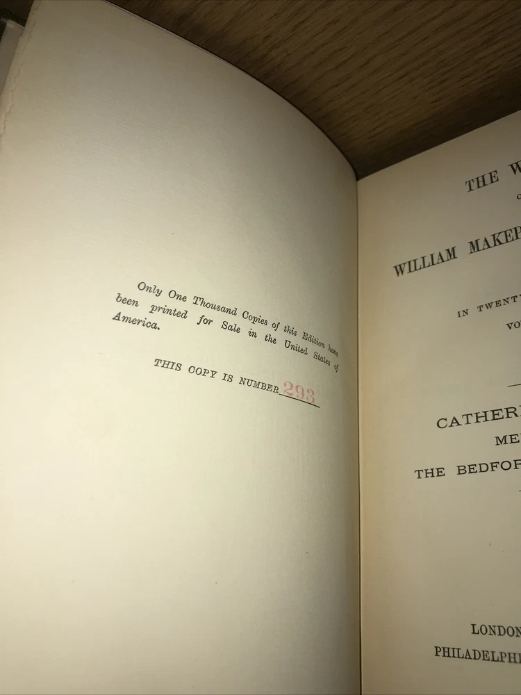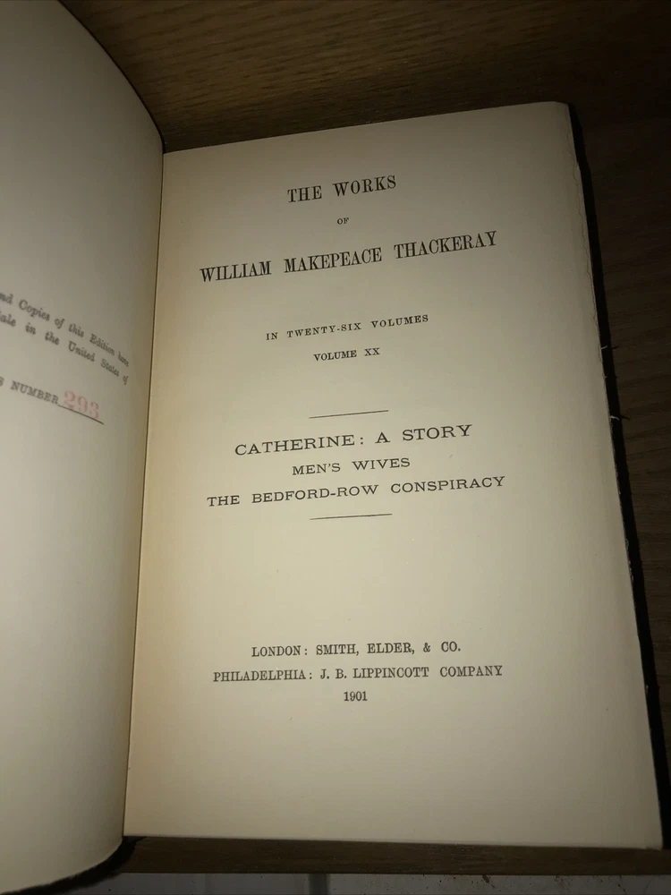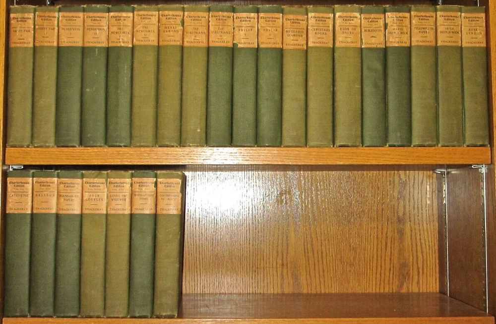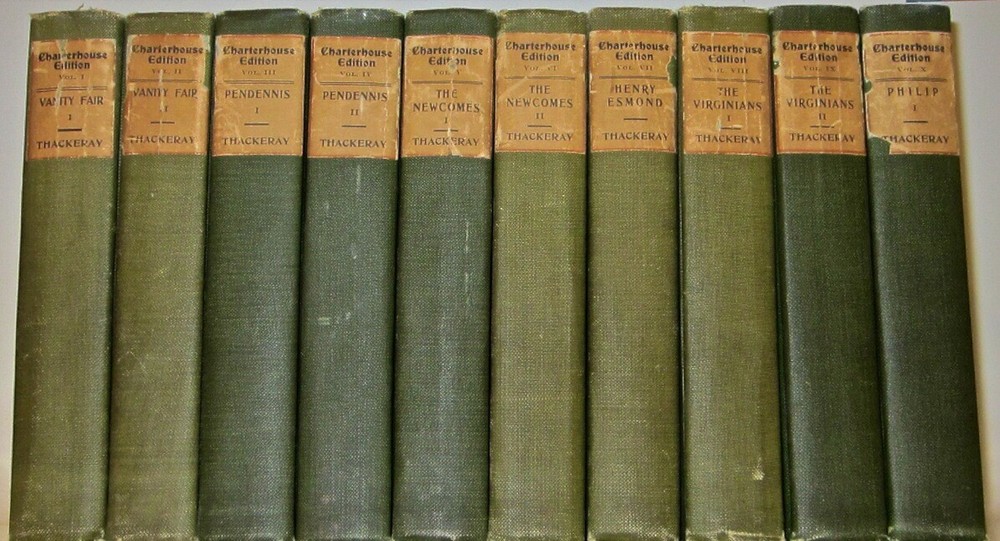 Complete in 26 volumes. Stated in the title pages. 26 is common for Thackeray. Charterhouse Edition. 1/1000 sets. Rag paper. Illustrated. Large volumes. 9 inches tall. Quality rag paper. Bindings are original. The bindings have generalized usage wear. Uneven spine coloring. This set has a lot of generalized external wear. Please be comfortable with the appearance before purchasing this set. Quality rag paper. The paper is still very fresh. This would make a good reading set. In his day, Thackeray was second only to Charles Dickens. Approximately 9 inches tall. This set will be well protected for shipping via Priority Mail. Please see my other listings for similar books. 2022.04.04 .17 h sngls tl