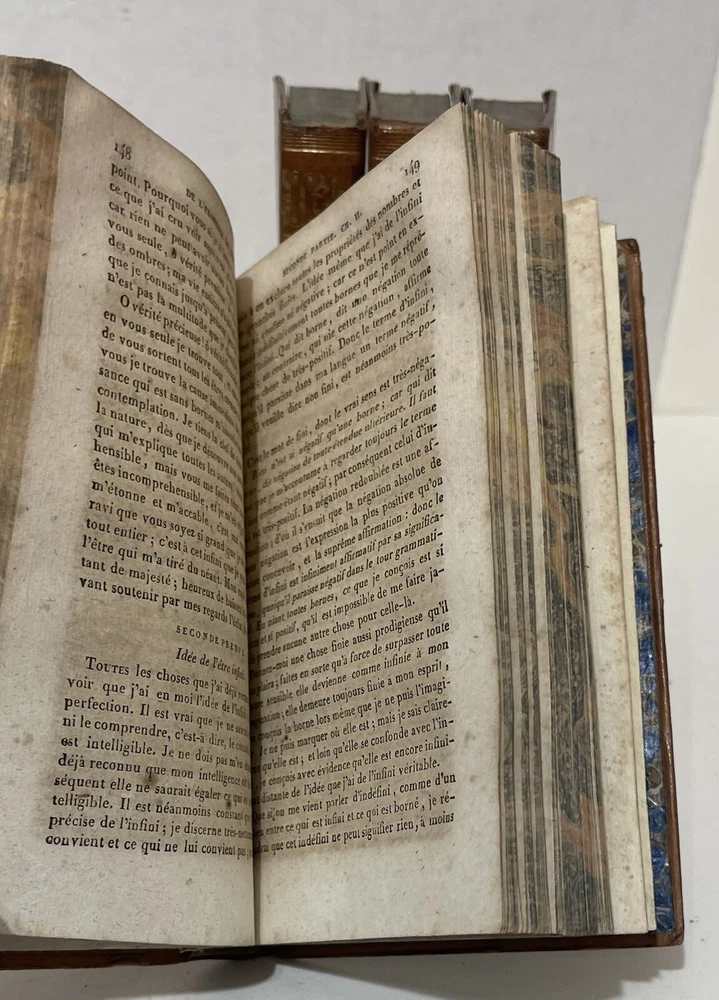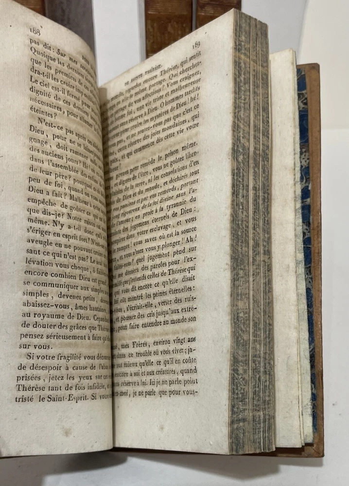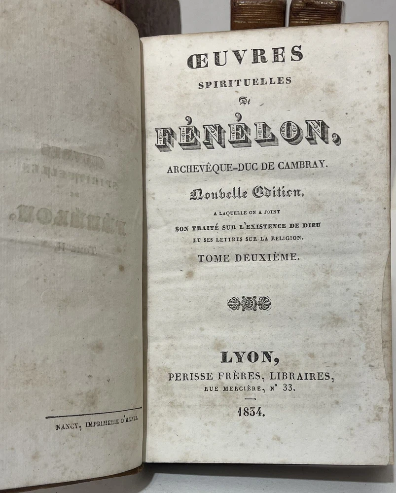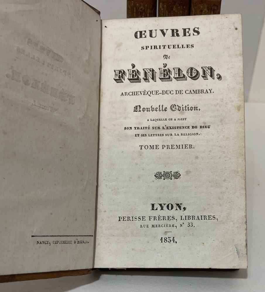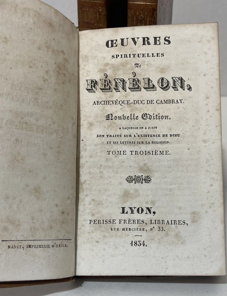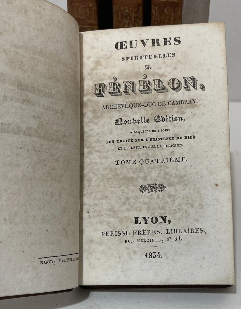 Dive into the spiritual wisdom of Francois Fenelon with this complete set of "Oeuvres Spirituelles" from 1834. Published by PERISSE FRÈRES, LIBRAIRES, the four volumes are bound in elegant leather, testament to the craftsmanship of the era. Fenelon's insightful writings on religion and spirituality are presented in their original French, offering readers a glimpse into the profound thoughts of an 18th-century spiritual giant. Each book in this set is a treasure of historical and cultural value, emanating from Lyon, France. The themes explored within speak to the core of religious and spiritual inquiry, making it a compelling addition to any collection focused on the subject. The set is an original edition, with minor to heavy foxing , exuding an air of antiquity that will captivate scholars, collectors, and enthusiasts of Fenelon's work.