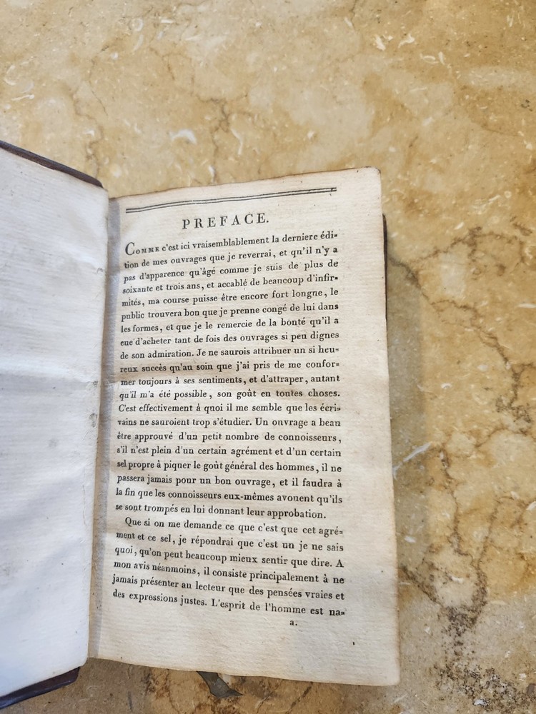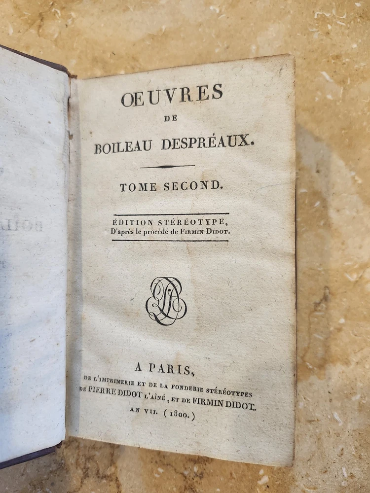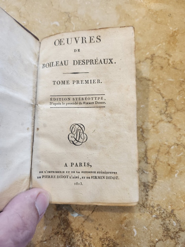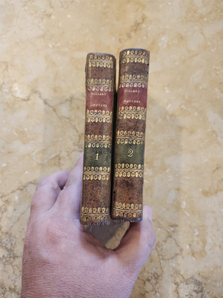 Up for sale is a 2 volume set of Oeuvres de Boileau Despreaux. It is a mixed edition. Vol 1 is 1813, Vol 2 is 1800. Both by the same printer. Pierre Didot, Paris. Both bound in the same antiquarian leather. In French. Approximately 3.5 5 inches. Overall VG condition. Minor cracking to the leather at spine on both volumes. Light browning / soiling to pages. Some warping to front board volume 2. Other dings here and there. A pretty nice set. Again, 2 volume set but of different printing dates. Please email with questions and see my store for other great items.