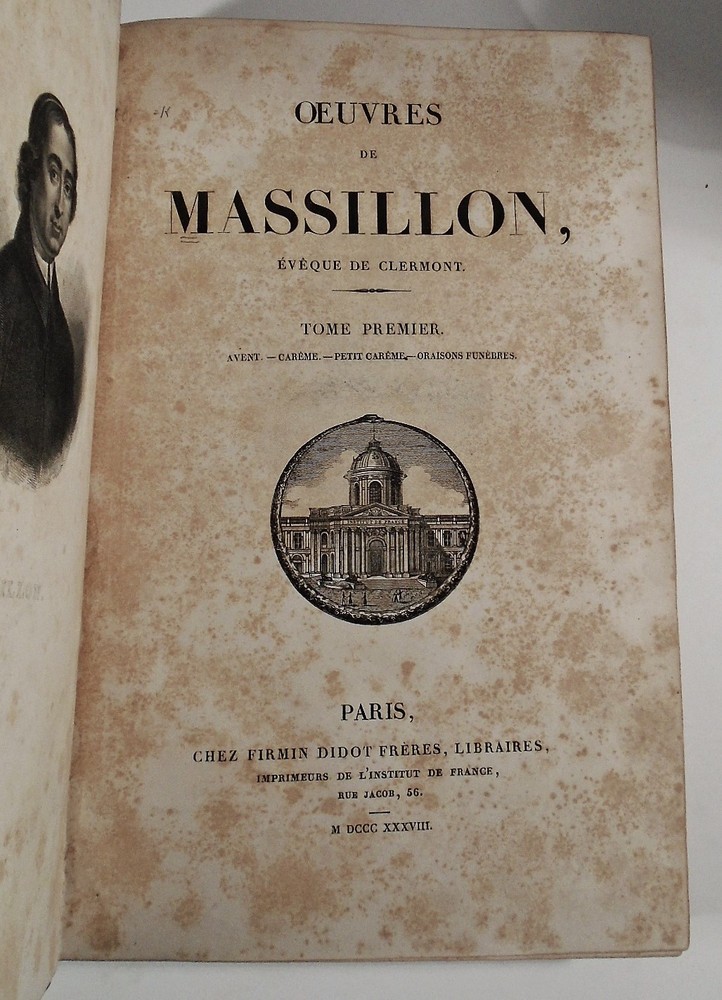 Oeuvres de Massillon, Evêque de Clermont. Complet en trois volumes. MASSILLON Published by Firmin Didot Frères, Libraires, Paris, 1838. Very Good set in five volumes, 3/4 leather, marbled boards. Textually very good, some foxing, hinges firm and clean, old theological bookplates at front pastedowns, small label at lower spines.