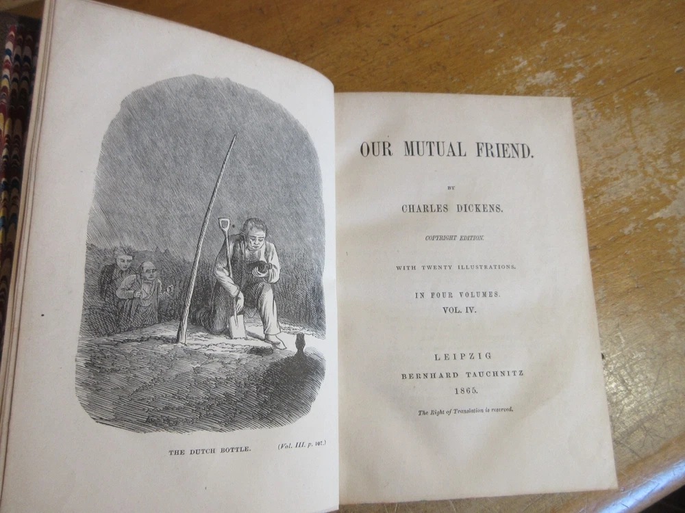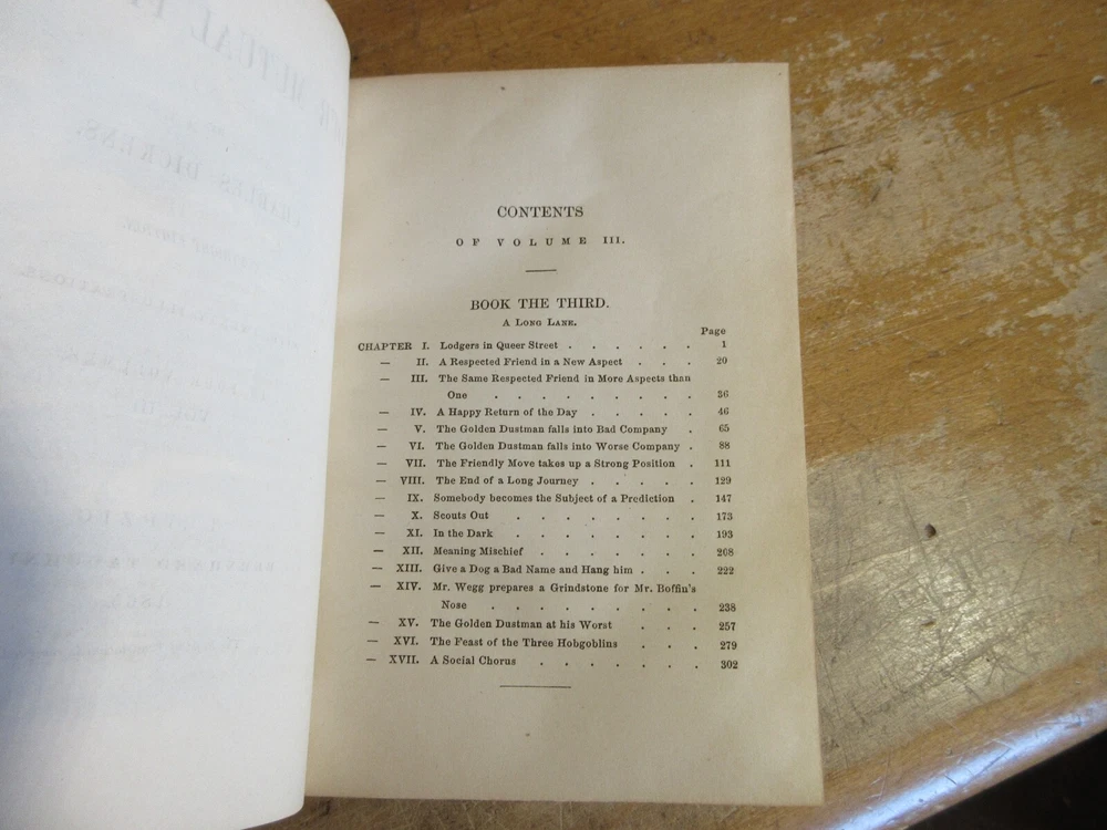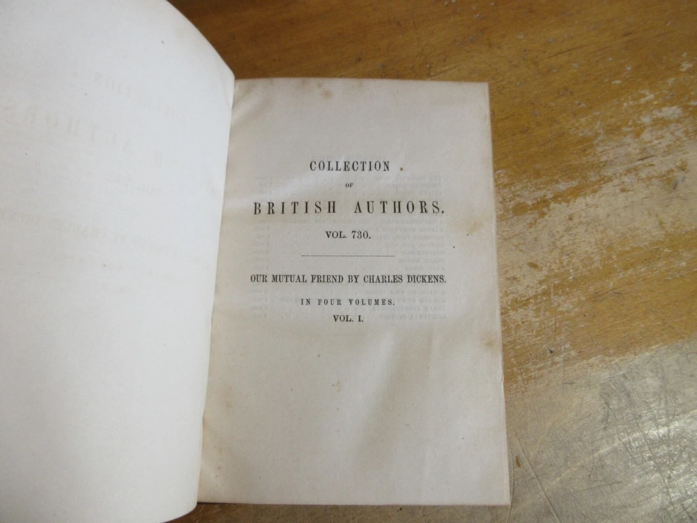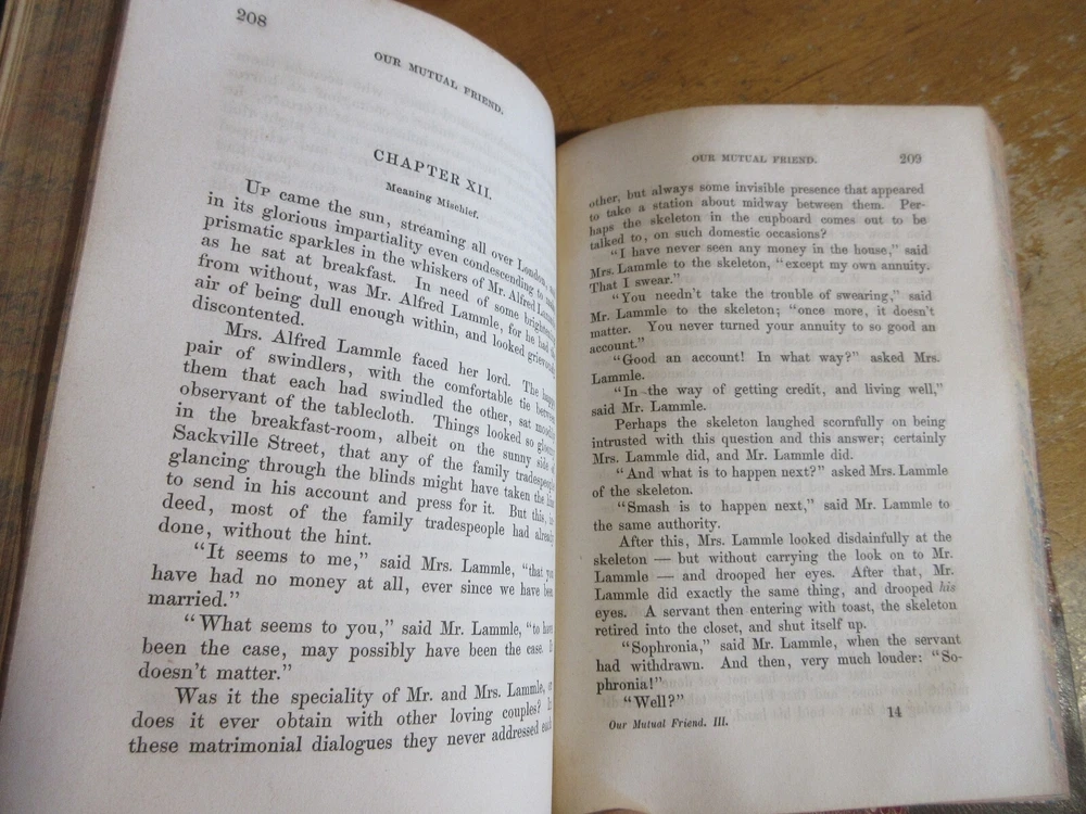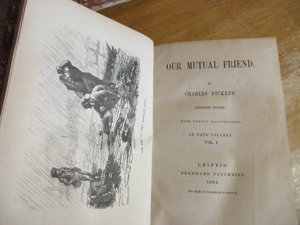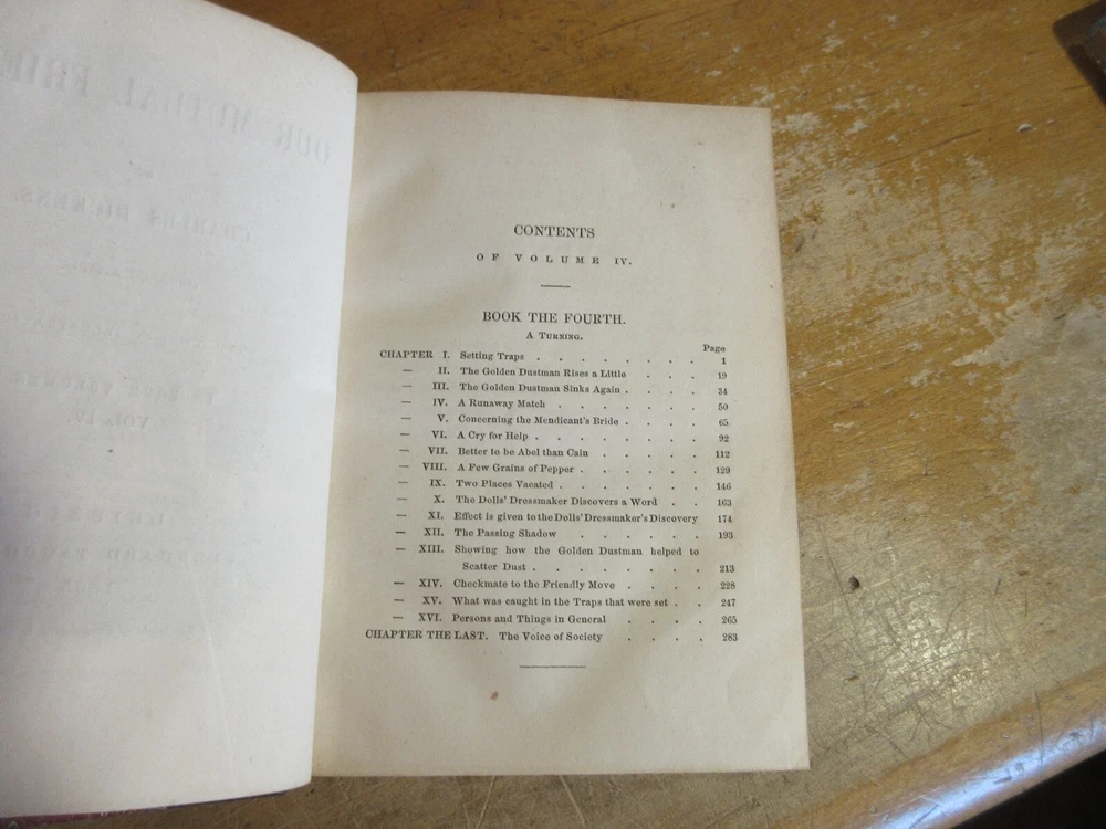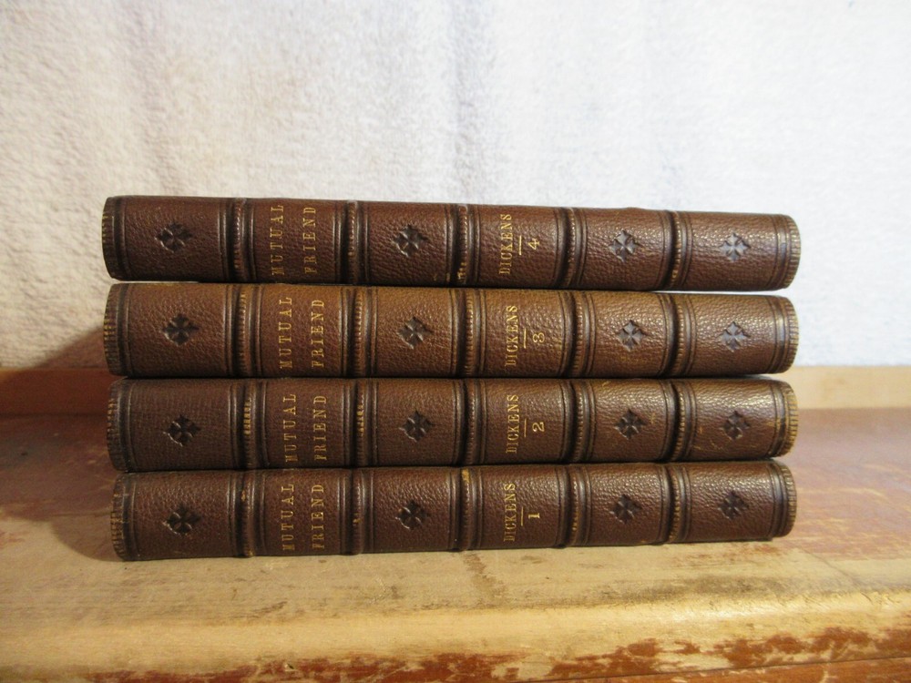 Here is a very interesting and hard to find set of “Our Mutual Friend” by Charles Dickens, in 4 volumes, Volume 1 published in 1864 and Volumes 2-4 published in 1865. These leather bound books are in very good condition, minor cover and spine wear, tight bindings and hinges, pages have some foxing and stains. Check out some of the interesting contents in these books! They measure approximately 4 ¾” x 6 ½” and contain 321, 318, 318 and 295 pages. A great set for any collection!