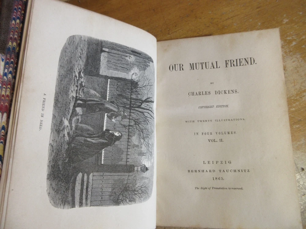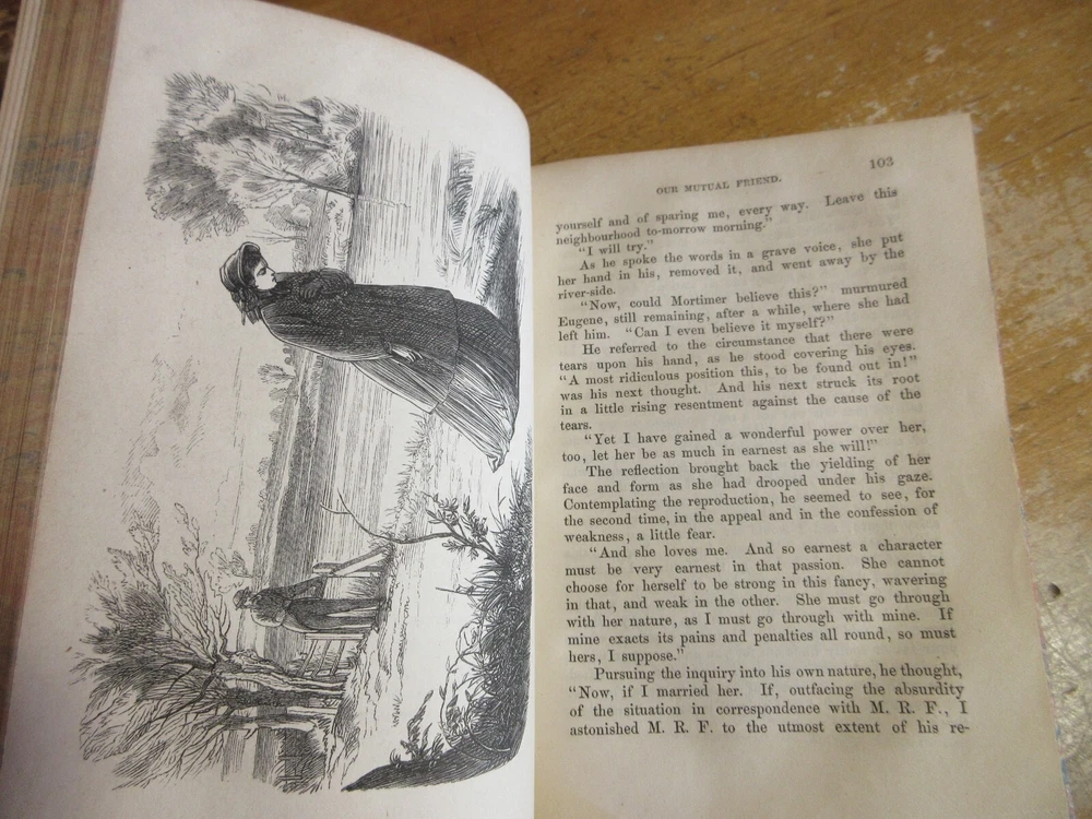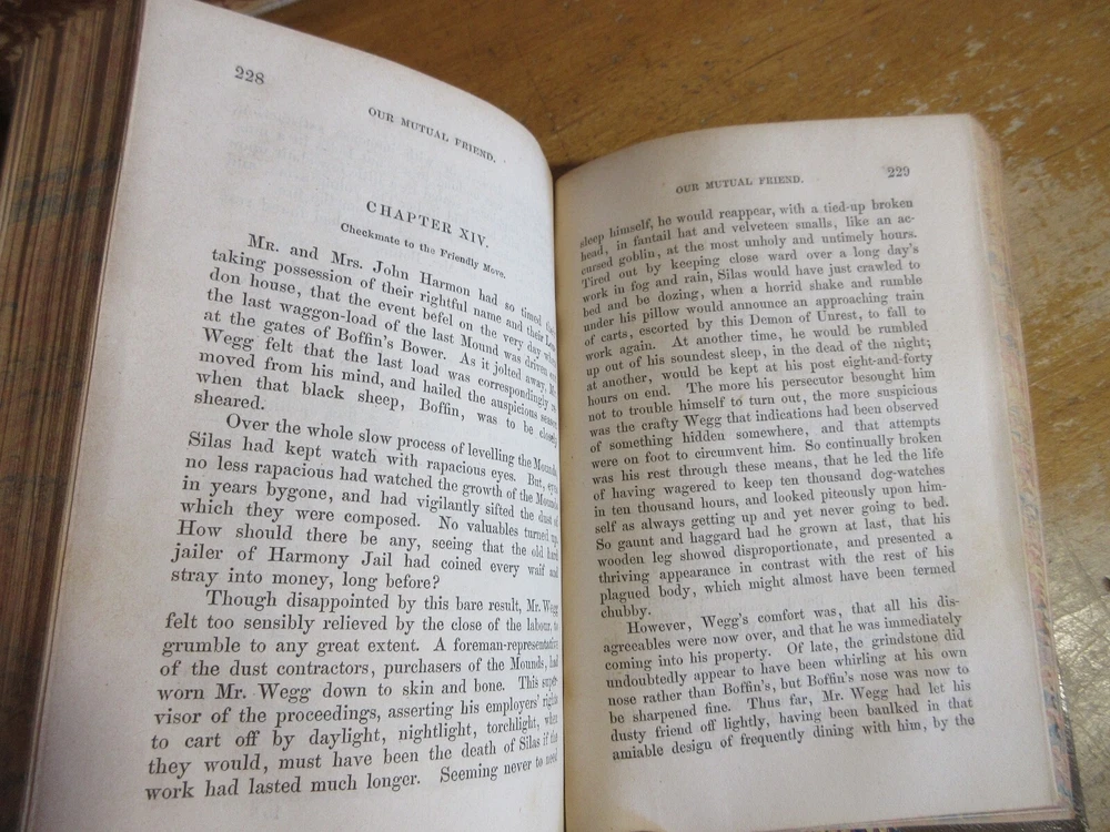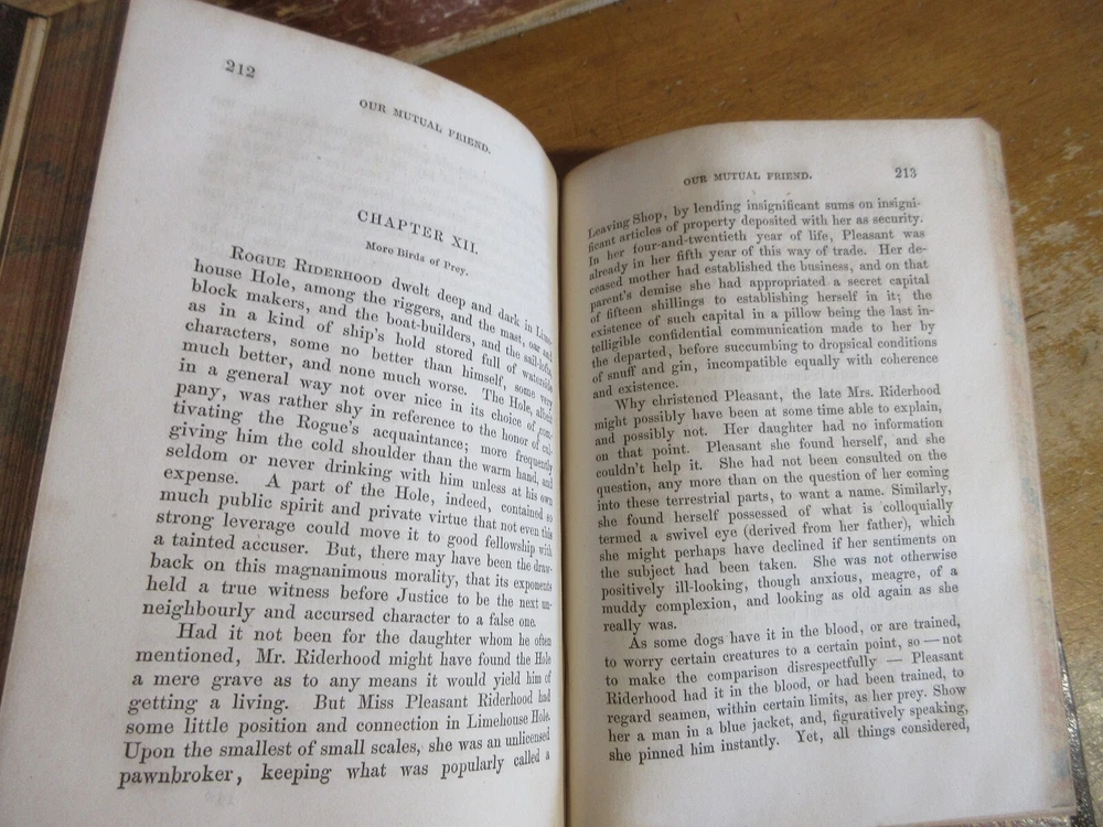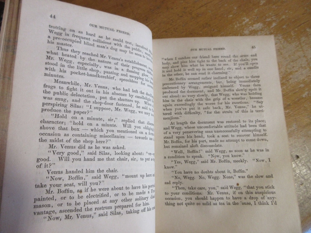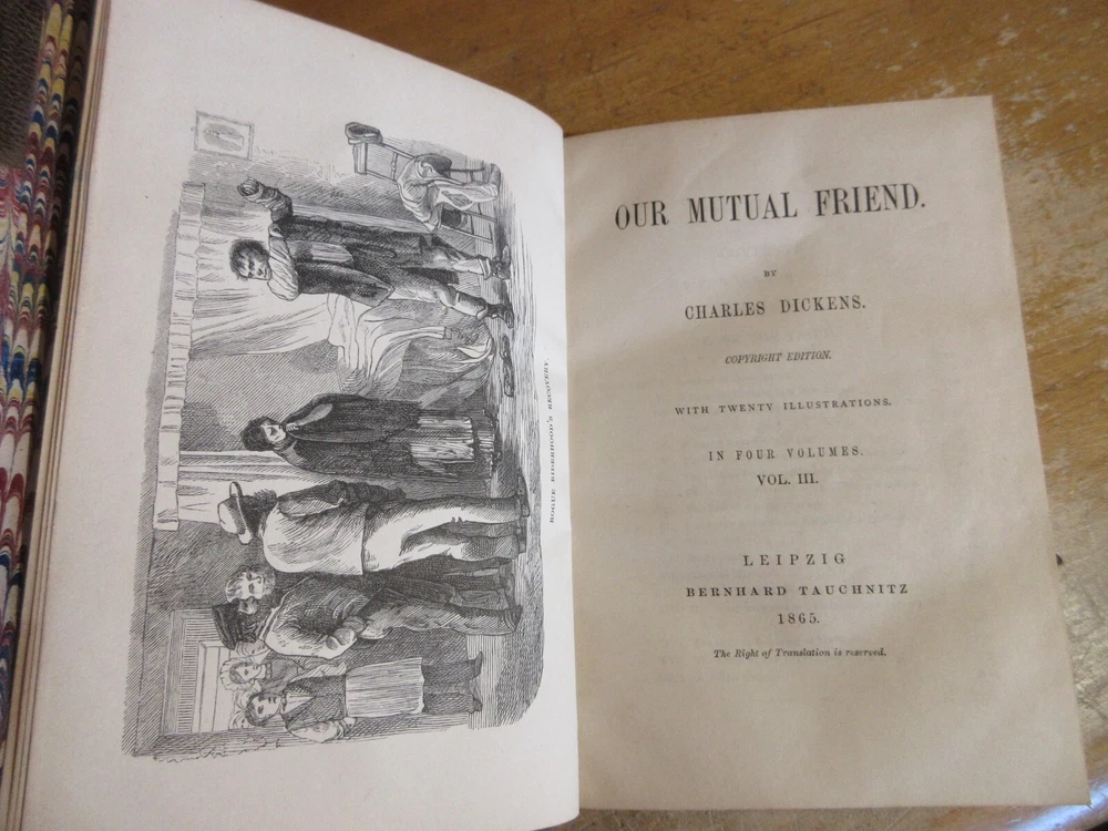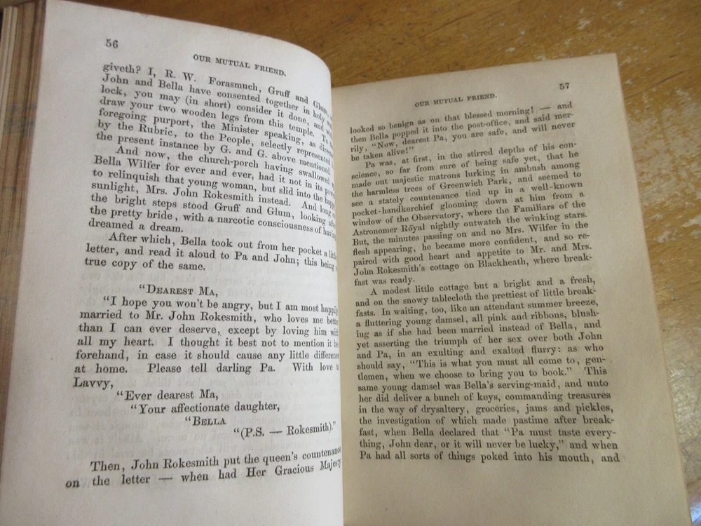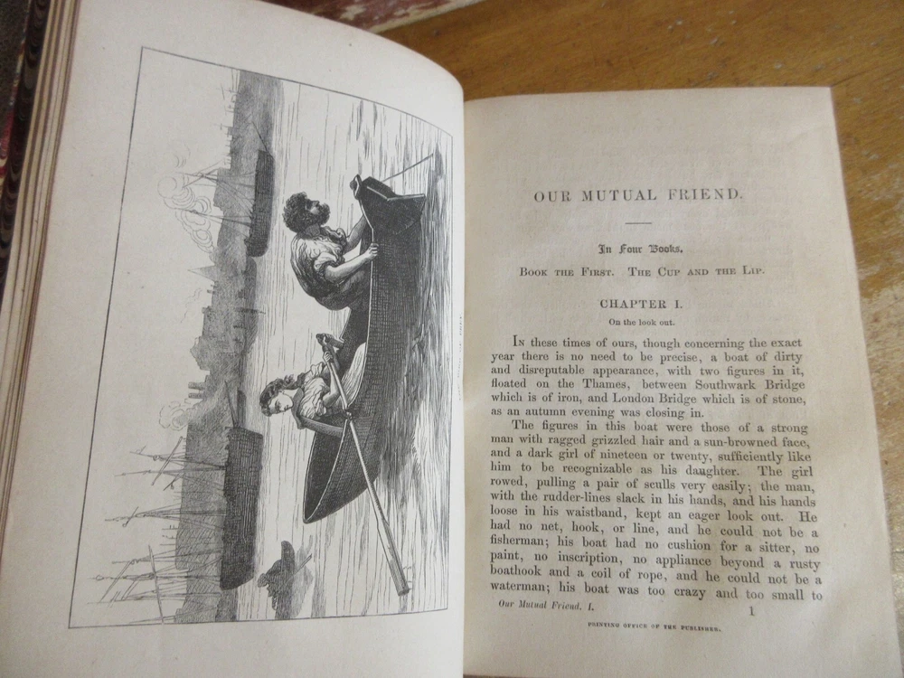 Here is a very interesting and hard to find set of “Our Mutual Friend” by Charles Dickens, in 4 volumes, Volume 1 published in 1864 and Volumes 2-4 published in 1865. These leather bound books are in very good condition, minor cover and spine wear, tight bindings and hinges, pages have some foxing and stains. Check out some of the interesting contents in these books! They measure approximately 4 ¾” x 6 ½” and contain 321, 318, 318 and 295 pages. A great set for any collection!