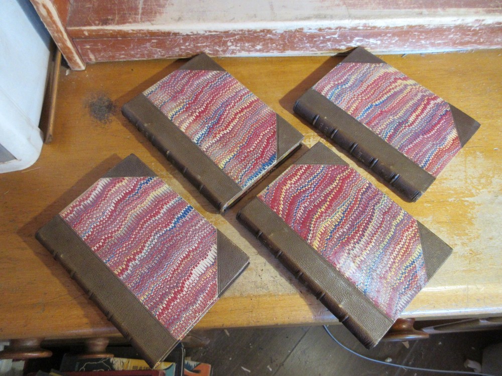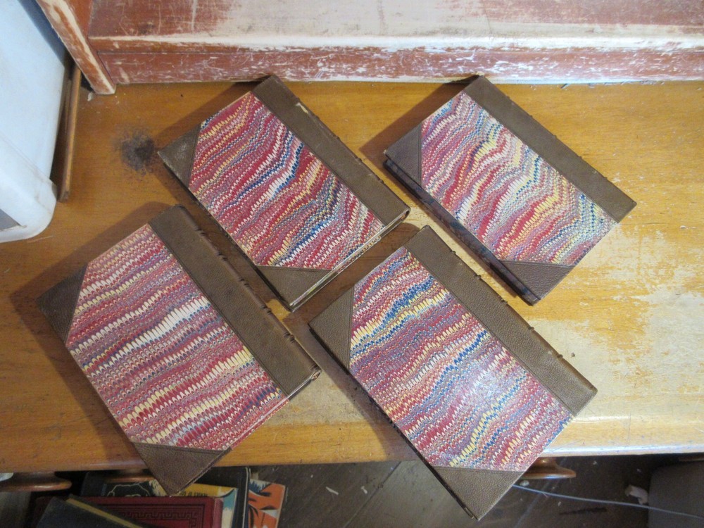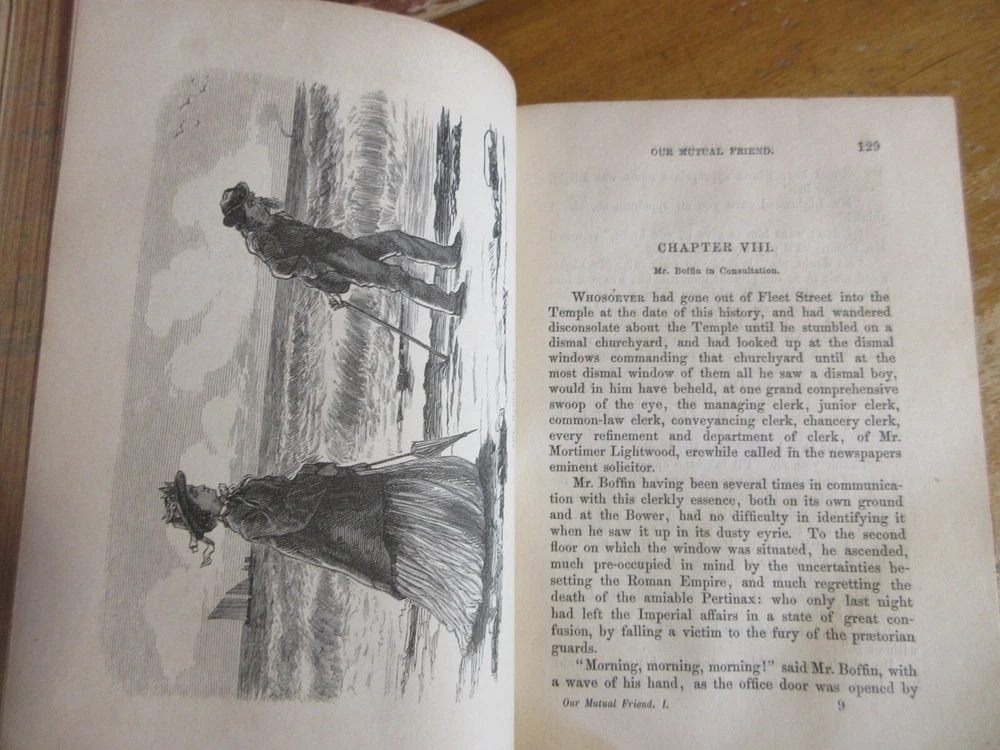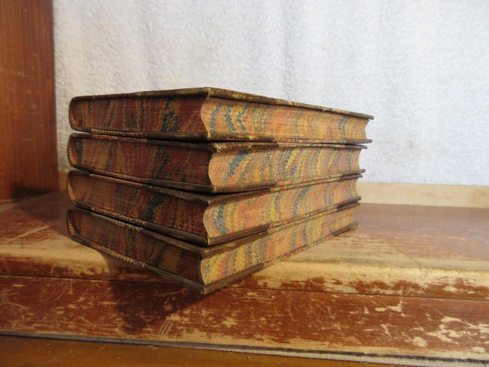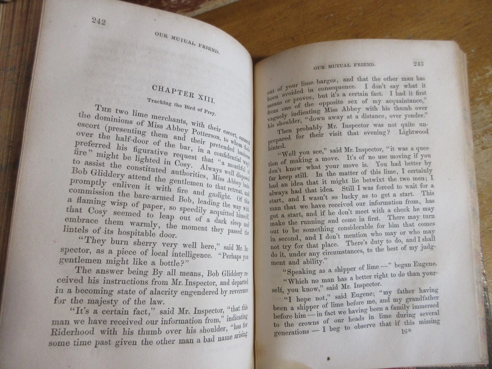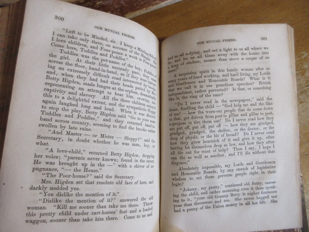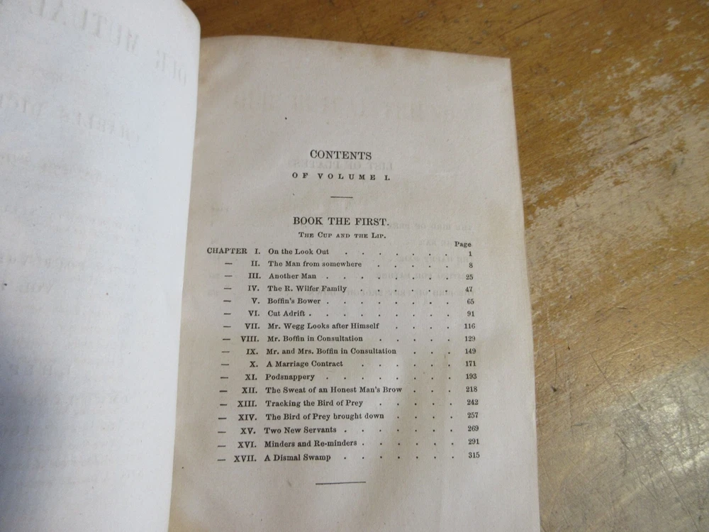 Here is a very interesting and hard to find set of “Our Mutual Friend” by Charles Dickens, in 4 volumes, Volume 1 published in 1864 and Volumes 2-4 published in 1865. These leather bound books are in very good condition, minor cover and spine wear, tight bindings and hinges, pages have some foxing and stains. Check out some of the interesting contents in these books! They measure approximately 4 ¾” x 6 ½” and contain 321, 318, 318 and 295 pages. A great set for any collection!