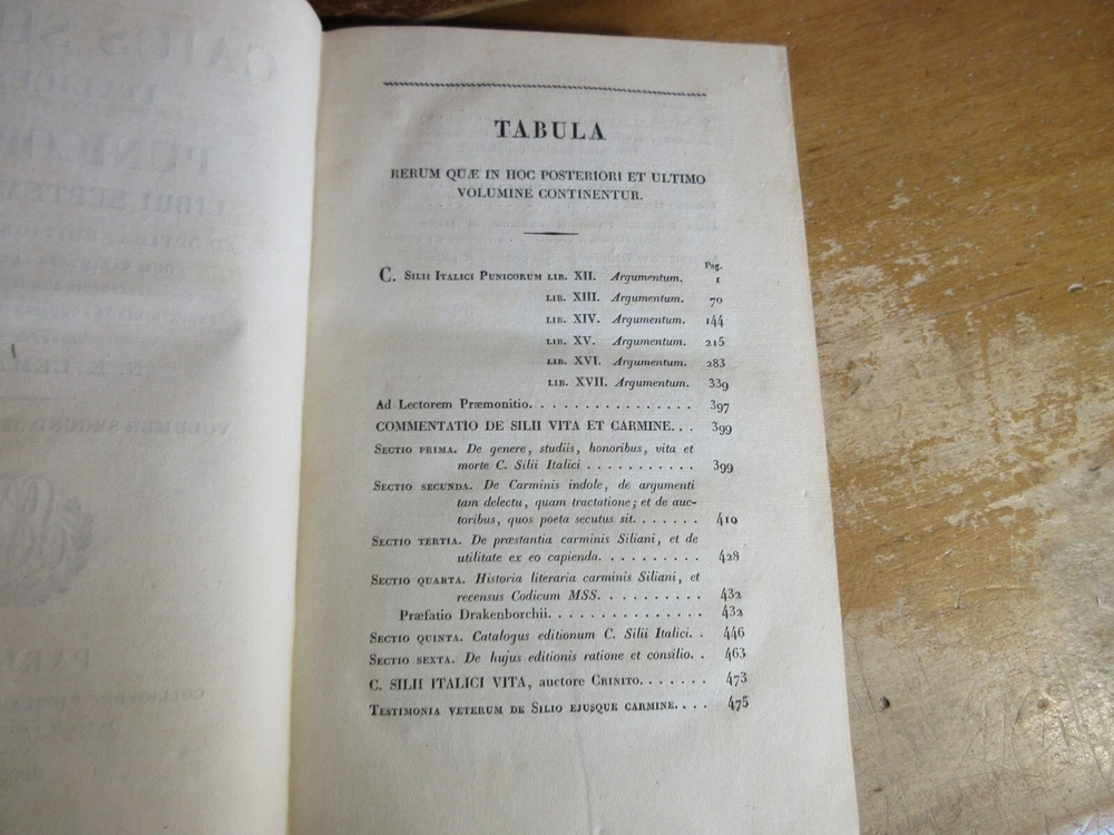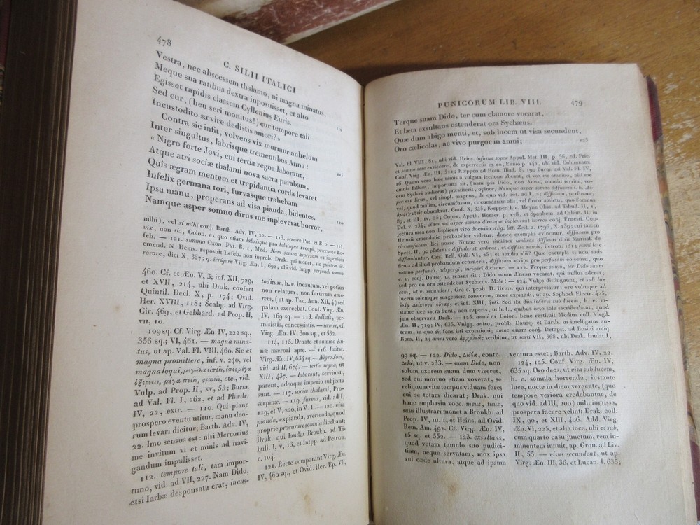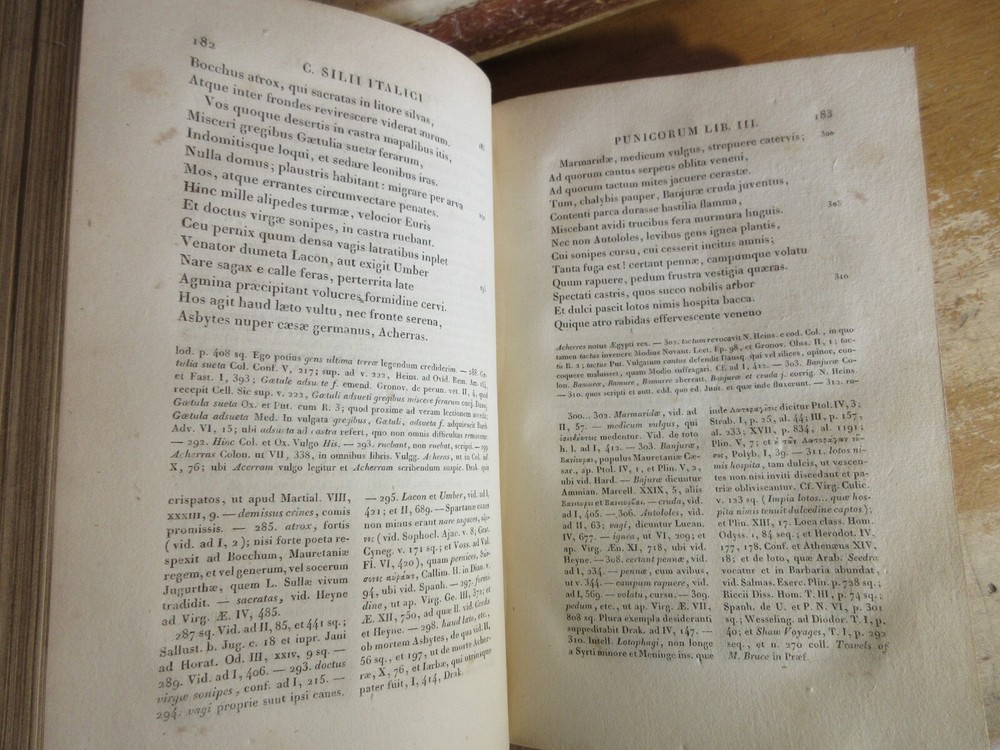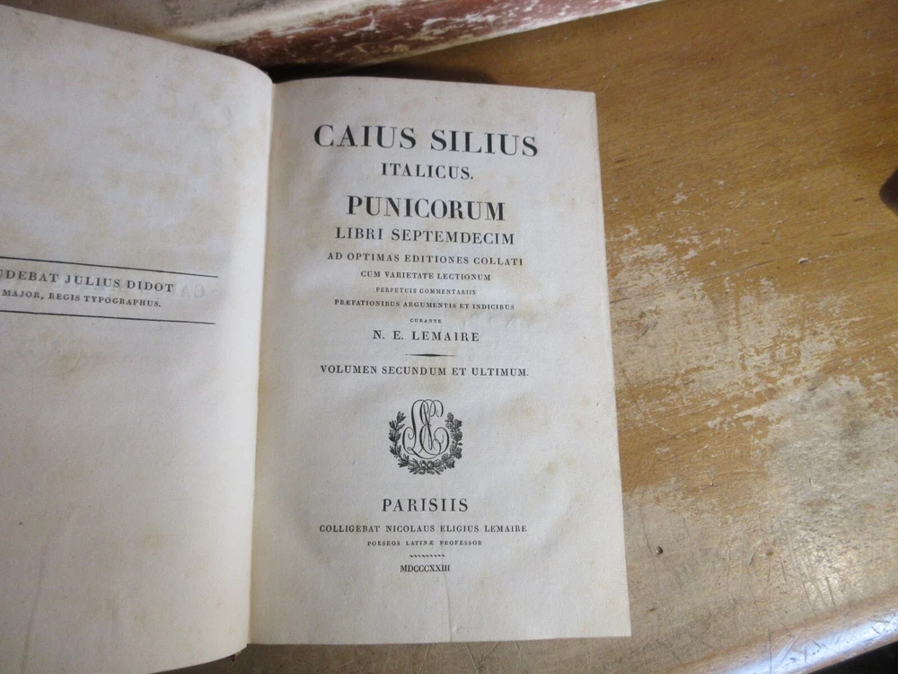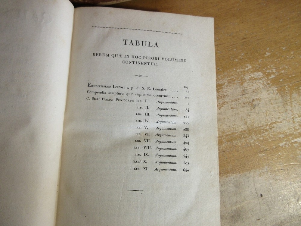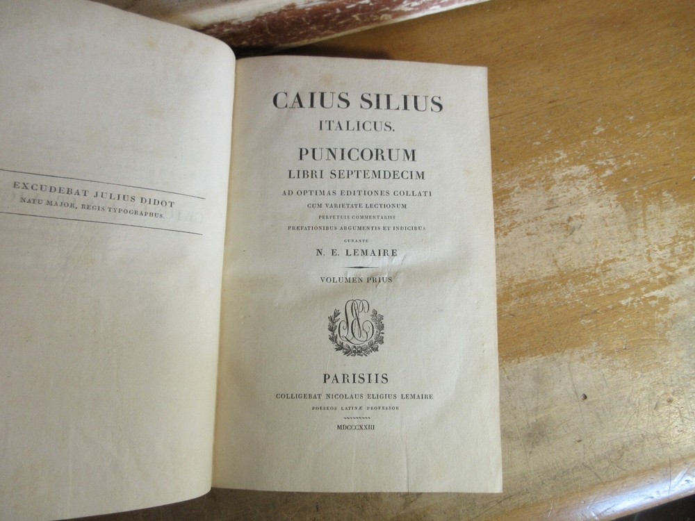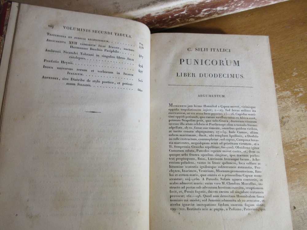 Here is a very interesting and hard to find set of “Caius Silius Italicus. Punicorum Libri Septemdecim” in 2 volumes, published in 1823. These leather bound books are in good condition, some cover and spine wear, labels on the spines, tight bindings and hinges, pages have some foxing and stains, there is a bookplate inside each of the front covers and an ink library stamp on the front end papers. Check out some of the interesting contents in these books! They measure approximately 5 ½” x 8 ½” and contain 688 and 678 pages. A great set for any collection! I will be starting more $.99 book auctions every night. There are many books on medicine, agriculture, manufacturing, illustrated books, maps, American history, ancient history, religion, philosophy, animals, science, etc. I'm happy to combine shipping. Be sure to check out my other items!!