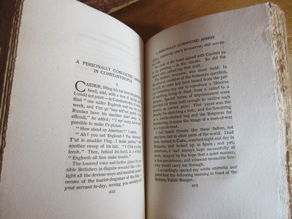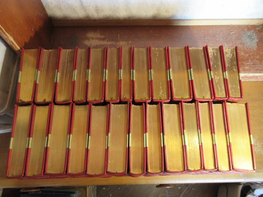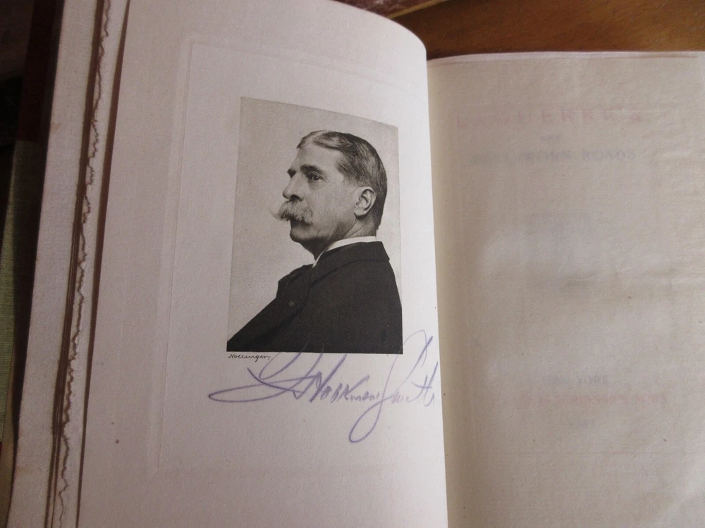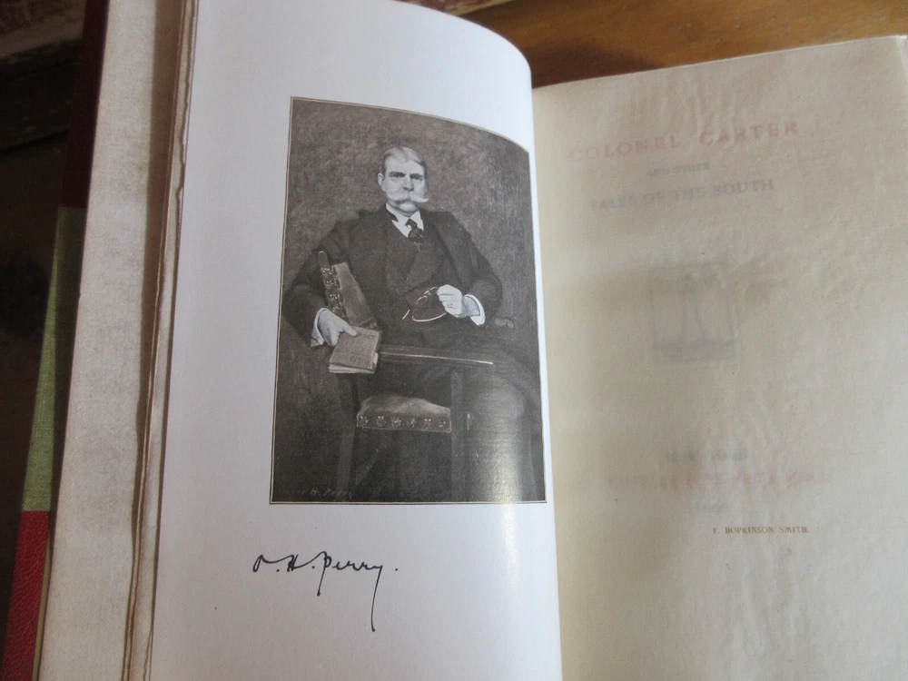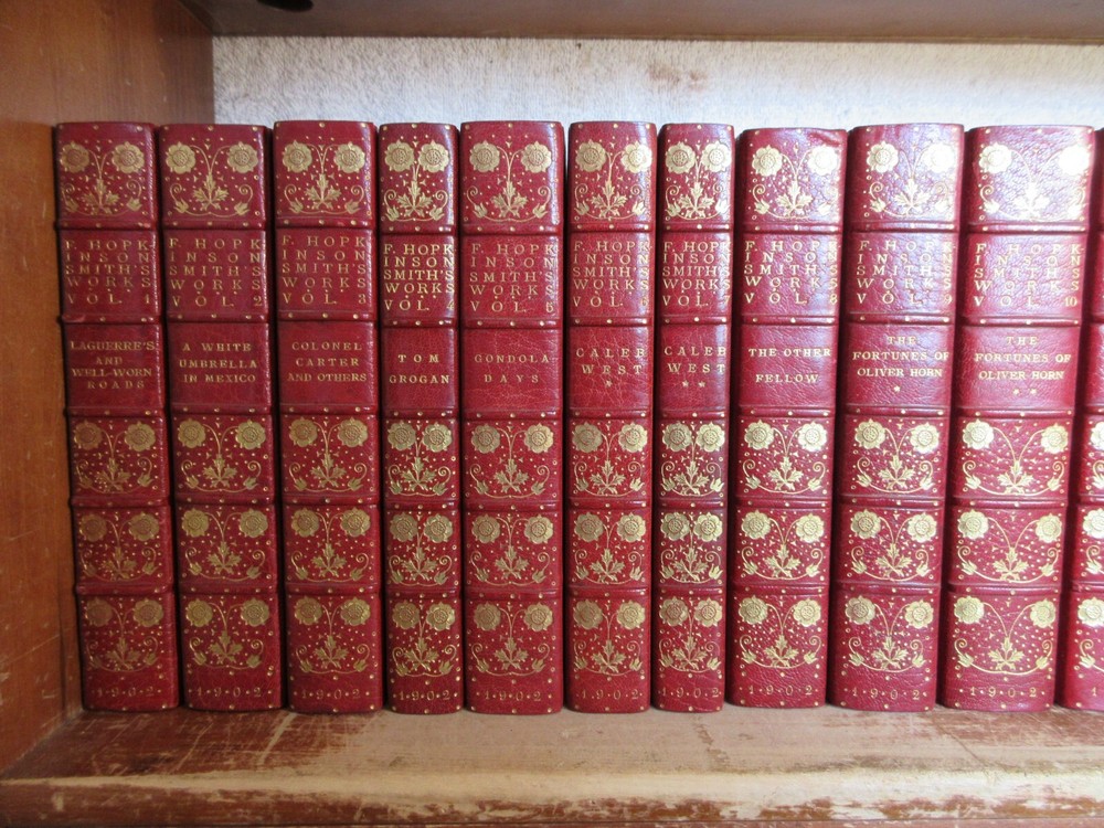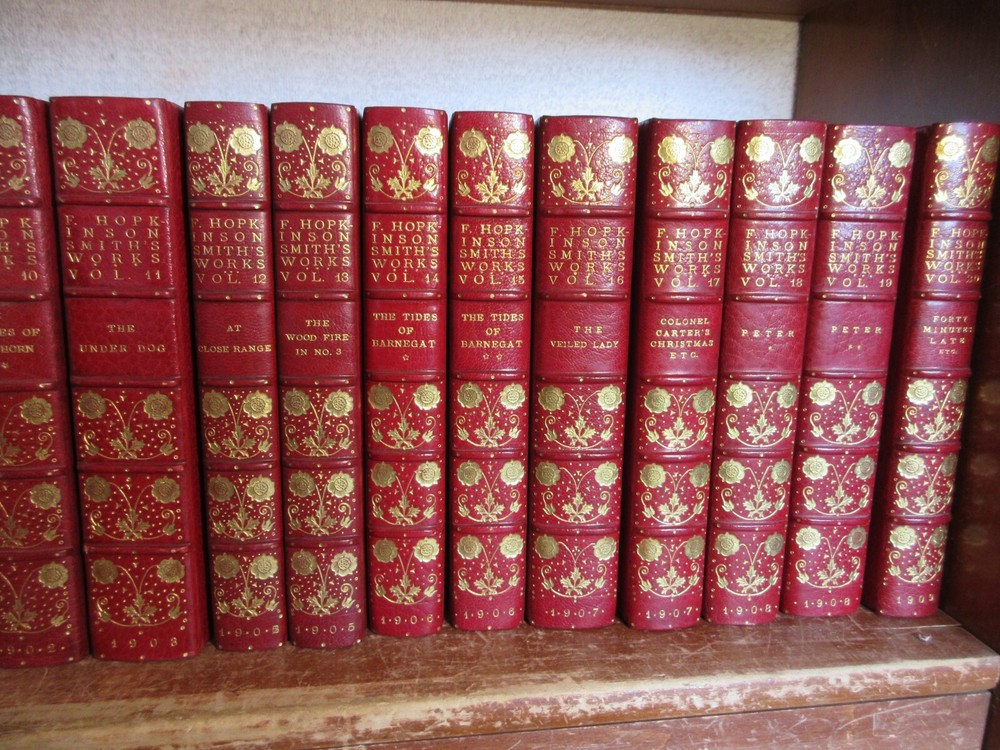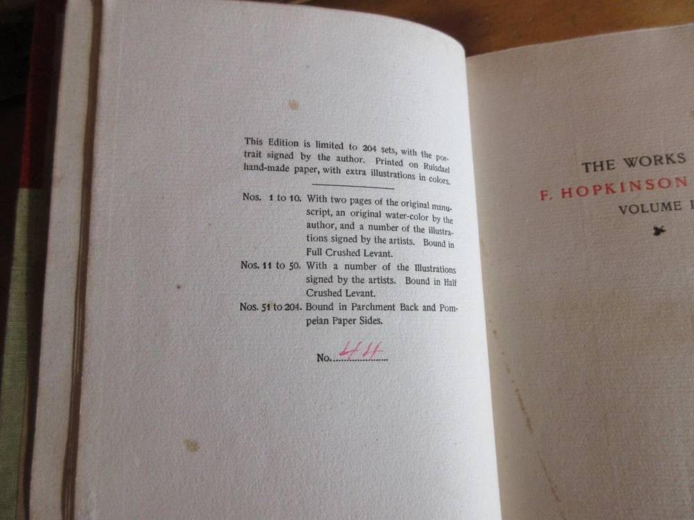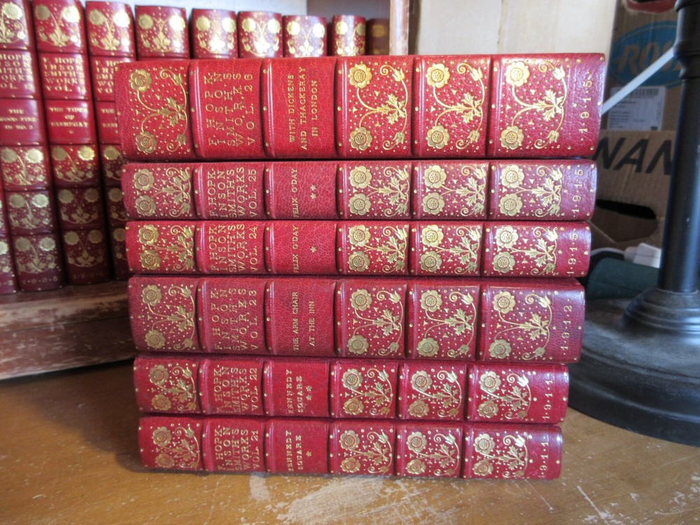 Here is a very interesting and hard to find set of “The Works of F. Hopkinson Smith” in 26 volumes, limited edition #44 of 204 sets, signed by F. Hopkinson Smith and some of the illustrators, published in 1902-1915. These leather bound books are in very good condition, minor cover and spine wear, tight bindings and hinges, pages are fairly clean. Check out some of the interesting contents in these books! They measure approximately 5 ½” x 8 ¼”. A great set for any collection!