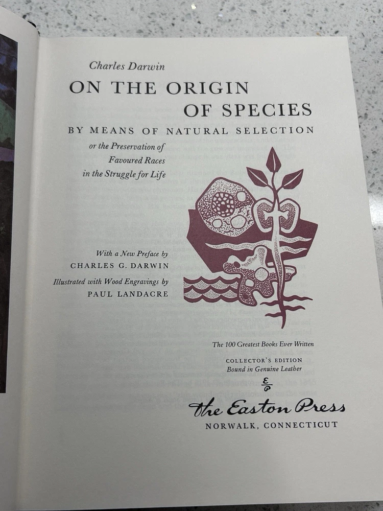 The product is a collector's edition of "On the Origin of Species" by Charles Darwin, published in 1976 by Easton Press. This limited edition features a leather binding and illustrations by Paul Landacre. It is a valuable addition to any collection of scientific and medical classics, particularly for those interested in the works of Charles Darwin and the theory of evolution. This original edition, printed in English, showcases the beauty and significance of Darwin's groundbreaking work in the field of science.