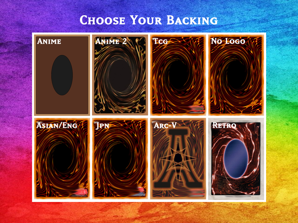 This set includes all the 8 cards you see in the pictures. You can choose between 8 different card backing styles (You should tell by messages which one you want, not receive a message means that cards will be created with ANIME BACKING). The size is exactly 59X86 mm, common rarity. Free shipping from Italy!