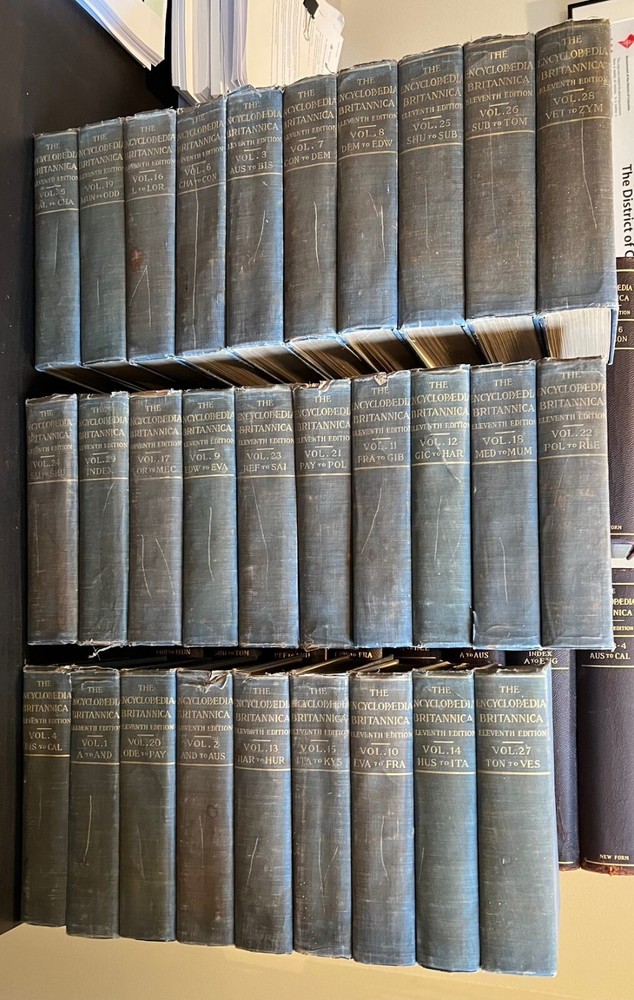 This is a complete set of the 1911 Encyclopedia Britannicain 29 Volumes, a valuable reference for any collector or enthusiast. Itcontains a wealth of information on various topics, including science, history,and literature. The set is in great shape and has been well-preserved over theyears. It would make a wonderful addition to any library or collection.