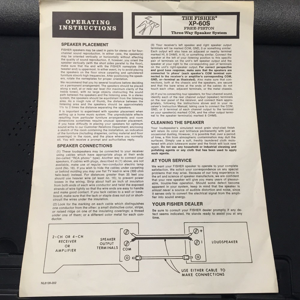Up for sale is a factory issued Owner's Manual for the Fisher XP-60S Three-Way Speaker Sytem . Fair to good condition , small tear along the front edge and creased across the middle. Two sides, front and back. Specs and schematic on back. Don't settle for hard to read pirated copies or PDF's. I charge a shipping fee so that I can combine shipping for those that want to take advantage of purchasing more than one item. Tired of your improperly packed purchases getting damaged in shipping? I pack with care. I use a full sheet of rigid protective material, a plastic sleeve, a 'Please Do Not Bend' sticker, and free Delivery Confirmation. All of my items are originals, I do not deal in reproductions. I am happy to ship internationally.