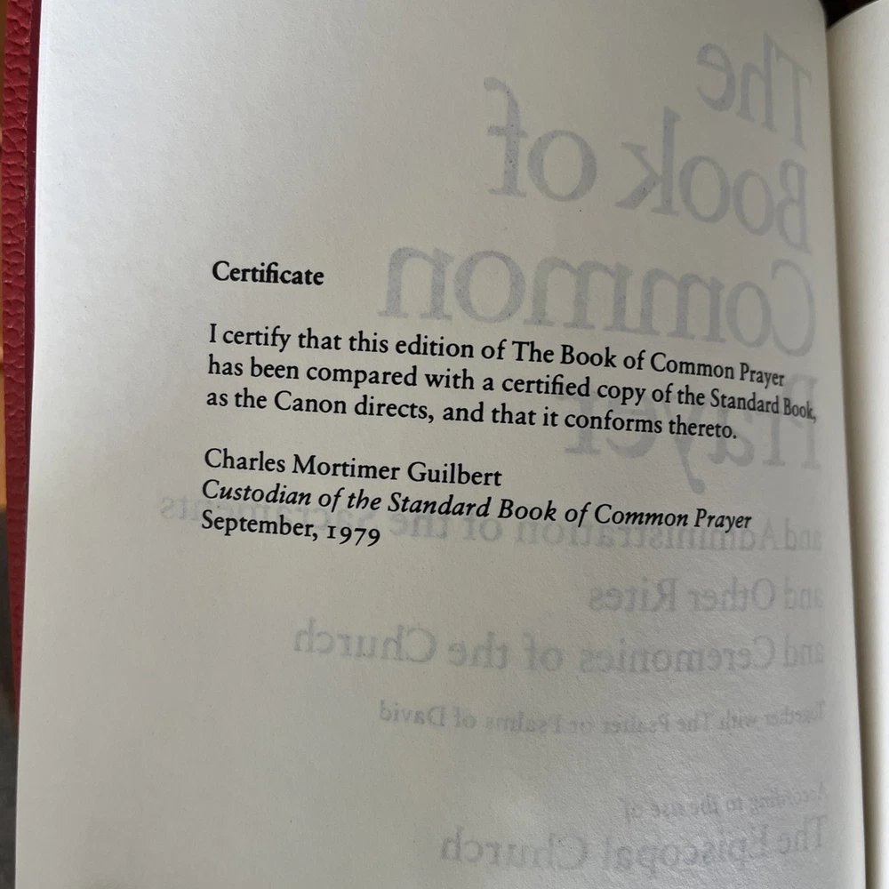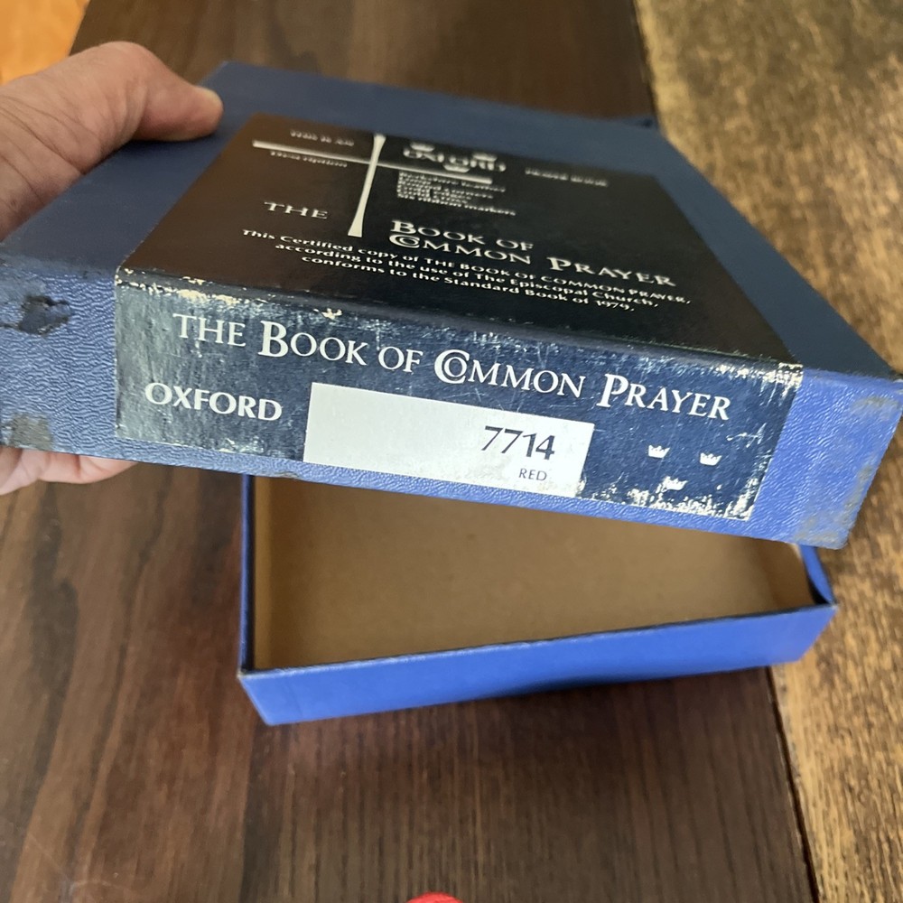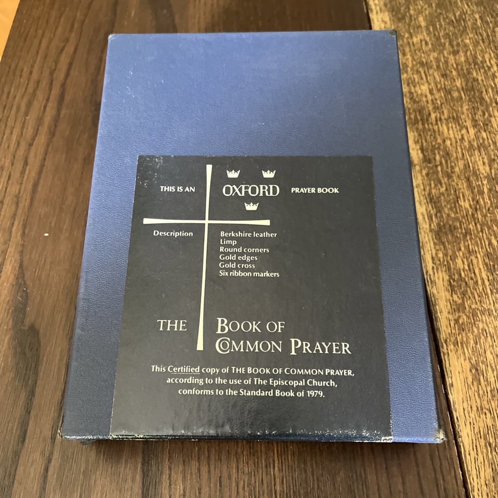 The product is a 1979 edition of "The Book of Common Prayer" by Oxford University Press. It features a red leather binding with gilt pages, making it a luxurious and visually appealing collectible. This English language prayerbook is a valuable item for those interested in religion and spirituality, with its boxed packaging showcasing a sense of tradition and elegance. Perfect for collectors or those seeking a beautifully crafted copy of a classic religious text.