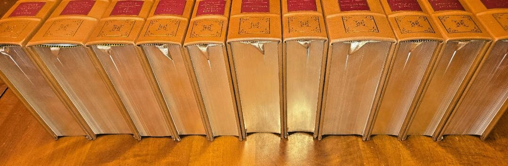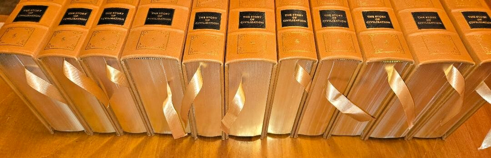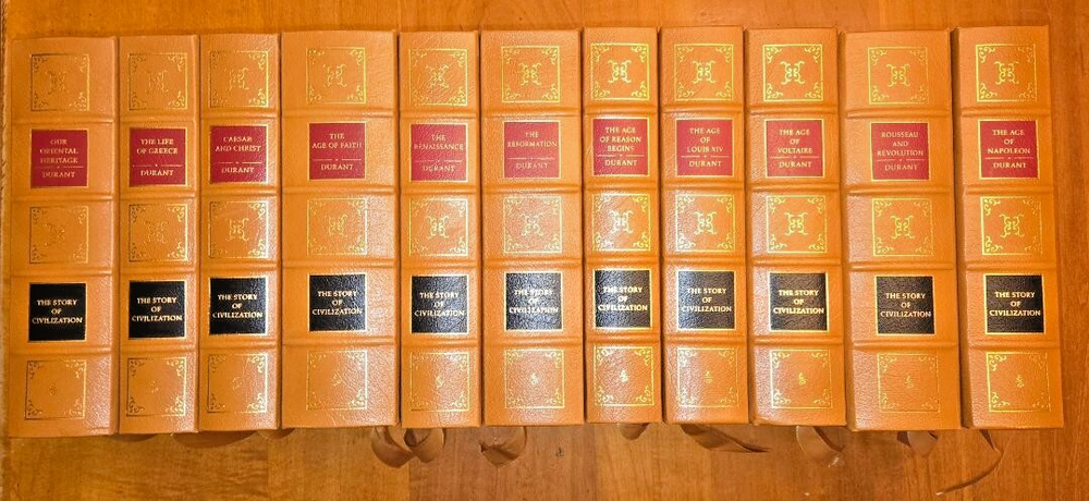 ***SPECIAL REDUCED SHIPPING WITHIN THE CONTINENTAL U.S.*** DON'T PAY OVER $1000...OR EVEN $900 FOR THESE HIGHLY ACCLAIMED, VERY COLLECTABLE BOOKS! Description: A SET OF ELEVEN EASTON PRESS BOOK TITLES, "The Story of Civilization," DURANT, 1992, leather bound, gilt edges, 22k yellow gold tooling. FROM A SMOKE FREE HOME. NO CRACKED BINDING, TORN PAGES, DENTED CORNERS OF ANY KIND. WEIGHT: 45 lbs. Height: 9 1/2" Depth: 6 3/4" THIS SET IN VIRTUALLY BRAND NEW, & UNUSED, WITH NO DEFECTS WHATSOEVER, NOT A SINGLE BENT, CREASED PAGE, OR CRACKED BINDING, & FROM A SMOKE FREE HOME TOO! $875 OR BEST OFFER ONLY $20 TO SHIP! The images show a complete set of "The Story of Civilization" by Will and Ariel Durant, consisting of 11 volumes. These books, published by Eaton Press in 1992, cover a comprehensive history of both Eastern and Western civilizations, with a particular emphasis on European history. The titles of the books, in order from left to right, are: Our Oriental Heritage The Life of Greece Caesar and Christ The Age of Faith The Renaissance The Reformation The Age of Reason Begins The Age of Louis XIV The Age of Voltaire Rousseau and Revolution The Age of Napoleon Each volume is leather bound in a uniform style, featuring a tan leather cover with gold lettering and design elements, and a black label with gold text indicating the title and author. The set is highly regarded for its detailed and engaging narrative, making history accessible to the general reader. "The Age of Faith," for example, explores the medieval period, covering Christian, Islamic, and Judaic cultures from 325 to 1300 AD. These books are often sought after by collectors and readers interested in a thorough exploration of world history. A GREAT OPPORTUNITY TO OWN THIS AMAZING COLLECTION OF BOOKS FROM THE PULITZER PRIZE WINNING AUTHOR, WILL DURANT. "BUY IT TODAY"...READ THEM TOMORROW!