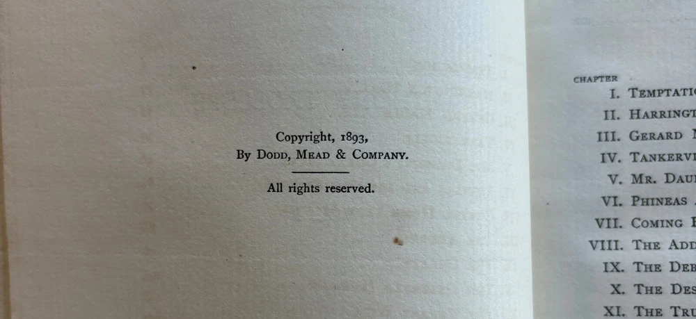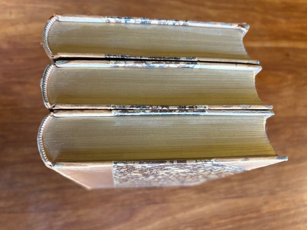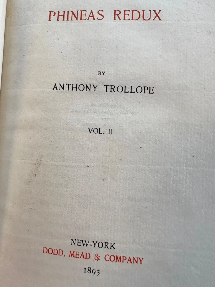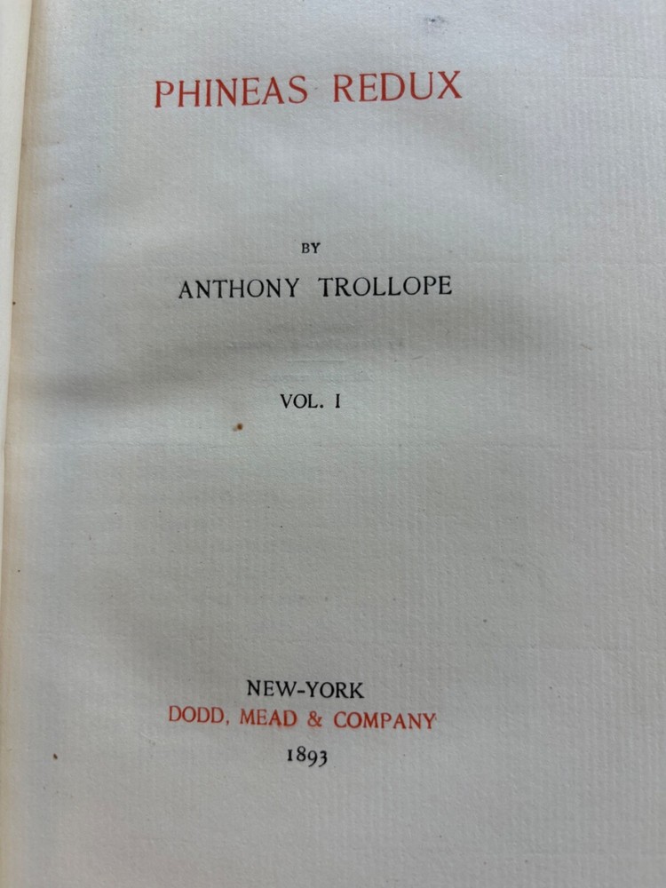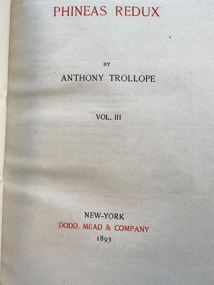 Up for sale is a 3/4" leather bound set of three books titled "Phineas Redux" by Anthony Trollope. Published by Dodd, Mead and Company, 1893, a numbered limited edition of 250 copies on Holland Hand made paper. This copy is number 249. The books have leather spines and corners. They are 5 1/2" by 8" in size. They are complete and in very good condition, with rub wear to the leather spines and corners. The inside pages are very clean, no markings. The binding is firm in each. Buyer to pay $8.00 for shipping. International buyers must use ebay global shipping. Box 28