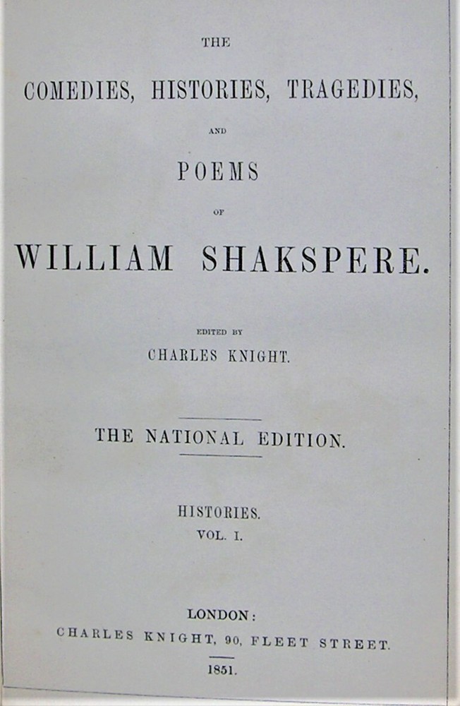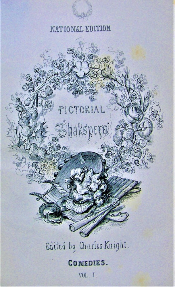Charles Knight's passion for Shakespeare resulted in an elaborately illustrated edition called Pictorial Shakespeare. Although intended for a popular audience, Knight's edition is a work of serious scholarship, gathering together in its extensive apparatus commentary on the textual, historical, and theatrical aspects of each play. Every drama begins with an 'Introductory Notice,' 'Historical Illustrations' being appended to the text and concludes with a 'Supplementary Notice' that is essentially interpretive. In his commentary Knight ranges over a number of concerns - discussions of the text, sources, literary criticism, costuming, medieval architecture, dating, the historicity of the events and characters dramatized, aspects of performance, and the like. Charles Knight (15 March 1791 – 9 March 1873) was an English publisher, editor and author.