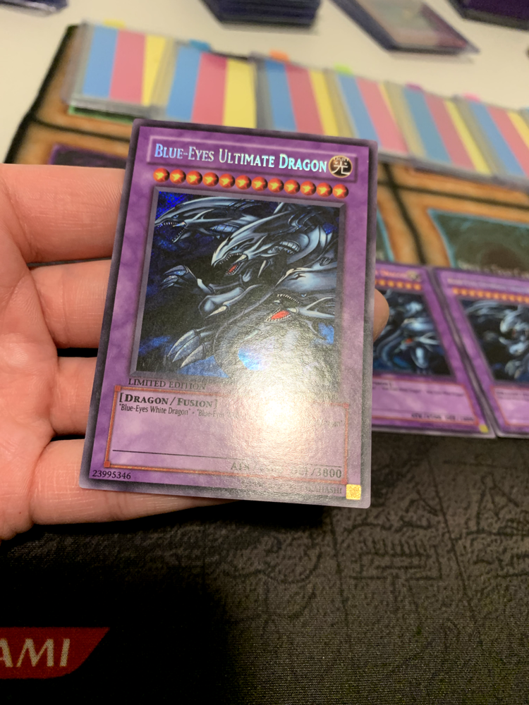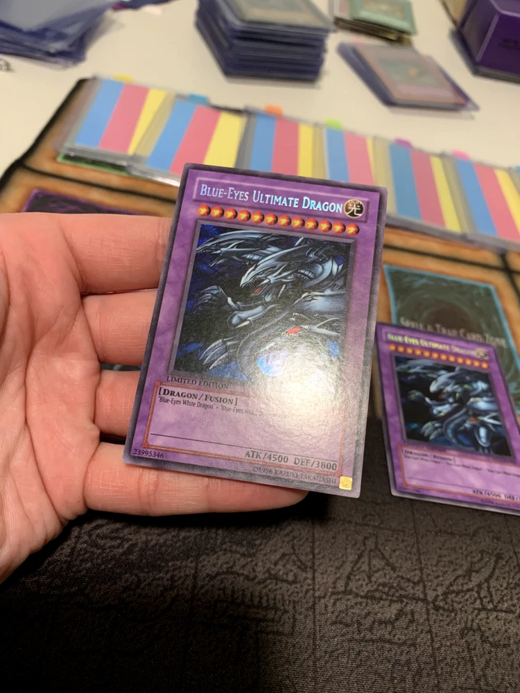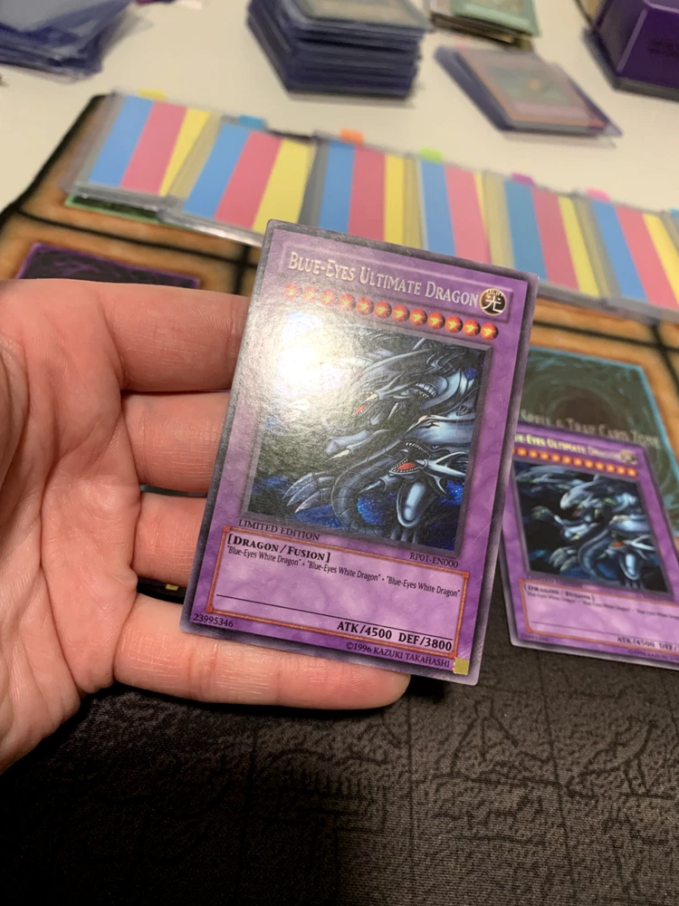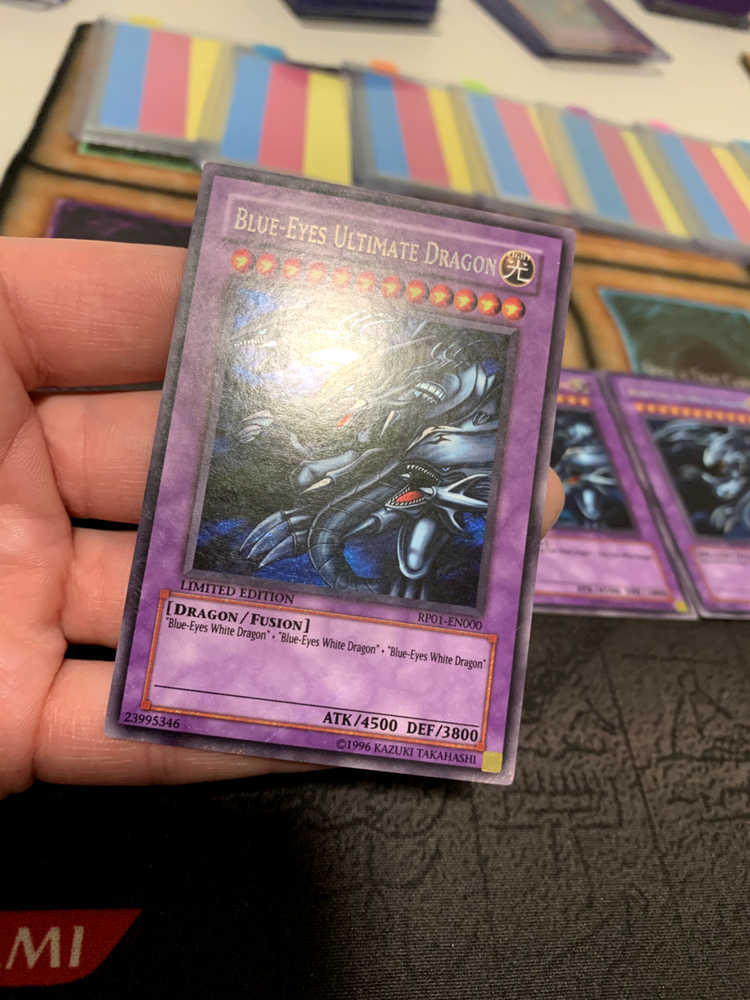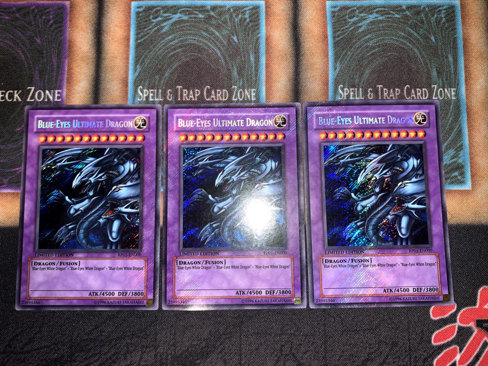 You will receive a playset (3x) of Blue Eyes Ultimate Dragon from RP01-EN. Cards range from lightly played to near mint depending on the grader since RP01 cards are usually in bad condition because of awful card stock. Card(s) ships with loving handle and care. From 1 collector to the next. If you buy multiple cards I combine shipping (request invoice), and love to offer discounts depending on how many items you want. Returning customers are always well taken care of. Ask any and all questions. Don’t mind my guitar fingertips! Thank you Tags Konami yugioh yu-gi-oh! Cyber dragon elemental hero ancient gear golem red eyes black dragon blue eyes white dragon dark magician exodia the forbidden one yugi kaiba joey pegasus mai marik tcg ocg ccg edison goat format nm vlp lp mp pl hp dmg played lightly moderately heavily damaged