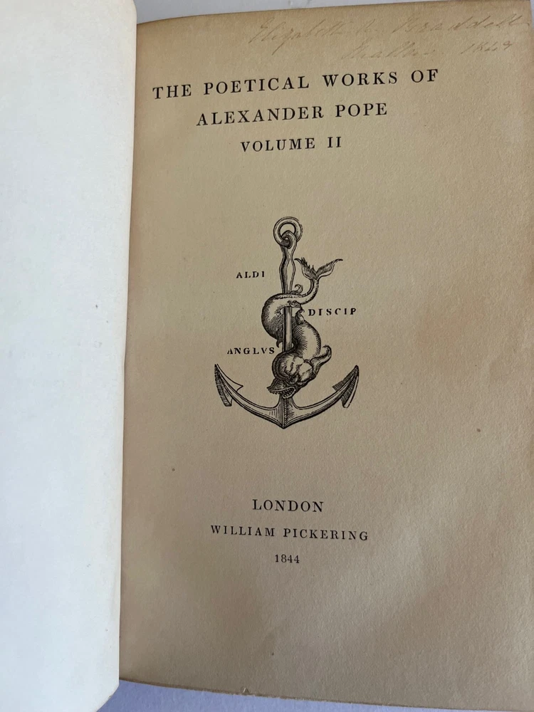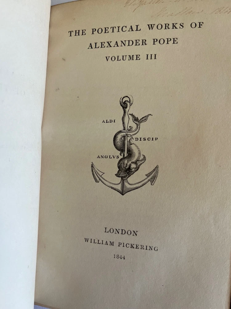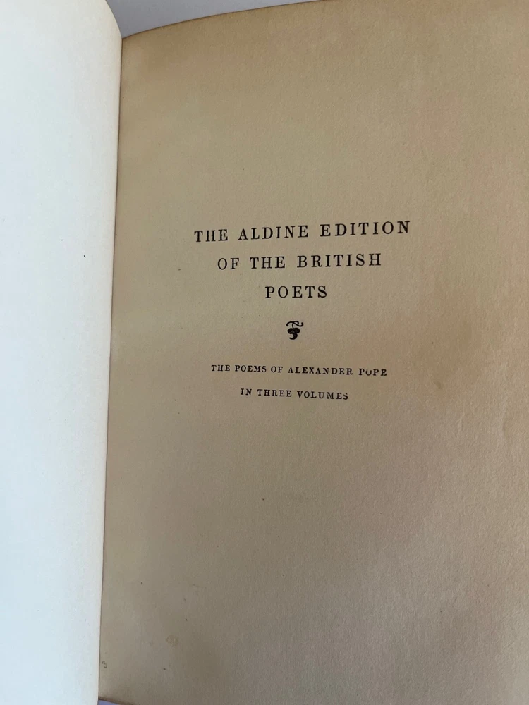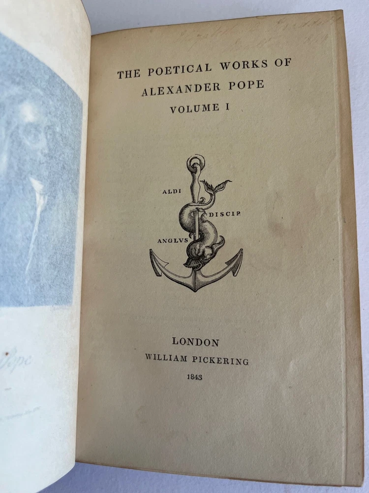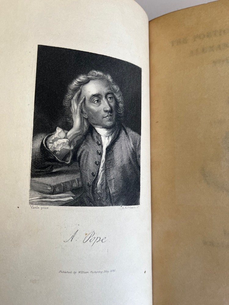 THE POETICAL WORKS OF ALEXANDER POPE London: William Pickering, 1843, 1844, 1844. Bound by Birdsall Northampton (printed small on bottom edge front blank endpaper) 3 volume set. Gilt titled decoration spines half leather hardcover; some scuffing fading to leather spine else covers lovely bindings tight; top edges gilt; marbled endpapers; ghost of owner name penned faint at the top of title pages; tissue guarded engraved portrait, Pickering's vignette anchor & dolphin device on title pages; Issued as part of the publisher's Aldine British Poets series. Contains a memoir of Pope by the Rev. Alexander Dyce.