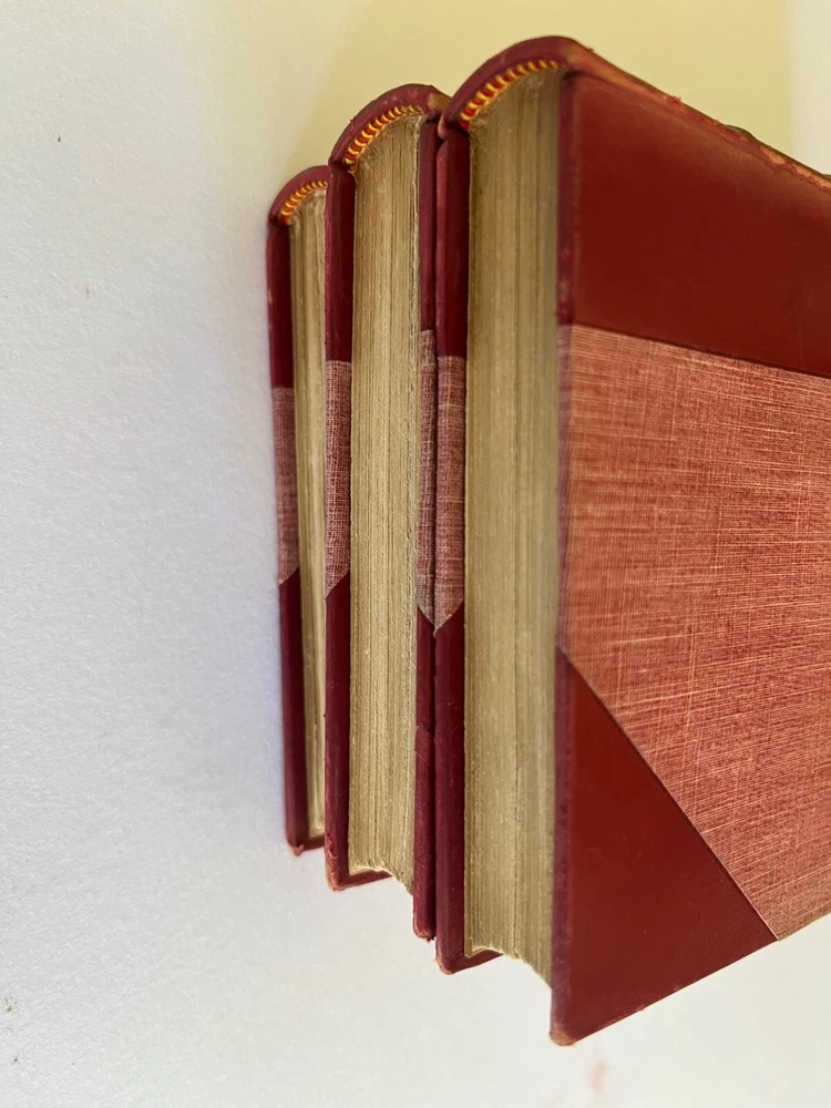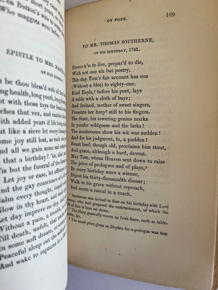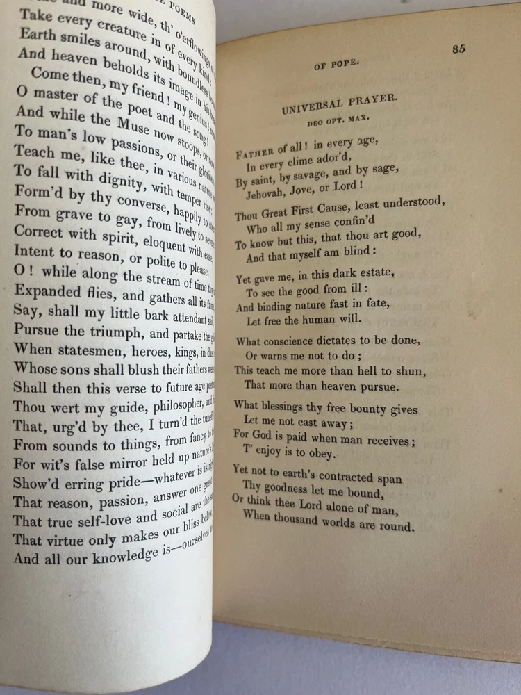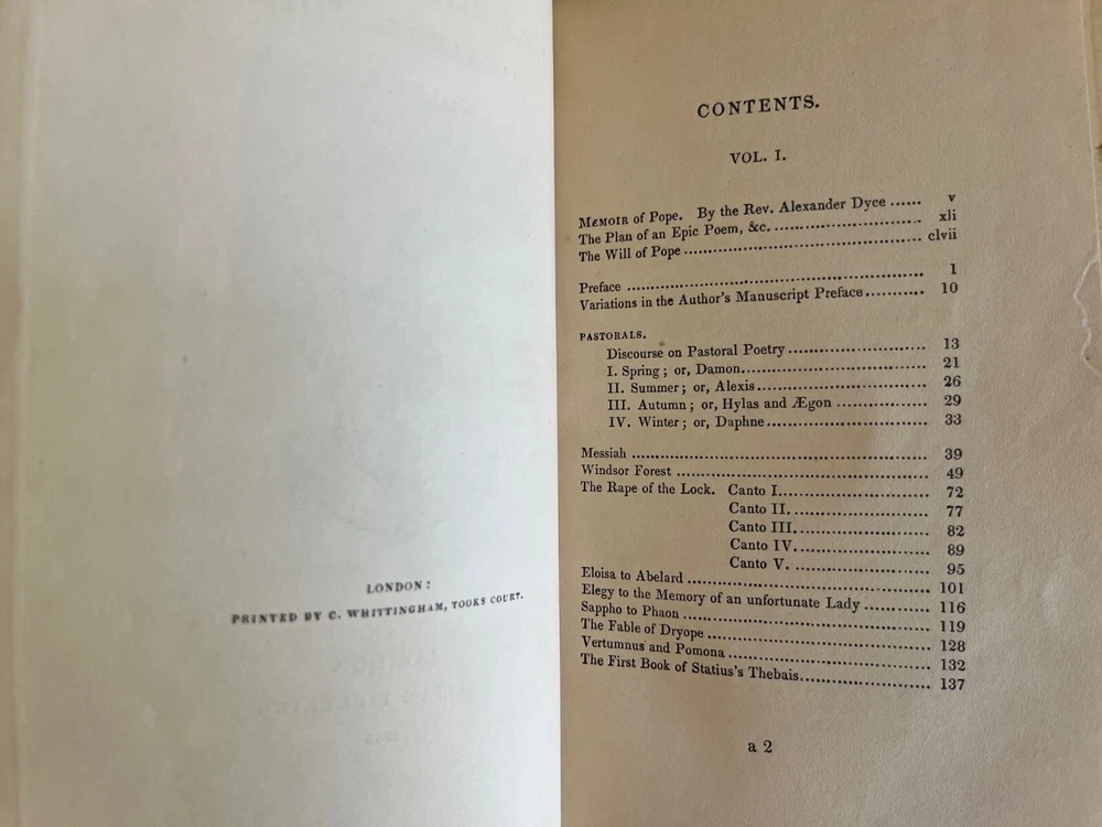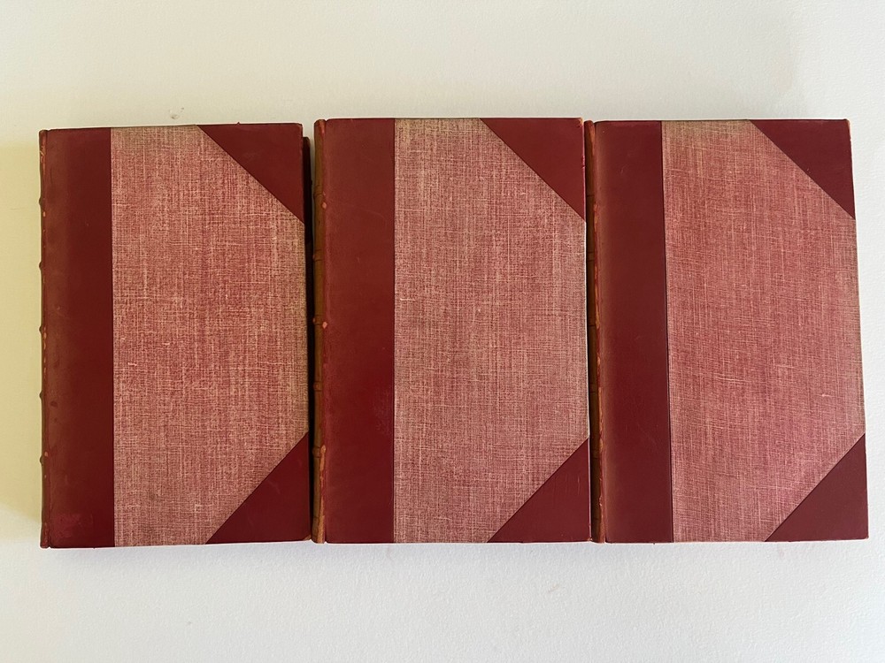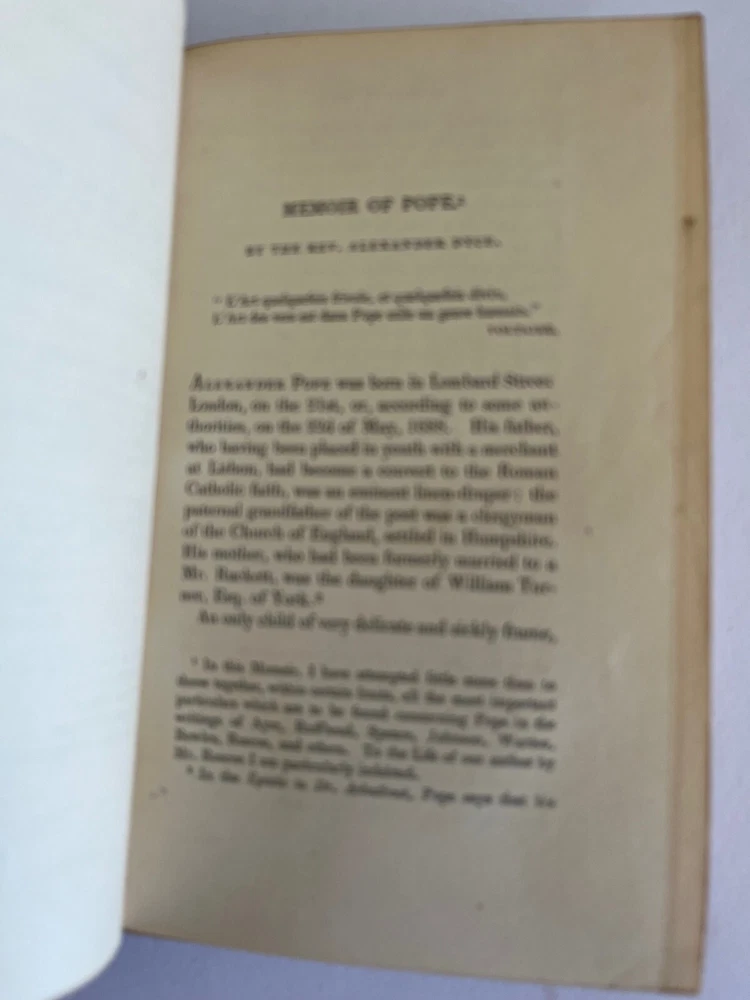 THE POETICAL WORKS OF ALEXANDER POPE London: William Pickering, 1843, 1844, 1844. Bound by Birdsall Northampton (printed small on bottom edge front blank endpaper) 3 volume set. Gilt titled decoration spines half leather hardcover; some scuffing fading to leather spine else covers lovely bindings tight; top edges gilt; marbled endpapers; ghost of owner name penned faint at the top of title pages; tissue guarded engraved portrait, Pickering's vignette anchor & dolphin device on title pages; Issued as part of the publisher's Aldine British Poets series. Contains a memoir of Pope by the Rev. Alexander Dyce.
