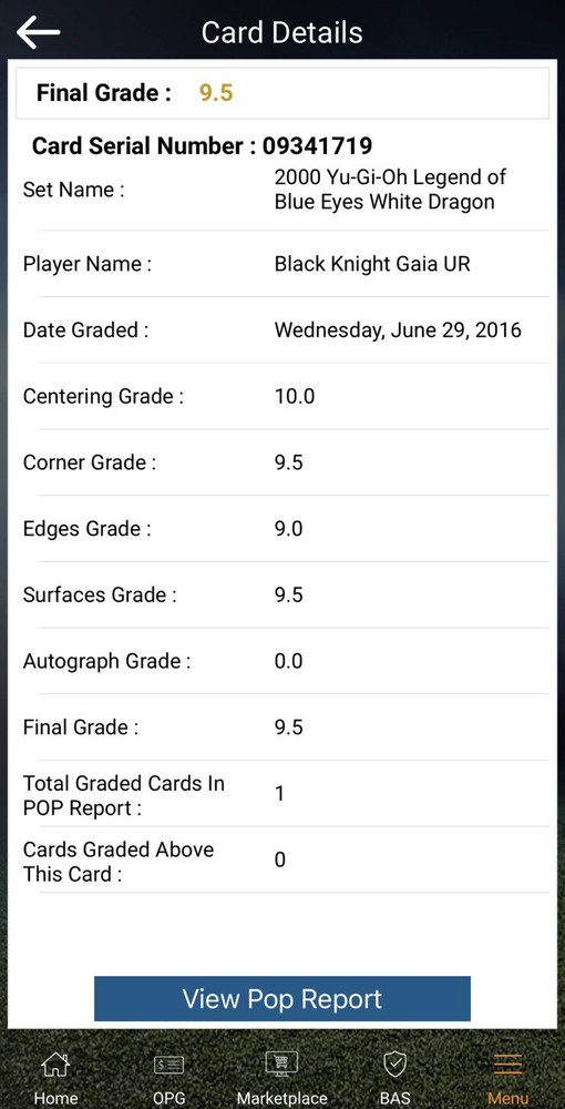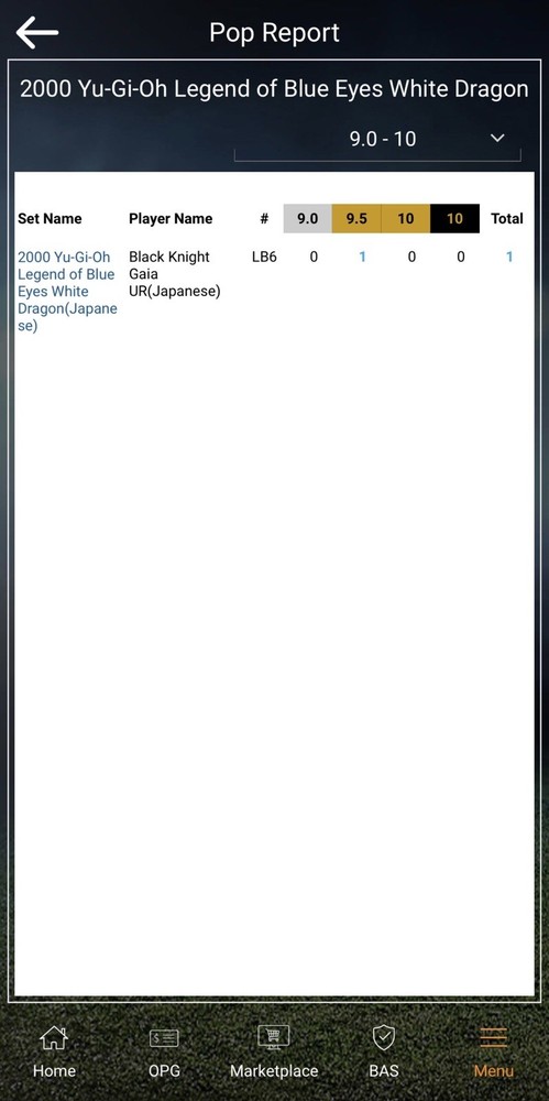 POP 1 BGS 9.5 Black Knight Gaia 2000 Yugioh 1st Edition Blue Eyes White Dragon POP 1, None Higher. It's been the case the whole time I've owned it. Truly special first edition card.