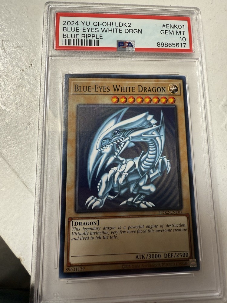Elevate your Yu-Gi-Oh! TCG collection with the iconic Blue-Eyes White Dragon card, a staple for players and collectors alike. This particular card, numbered LDK2-ENK01, has been meticulously graded by the Professional Sports Authenticator (PSA) and awarded a pristine grade of 10, signifying its exceptional quality and preservation. Crafted by the renowned game creator Konami, this card features the formidable dragon creature/monster type revered by gamers and the legendary Seto Kaiba character. Its standard card size fits seamlessly into any deck or display, and the card's attributes, including its white, blue, and light color scheme, make it a visually striking piece to own.