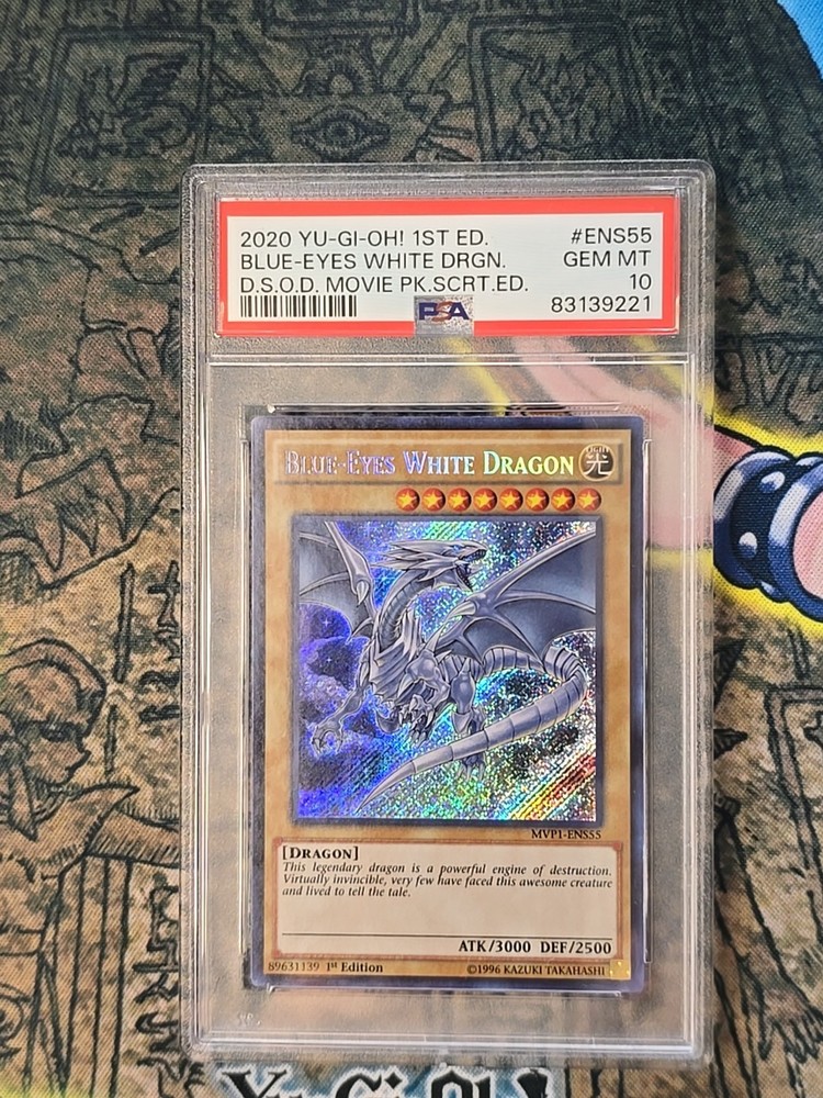 The PSA 10 GEM MT Blue-Eyes White Dragon MVP1-ENS55 DSOD Secret card is a highly sought-after collectible in the Yu-Gi-Oh! TCG. This English-language card features the character Seto Kaiba and belongs to the Light attribute. With a high attack power of 3000 and defense of 2500, this Normal-type card is a must-have for fans and collectors alike. Manufactured by Konami in 2020, this Secret Rare card is part of The Dark Side of Dimensions Movie Pack Secret Edition and showcases a dragon creature type with a holo finish.