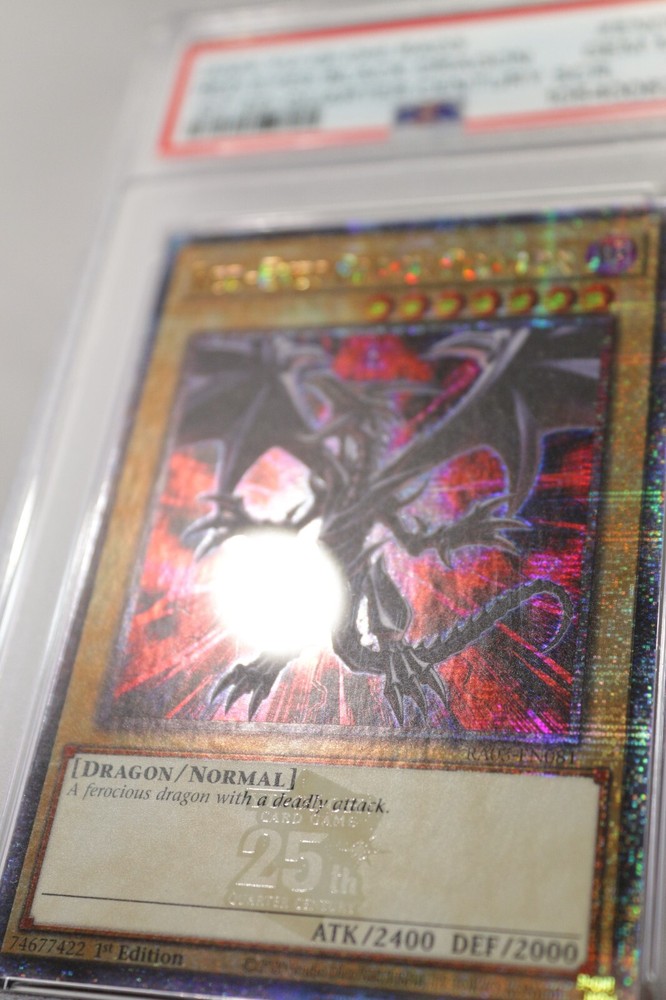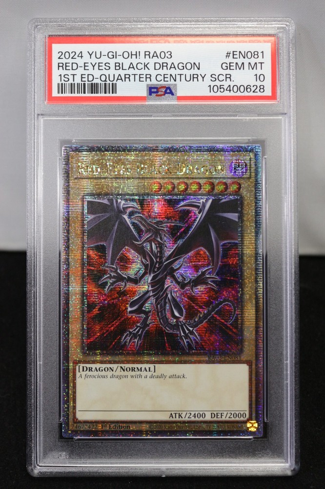 *Card in image is the EXACT card you get* Card name: Red-Eyes Black Dragon Card Number: RA03-EN081 Condition/Grade: PSA GEM MINT 10 PSA #: 105400628 Set: Quarter Century Bonanza Rarity: Quarter Century Secret Rare Language: English Edition: 1st Edition FOR COMBINED SHIPPING: If item is listed with 99c shipping, each additional item is only 25 cents more, not 99c. (ex. if you buy 2 items with $0.99 shipping, the final shipping cost will be $1.24) *WE ARE NOT RESPONSIBLE FOR USPS POSTAL SERVICE