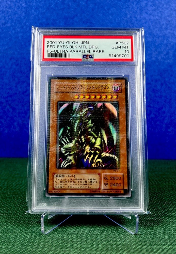 This rare Japanese Red-Eyes Black Metal Dragon card from the Ultra Parallel set is a must-have for any serious Yu-Gi-Oh! TCG collector. The card features a stunning full art design with a holographic finish, making it a standout addition to any collection. The card is in excellent condition, with no autographs or vintage damage. It has been graded as a 10 Gem Mint by the Professional Sports Authenticator (PSA). The card comes with a speciality of Yugioh, set of Ultra Parallel, character of Red-Eyes Black Metal Dragon, grade of 10, year manufactured of 2001, vintage of yes, and is grader as yes. The card is in Japanese language and was manufactured in Japan by Konami. Don't miss out on the chance to add this rare and valuable card to your collection!