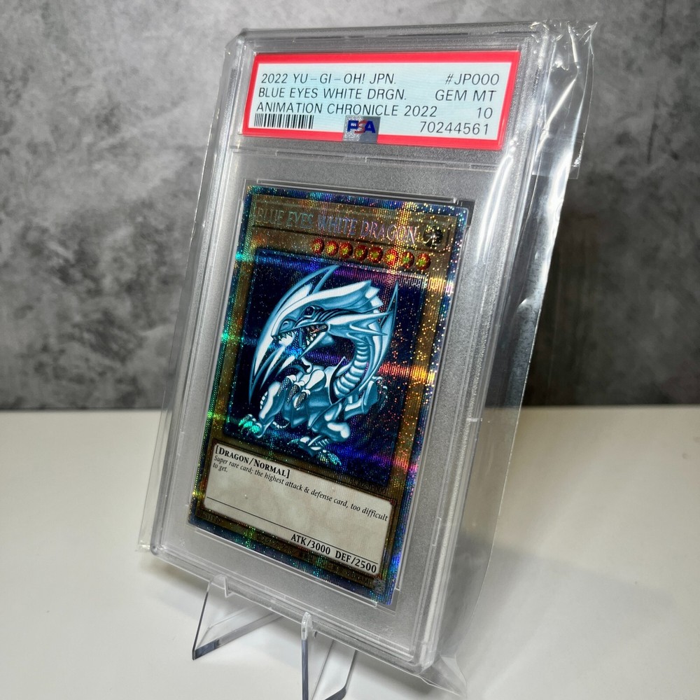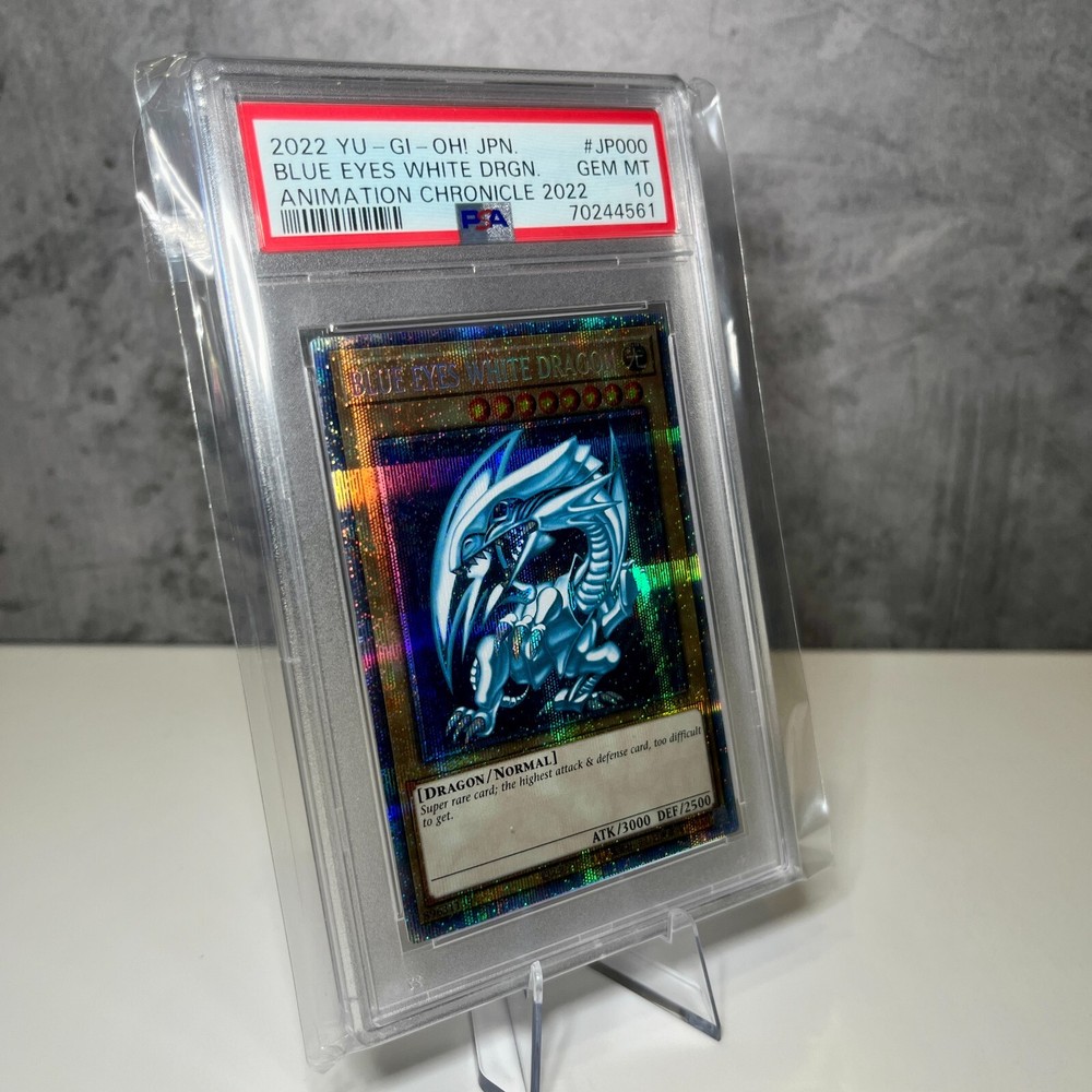 The product is a PSA 10 graded Yu-Gi-Oh! card featuring the iconic Blue Eyes White Dragon from the Animation Chronicle set AC02-JP000 in Japanese. This Prismatic Secret Rare card is a Monster type with an impressive Defense/Toughness of 2500 and Attack/Power of 3000. Manufactured by Konami in Japan in 2022, the card is made of paper with a Holo finish, making it a highly sought-after collectible for fans of the Yu-Gi-Oh! Trading Card Game. YOU WILL GET (1) PSA 10 Yu-Gi-Oh! Blue Eyes White Dragon Animation Chronicle AC02-JP000 Japanese All sales for psa cards are final, so before purchasing please check all the photos beforehand! No returns on any psa cards. No returns will be allowed since this is an as is sale and the grading is based on a third parties judgment, not my own.