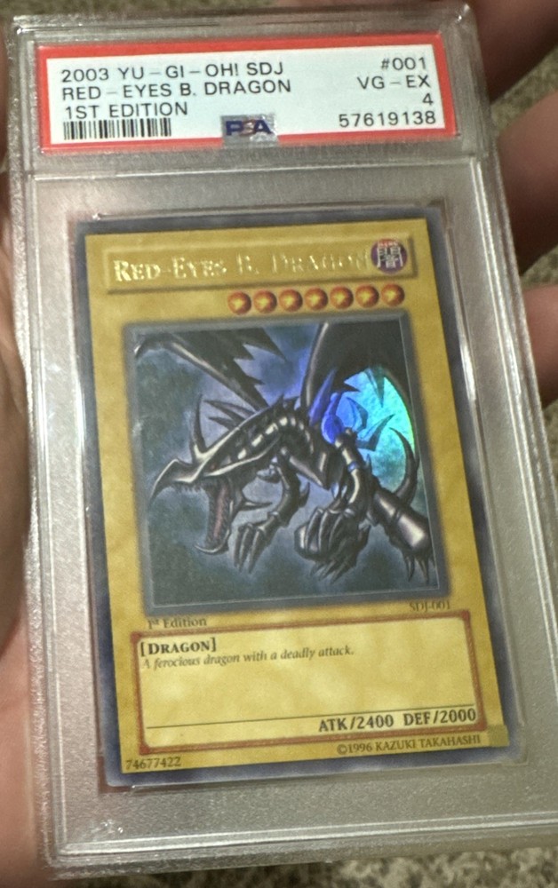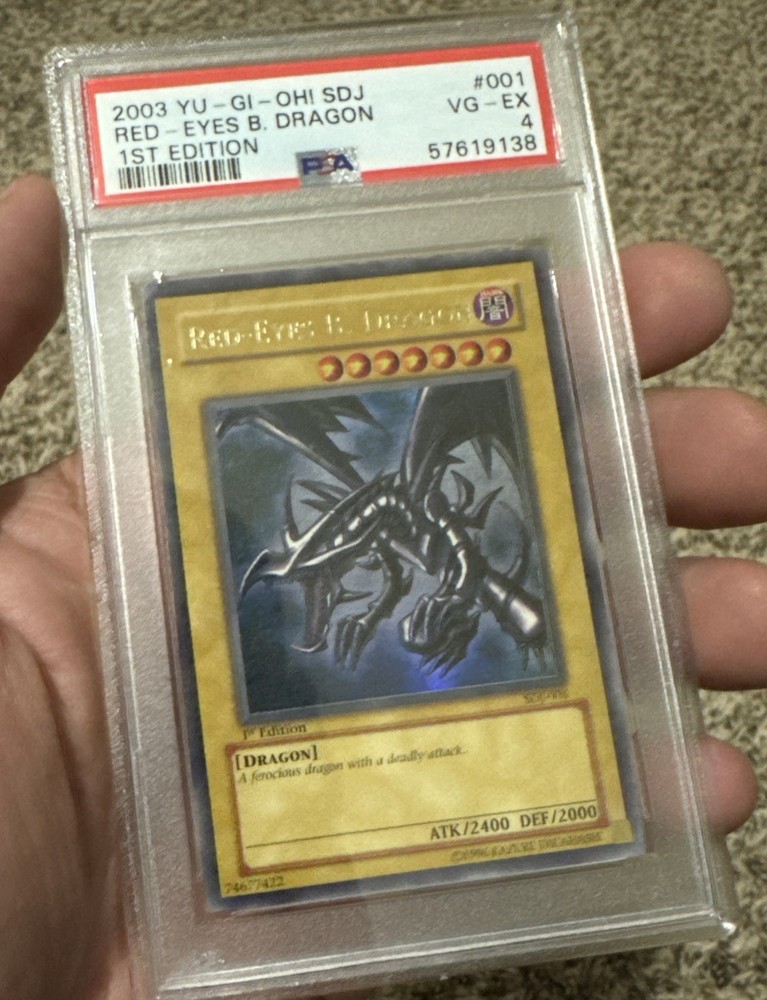 The product is a rare 2003 1st Edition Red-Eyes B. Dragon card from the Yu-Gi-Oh! TCG. This vintage card features the iconic Red-Eyes Black Dragon creature type, manufactured in the year 2003 as part of the Yugi set. It is a highly collectible item for fans of Yu-Gi-Oh! and card game enthusiasts alike, making it a valuable addition to any collection.