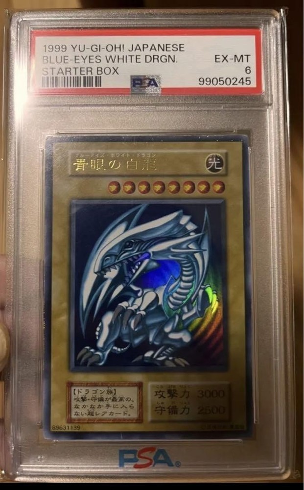 This is an amazing piece of Yu-Gi-Oh! history—a pristine PSA 6 Blue-Eyes White Dragon Starter Box EX straight from 1999! Shipping from Japan was smooth, and the packaging was secure. The card’s condition is exactly as described, making it a must-have for collectors. Just be aware of potential import fees. Highly recommended for fans of the classic era!