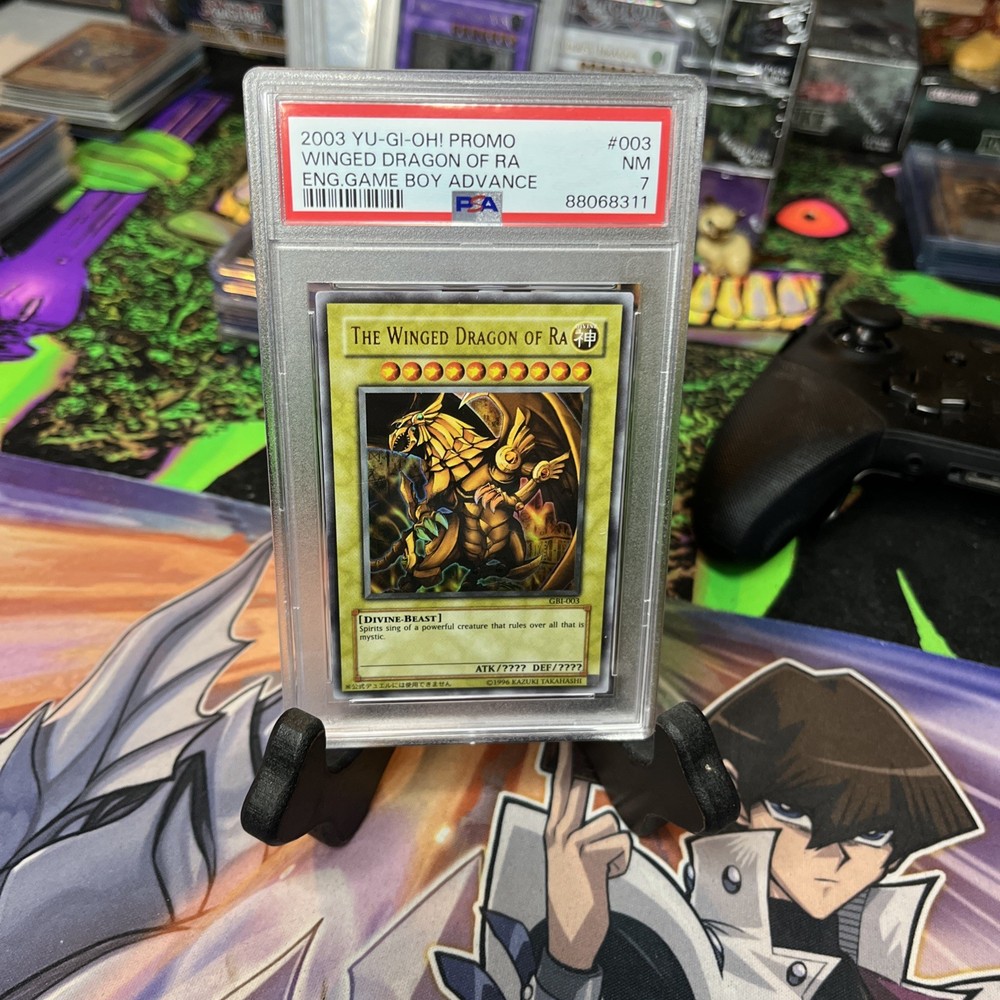 The PSA 7 Winged Dragon of Ra GBI-003 Ultra Rare Promo Game Boy Advanced card is a highly sought-after collectible in the world of Yu-Gi-Oh! TCG. This limited edition card features the powerful monster The Winged Dragon of Ra, and is part of the Yu-Gi-Oh! Duel Monsters International: Worldwide Edition set. The card is graded by Professional Sports Authenticator (PSA) and is considered a valuable addition to any collector's deck. With its exclusive features and vintage appeal, this card is a must-have for fans of the game.